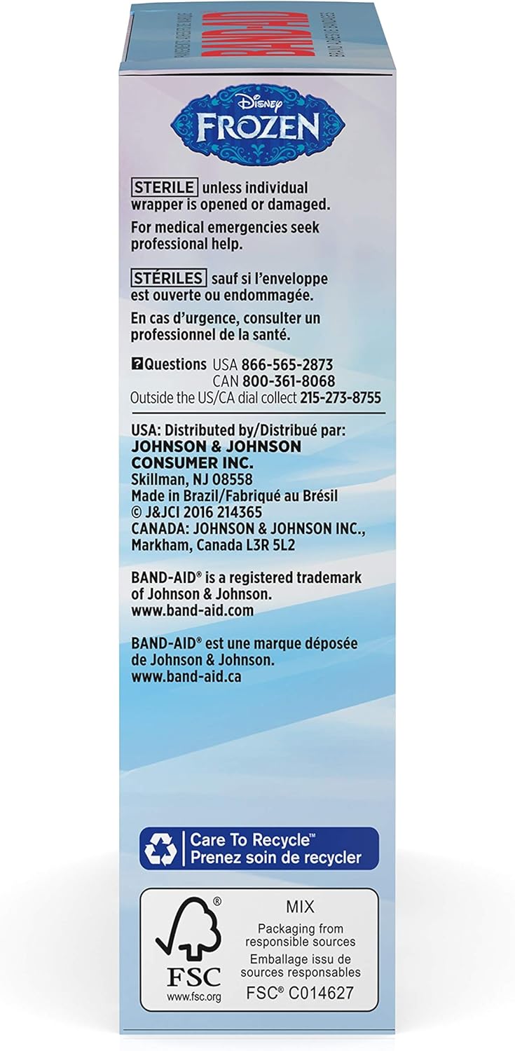 Band-Aid Brand Adhesive Bandages for kids, featuring Disney Frozen designs, cover and protect minor cuts and scrapes with fun Disney Frozen graphics. These sterile bandages come in assorted sizes with designs that include Elsa, Anna, Olaf, and others. Band-Aid Brand Adhesive Bandages stick to the skin, not the wound. This package contains 20 sterile bandages in assorted sizes suitable for small wounds.