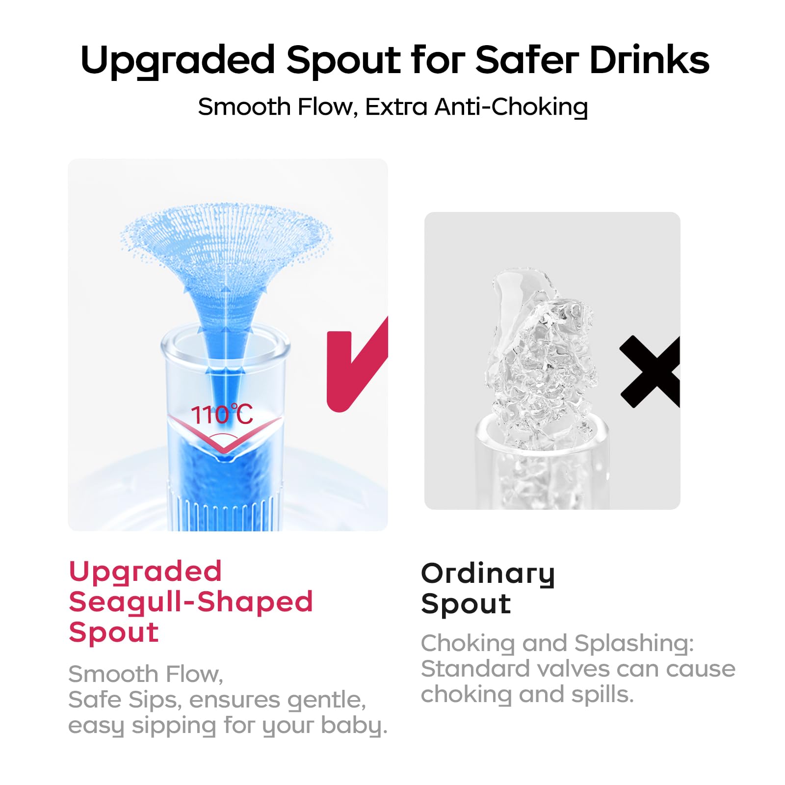 - 【Patented Safety Using】The V-shape of the valve on the toddler cup helps control the flow of water. As the child sucks on the straw, the water flows out at a controlled rate. This can help prevent choking or coughing. The controlled flow of water can also help develop a child's oral motor skills, as they must suck on the spout to release the water.