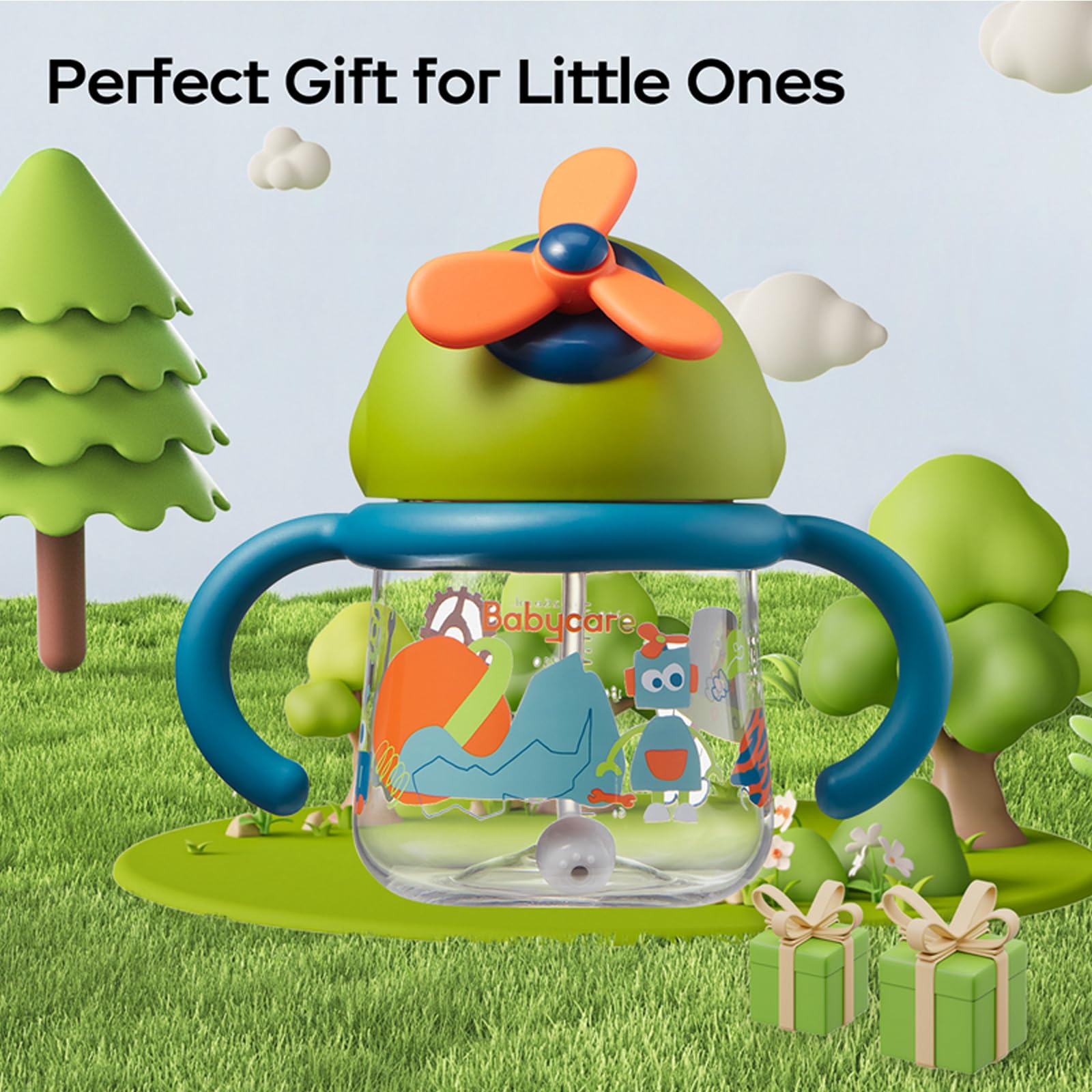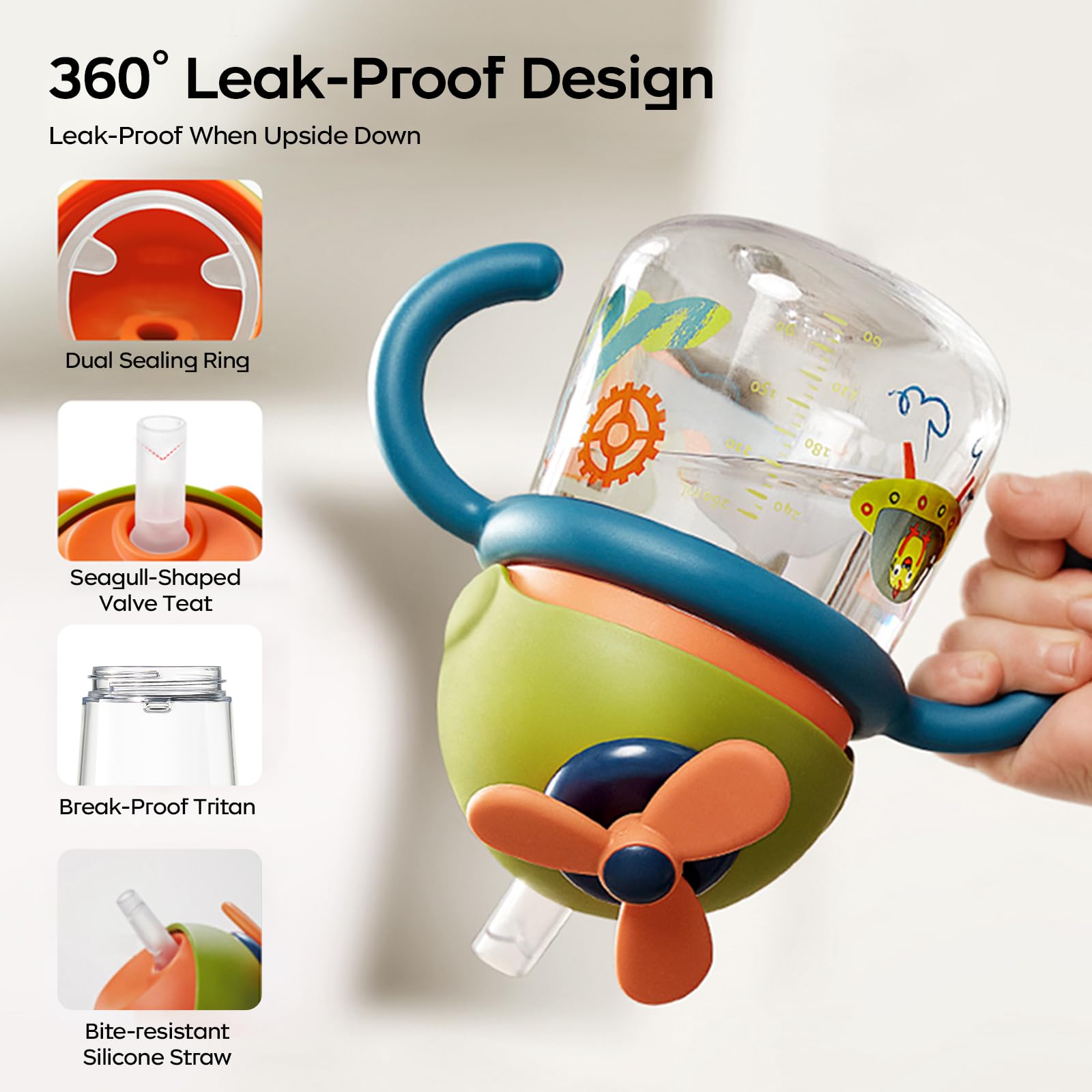 - 【A Unique Design】It is a very unique and creative design for sippy cup! The windmill on the lid is an interesting toy that can attract baby's attention and make drinking from the cup a more enjoyable experience. In addition, the windmill design can also help develop a baby's motor skills and hand-eye coordination as they try to turn the windmill.