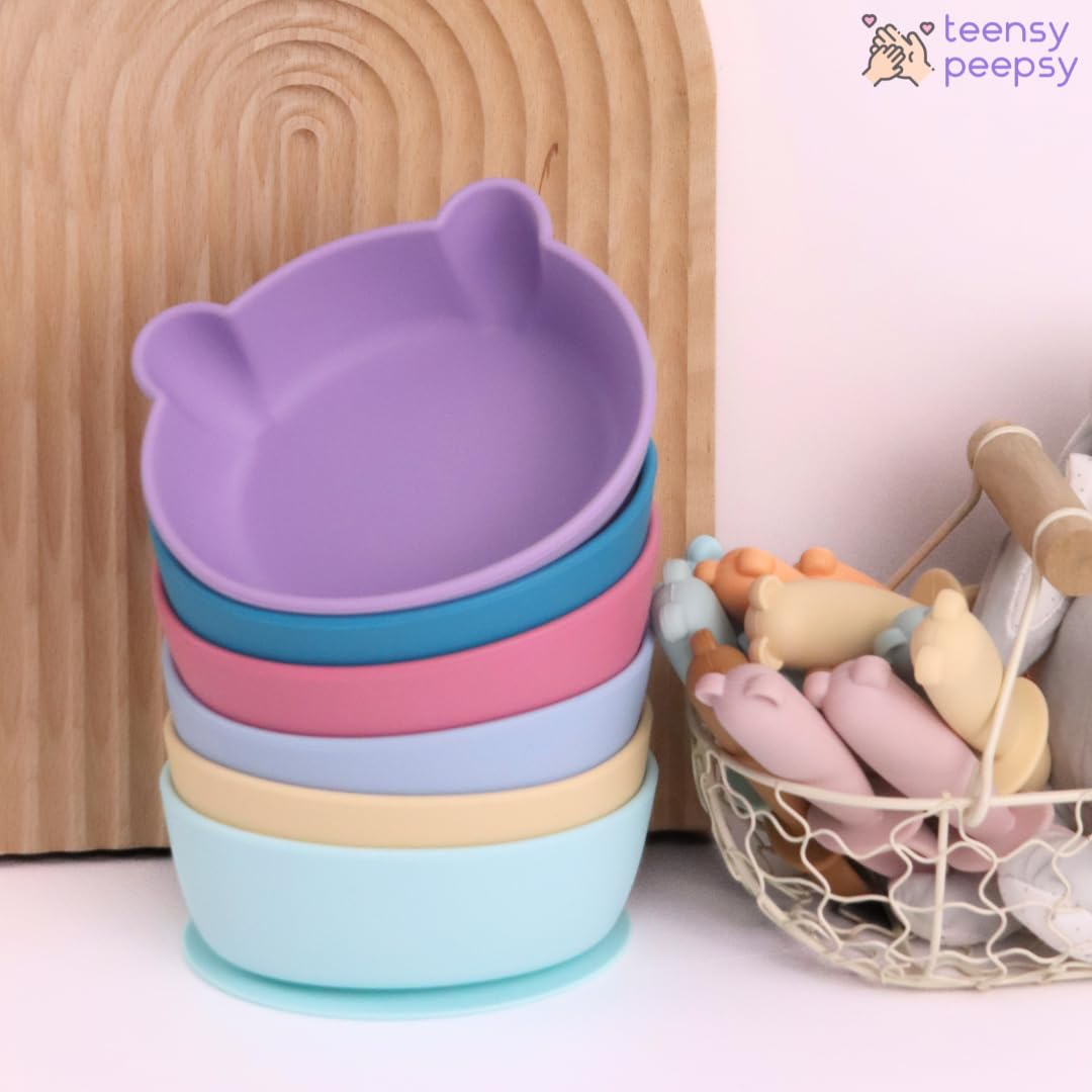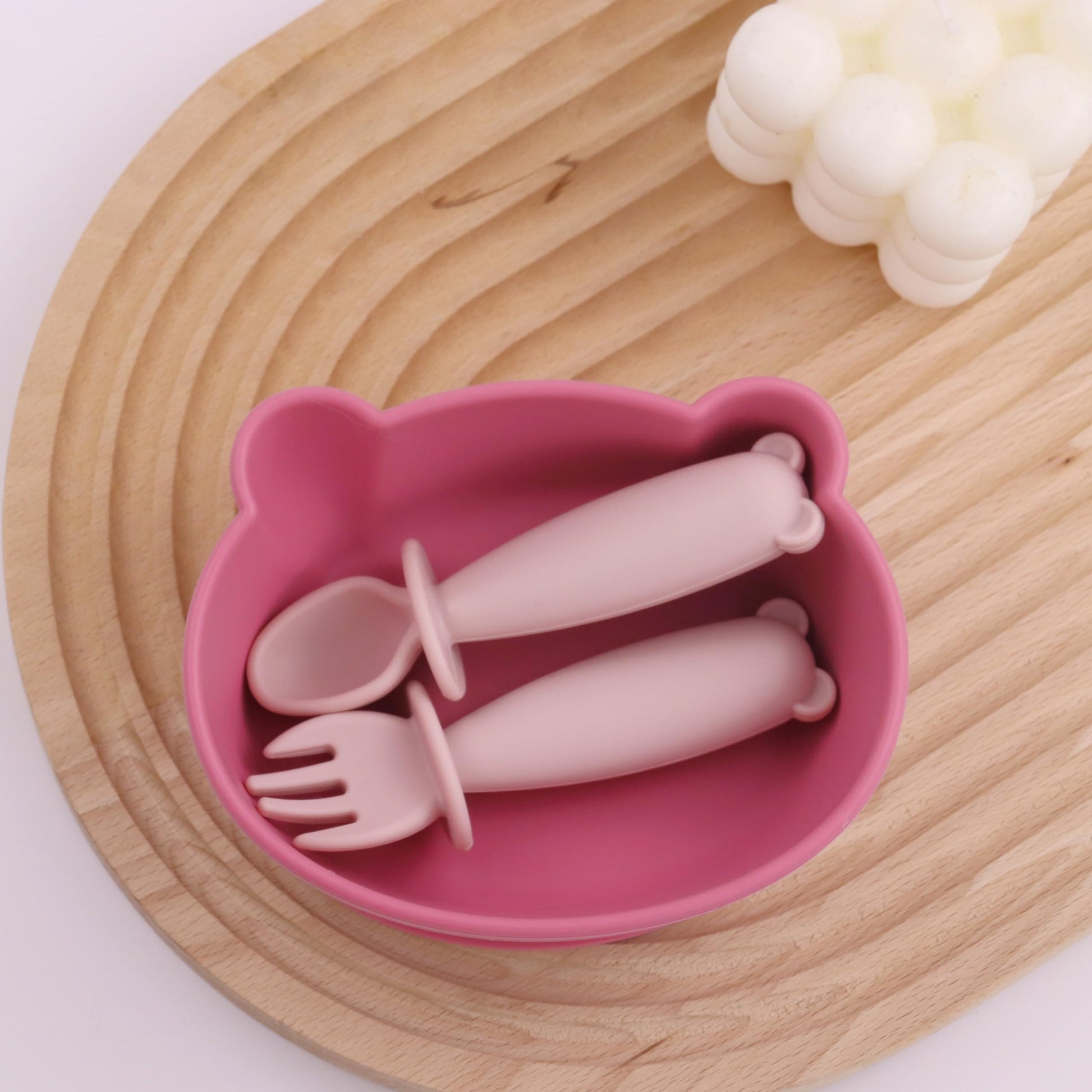 Bear Silicone Baby Bowl Suction Baby Spoon and Fork for Babies 6 months+ Suction Bowls for Baby Utensils 6-12M+ BLW Essentials (Peach Lilac)