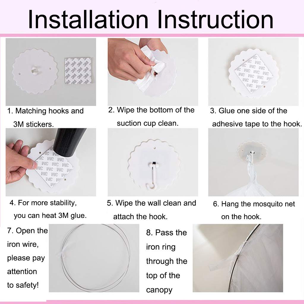 - ♥EASY INSTALLATION:Size 240cm/94.5Inch. Installation is simple, with installation instructions. The package is equipped with a hook and 3M sticker. Just pass the iron ring through the mosquito net to make it round, and then hang it on a clean roof. It is easy to disassemble and easy to clean.