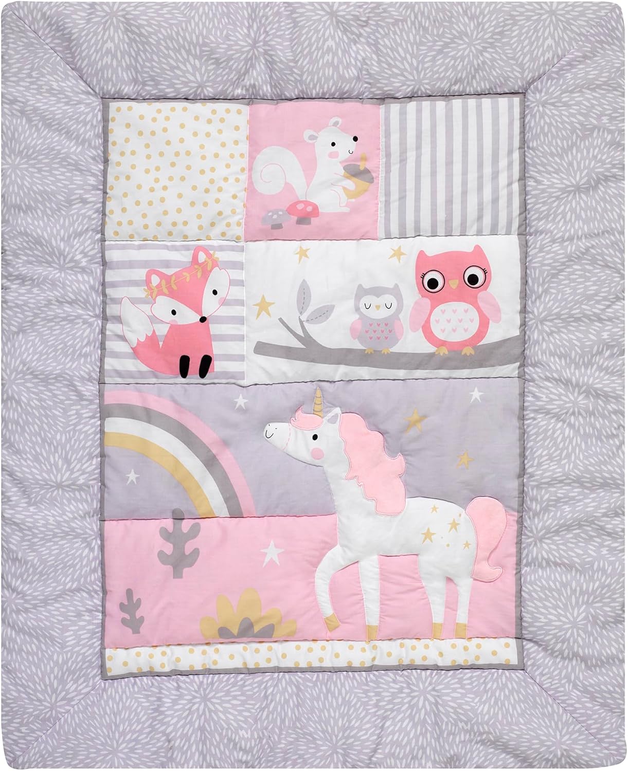 - This 4-piece set includes one quilt, one fitted crib sheet, one crib skirt and one plush unicorn