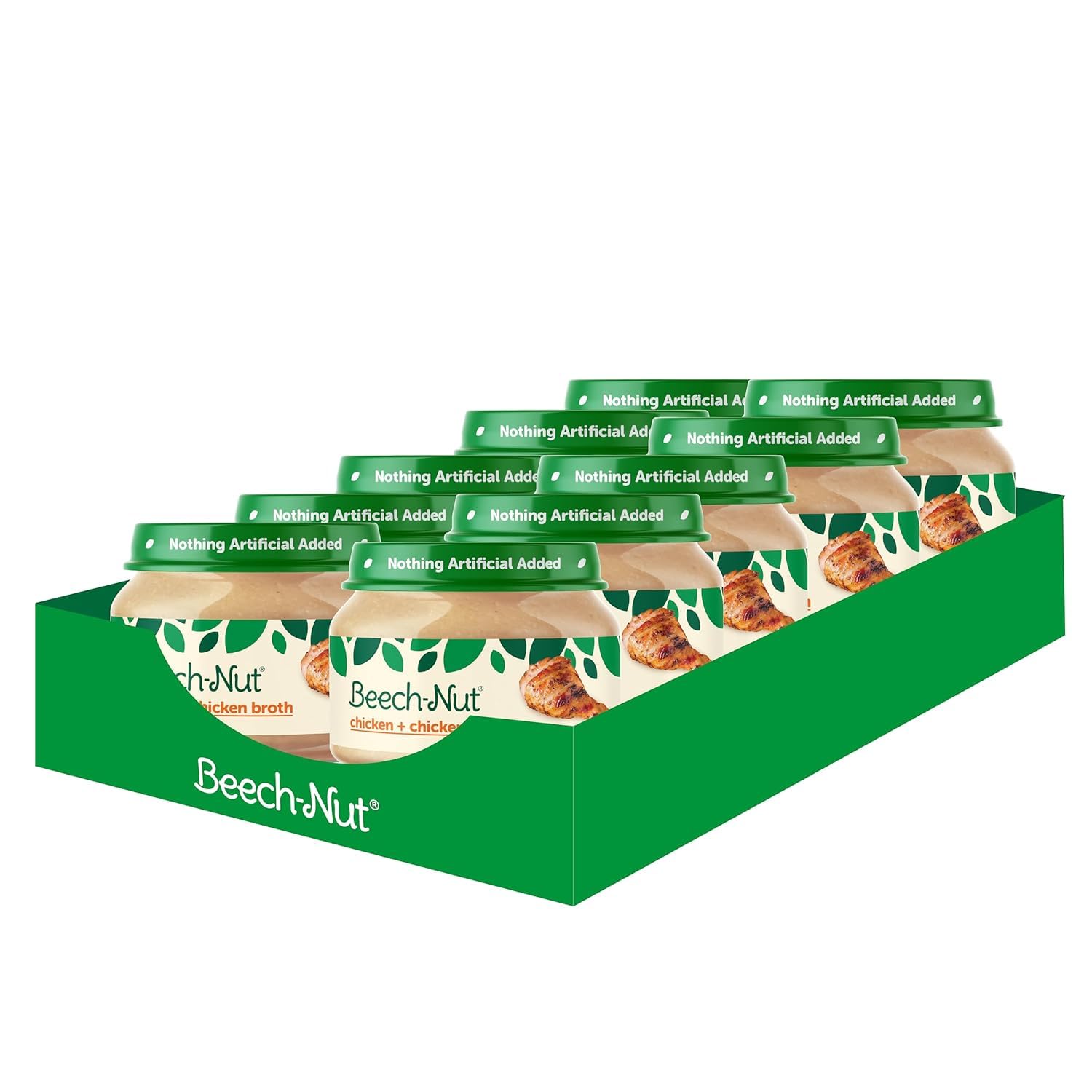 Beech-Nut Meat Baby Food Jars, Chicken & Chicken Broth Puree, 7g Protein, Stage 1 Baby Food for Babies 4 Months and Up, 2.5oz Glass Jars, 10ct