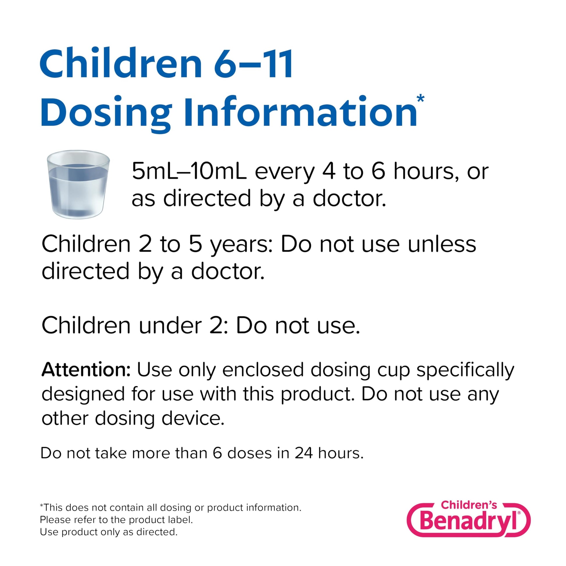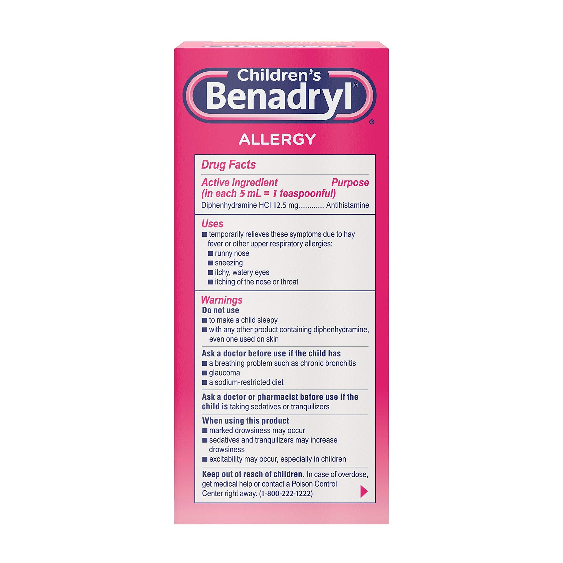 - ALLERGY RELIEF MEDICATION: [Size Variant]-fluid ounces of Children's Benadryl Dye-Free Allergy Liquid Medicine in bubble gum flavor is specially formulated to provide temporary relief of allergy symptoms caused by hay fever and other upper respiratory allergies