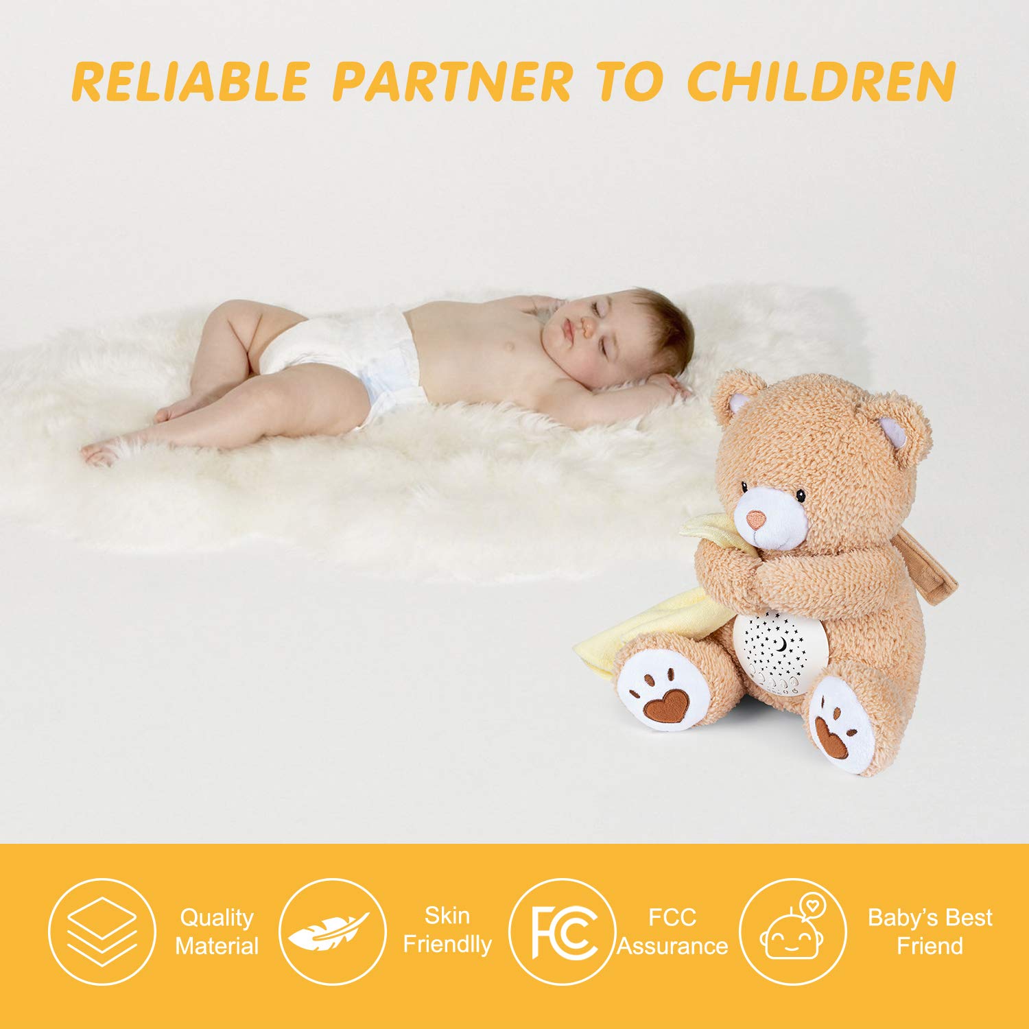 Covering the attached blanket over the teddy’s tummy makes it a soft night light. Provide a comforting, dreamlike atmosphere for sleeping, make baby feel relaxed in the dark night, also offers a gentle glowing light to check on baby at darkness.