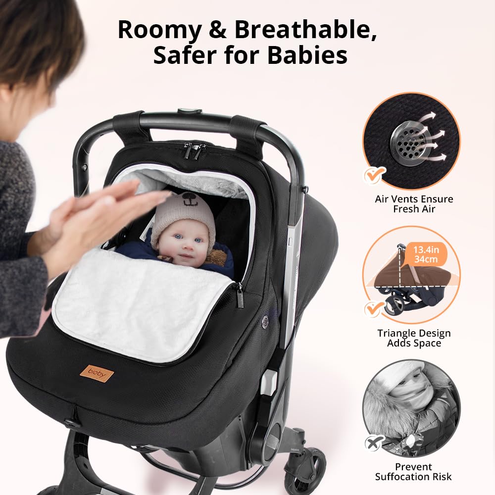 Bioby Winter Baby Car Seat Cover, Infant Car Seat Cover for Boy Girl, Roomy, Cozy, Warm, Waterproof Baby Carseat Covers Canopy with Thickened Fleece Lining, Breathable Hole, Universal Fitted Black