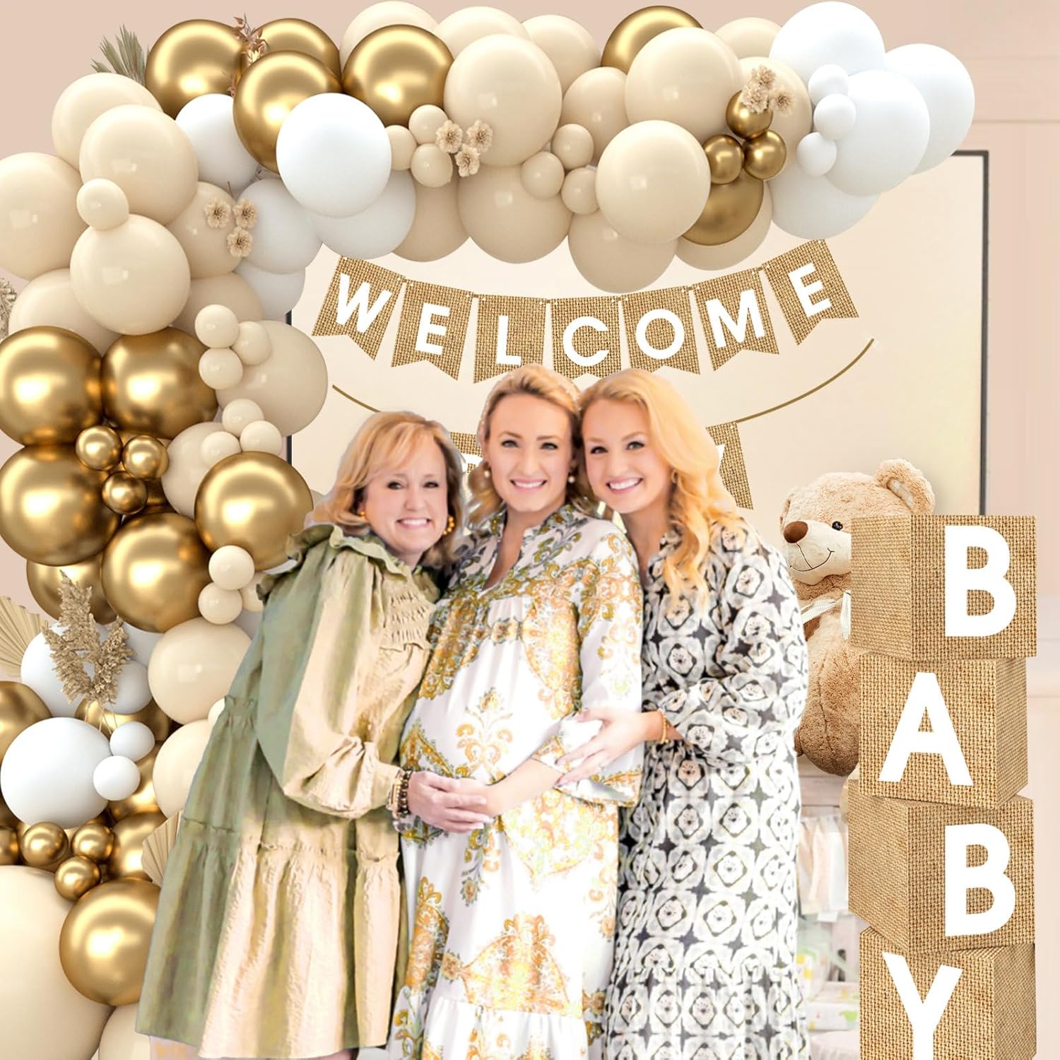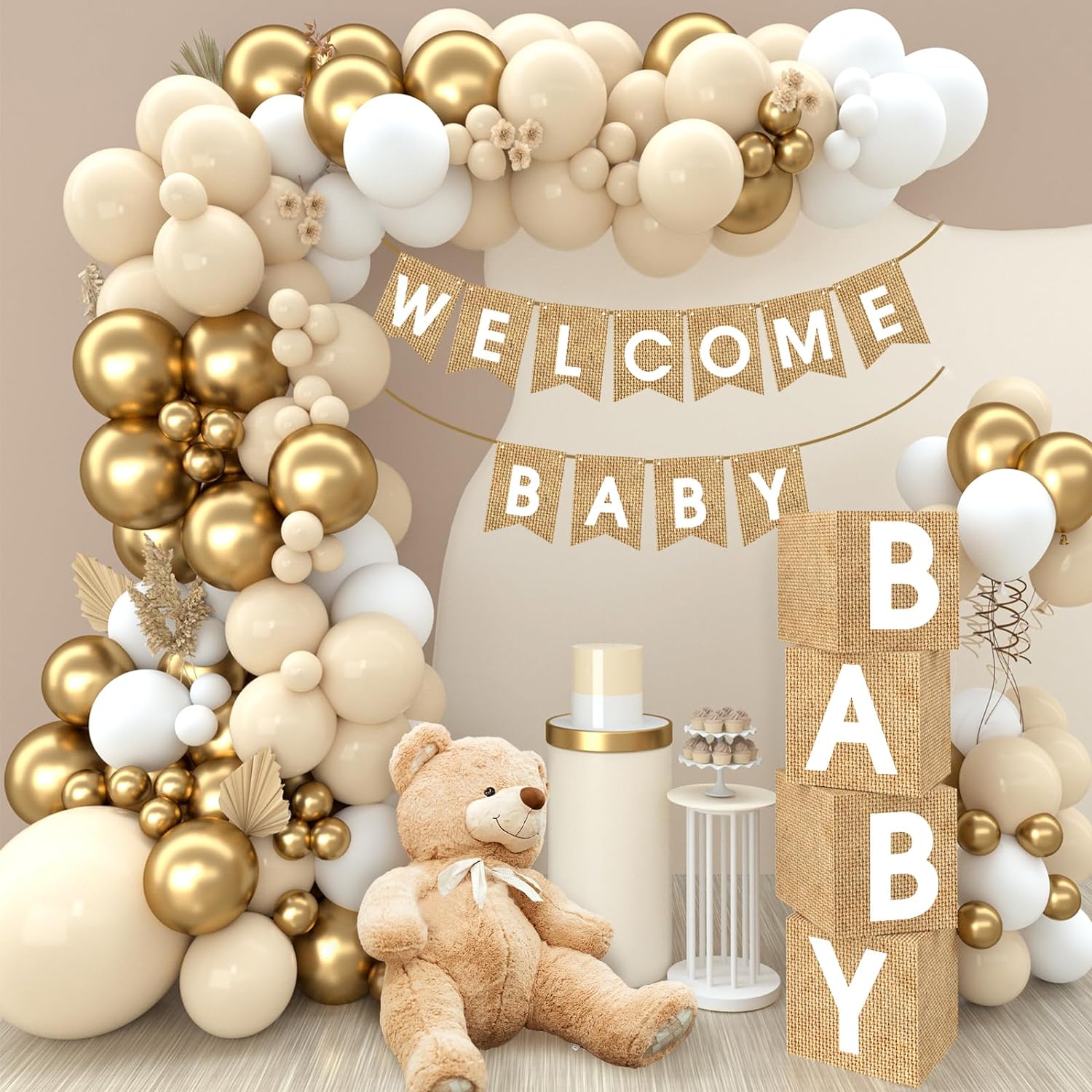 - Premium Material-Neutral baby shower boxes and "WELCOME BABY" banner are made of sturdy paper and other non-toxic materials.Our nude and gold balloons garland kit are made of high quality natural latex,safe and non-toxic,the leather is thick, not easy to burst,and the color is true