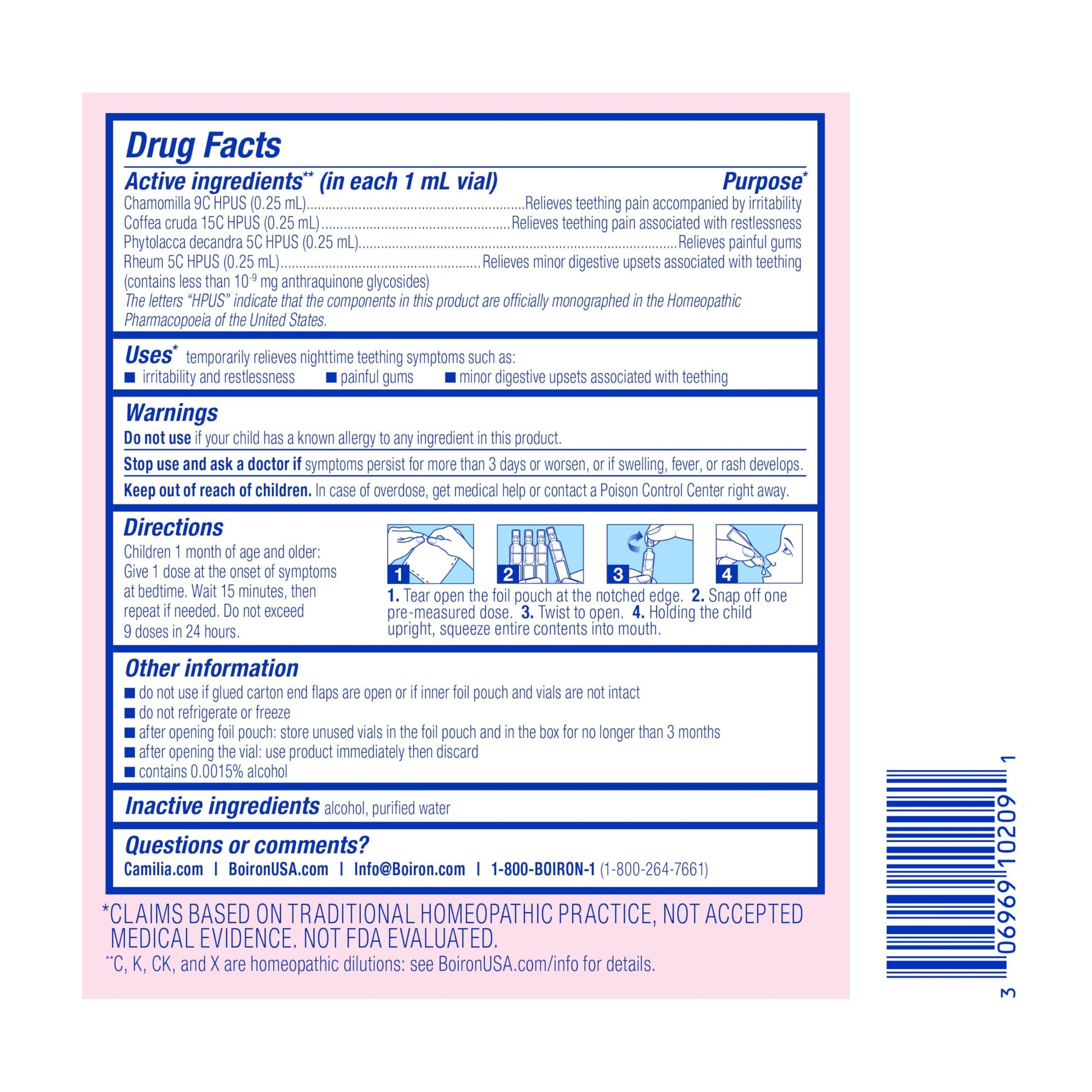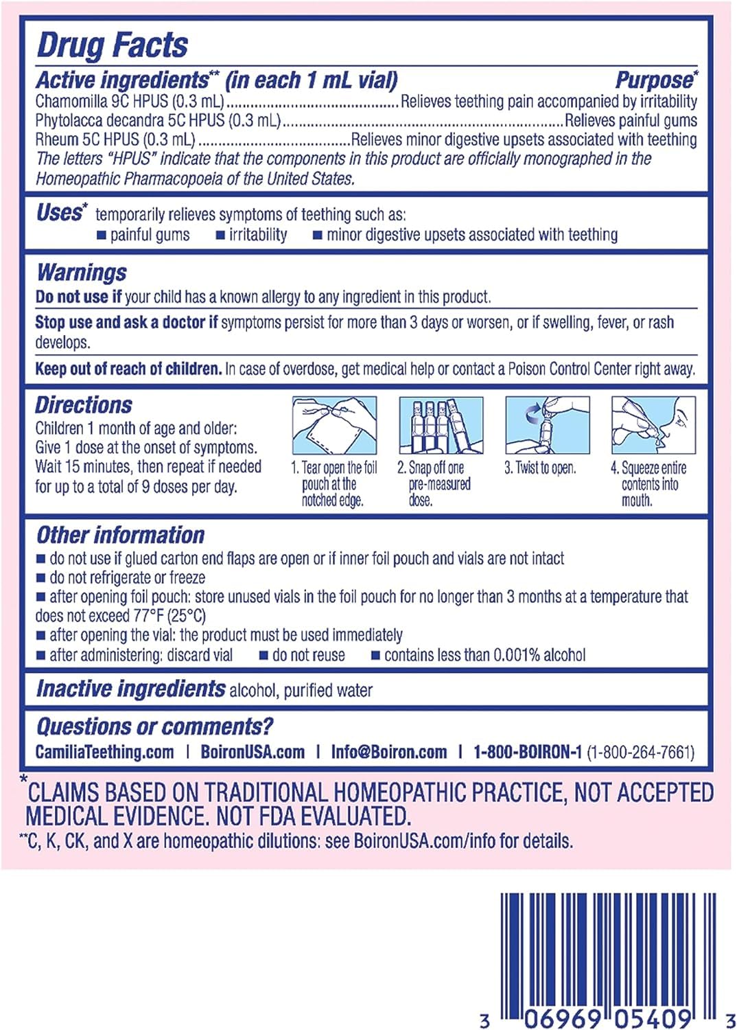 Camilia Teething Relief Product Description Boiron Camilia Teething Relief can be used as a first-line of treatment for baby teething. The tasteless solution is absorbed sublingually without numbing the gums or affecting the gag reflex. The active ingredients act on the different components of the symptomatology to provide quick and safe relief. Camilia combines in one single form active ingredients to relieve immediate pain, irritability and minor digestive disorders. The symptoms of teething are not limited to inflamed and painful gums, but often include restlessness, excessive chewing and digestive disorders. These symptoms usually resolve spontaneously once the tooth has pierced the gum lineSterile single-use oral doses Safe, natural and easy to use Active Ingredients Chamomilla 9C, Phytolacca decandra 5C, Rheum 5CInactive Ingredients Purified water No side effects No risk of overmedicating No numbing of gag reflex Does not mask other symptoms No sugar or lactose Preservative Free Sterile single use doses Worry-freeWarnings: Keep out of reach of children. As with all dietary supplements, consult your healthcare professional before use. See product label for more information. Stop use and ask a doctor if symptoms persist for more then 3 days or worsen or if inflammation, fever or rash develops. After administrating, discard single-use container. Do not reuse. Use only if glued end flaps on carton are sealed and single-use container is intact.