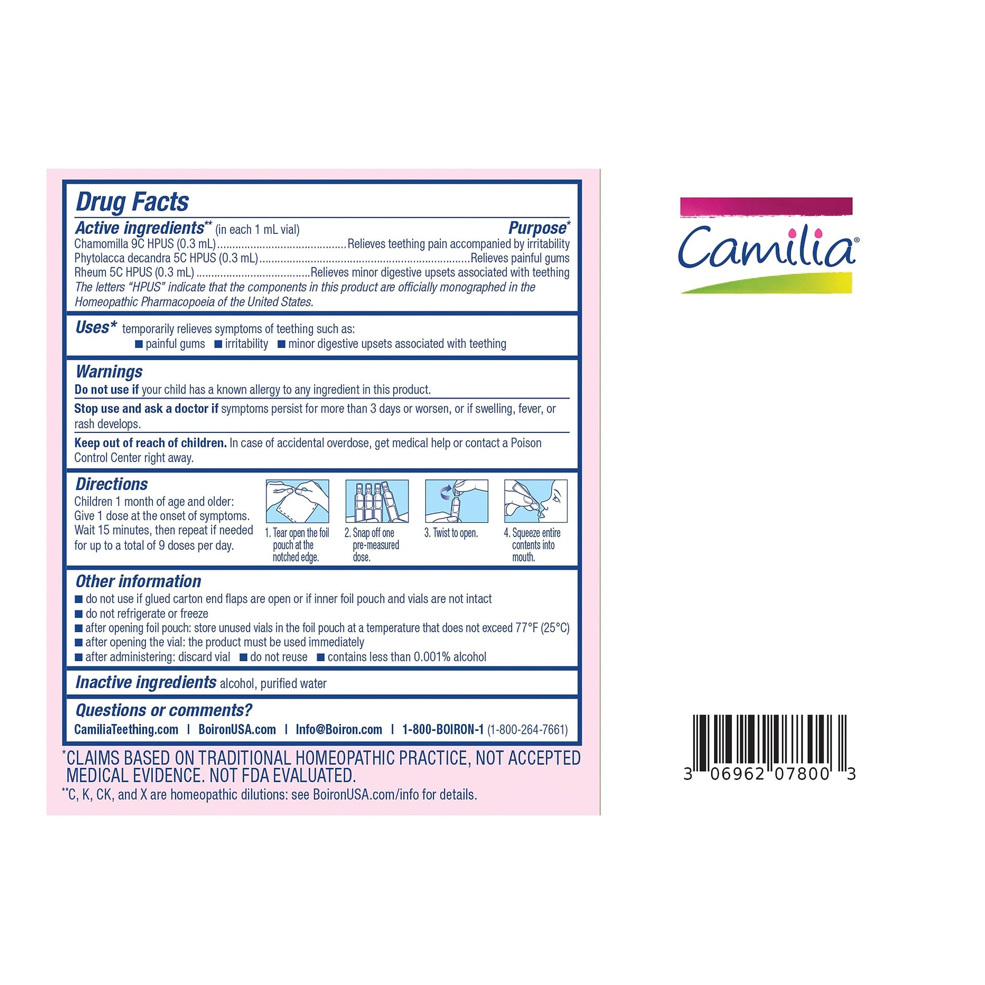 - Camilia's natural active ingredients include Chamomilla 9C HPUS (Relieves teething pain accompanied by irritability), Phytolacca decondra 5C HPUS (Relieves painful gums) and Rheum 5C HPUS (Relieves minor digestive disorders associated with teething).