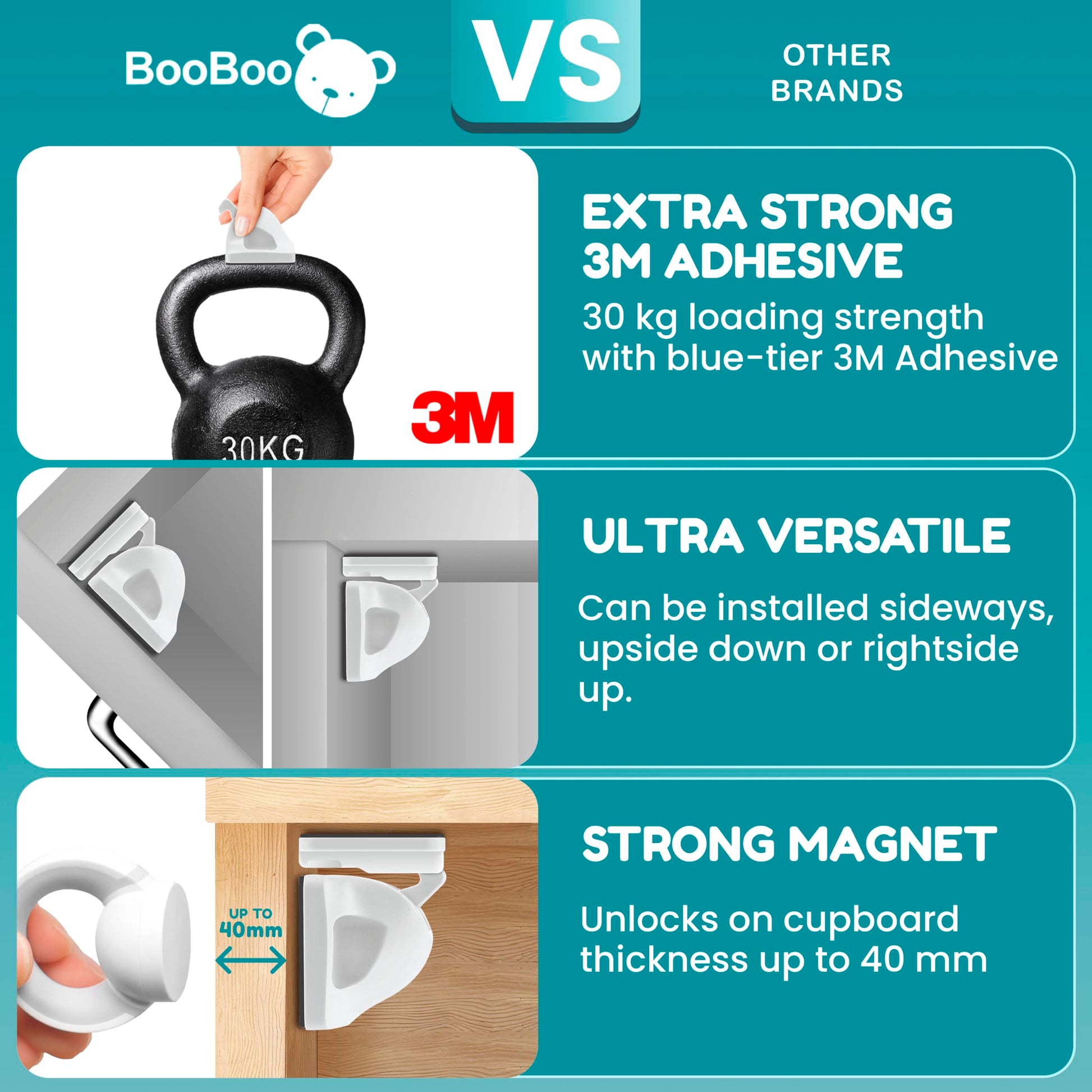 - US AWARD-WINNING BRAND - BooBoo: Ensure your child's safety with our US-designed, award-winning invisible cupboard lock. BooBoo uses super strong premium 3M adhesive, making it up to five times stronger than other brands, effectively keeping your children out of kitchen cupboards, cabinets, drawers, and more. With over x500,000 BooBoo locks sold worldwide, we are experts in safety!
