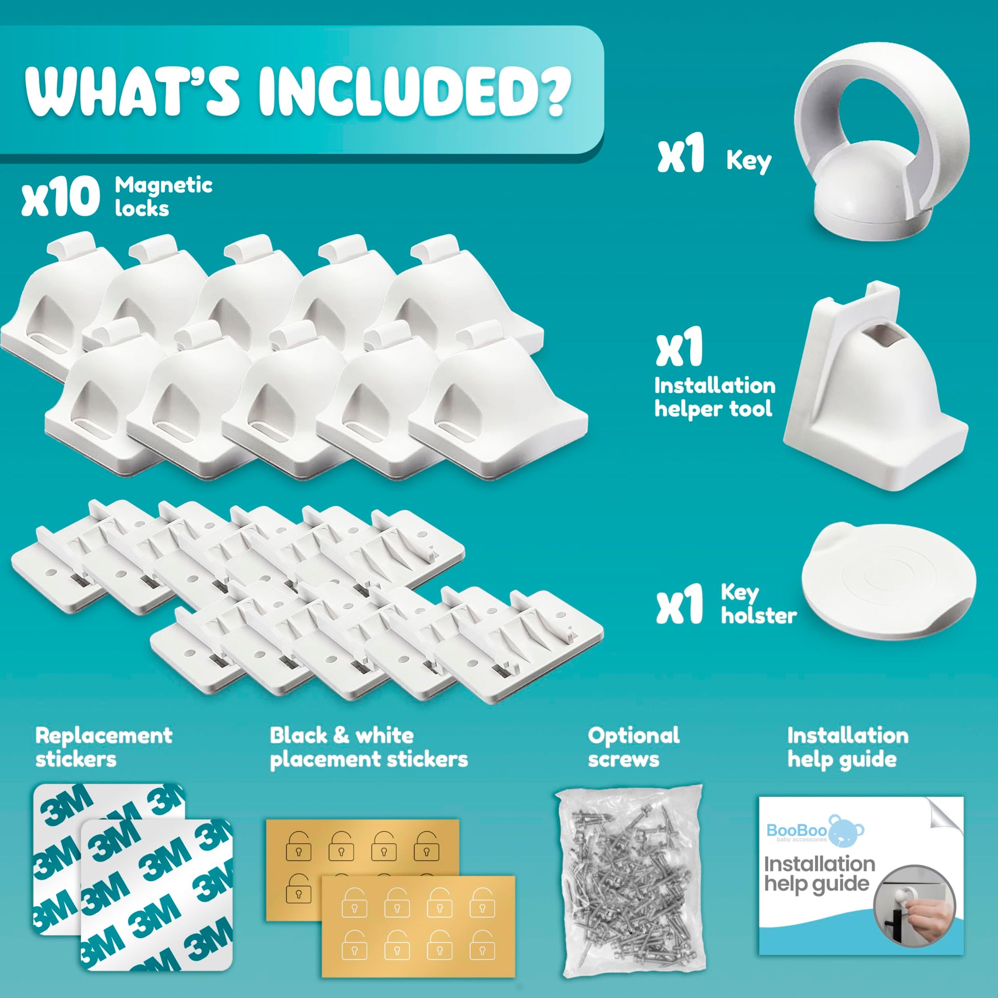 Booboo® Magnetic Child Safety Cupboard Locks for Children x10 Locks + x1 Key, Baby Proofing for Kitchen, Cabinets and Drawers, 30 Second Install No Drilling 3M Adhesive (10 Pack)