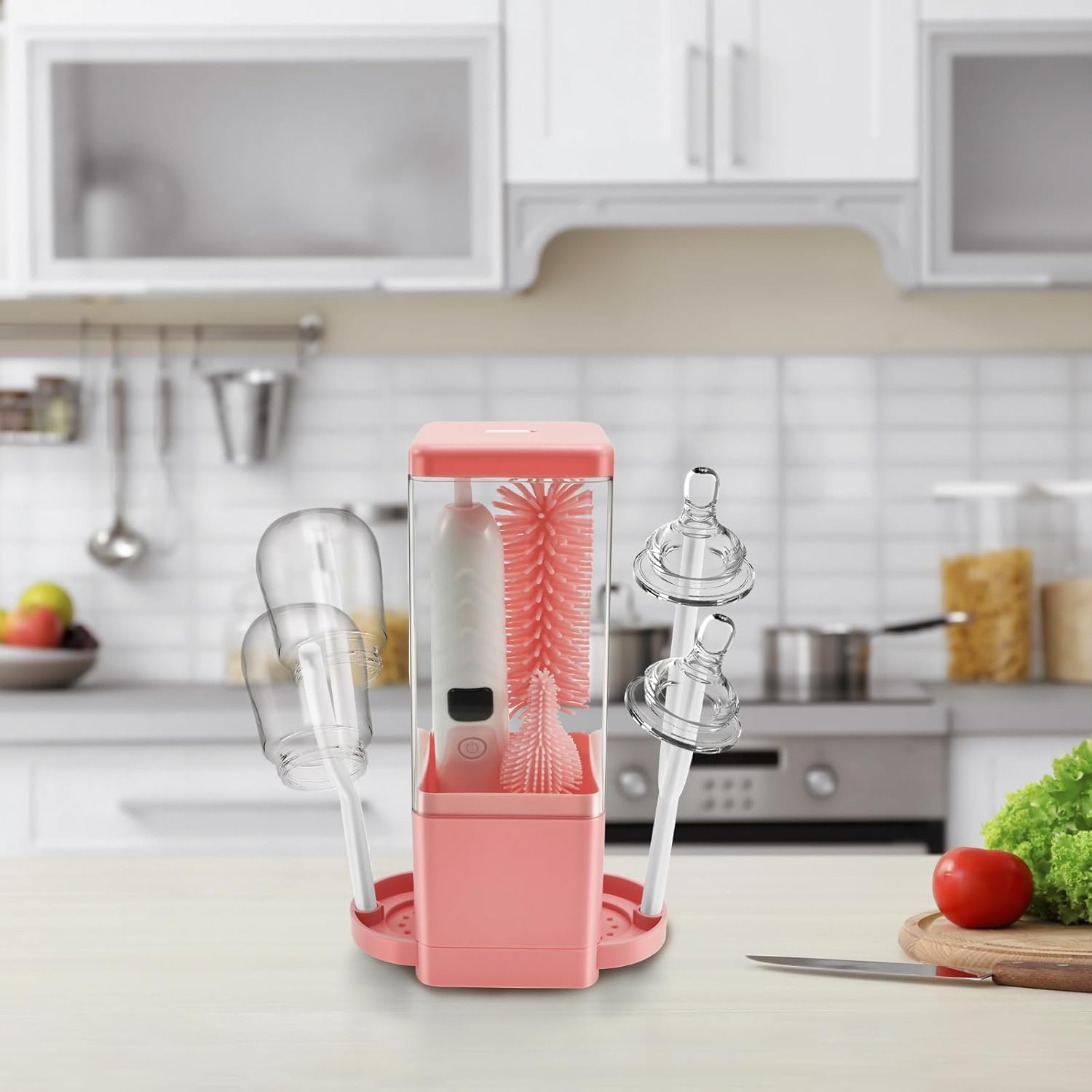 Bottle Brush Cleaning Set with Storage Holder, Adjustable Cleaning Power, Silicone Plastic LED Display Bottle Cleaner Brush for Long Narrow Neck Bottles, Water Bottles, Baby Bottles, Tumblers (Pink)