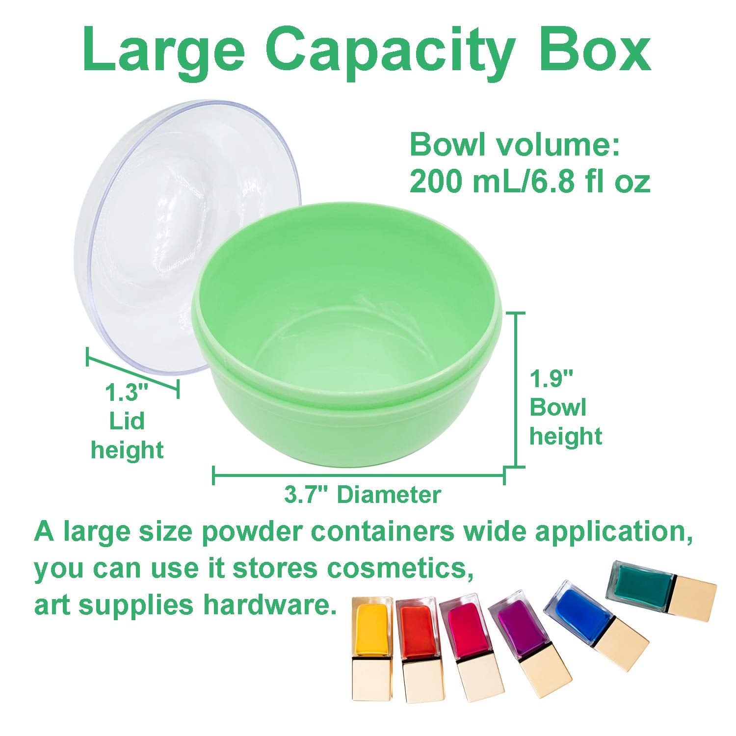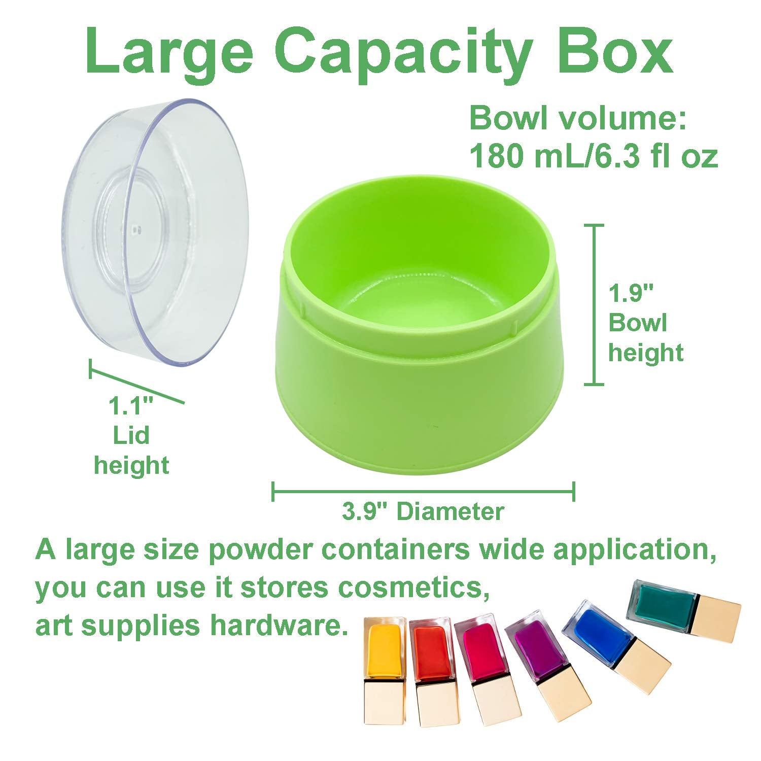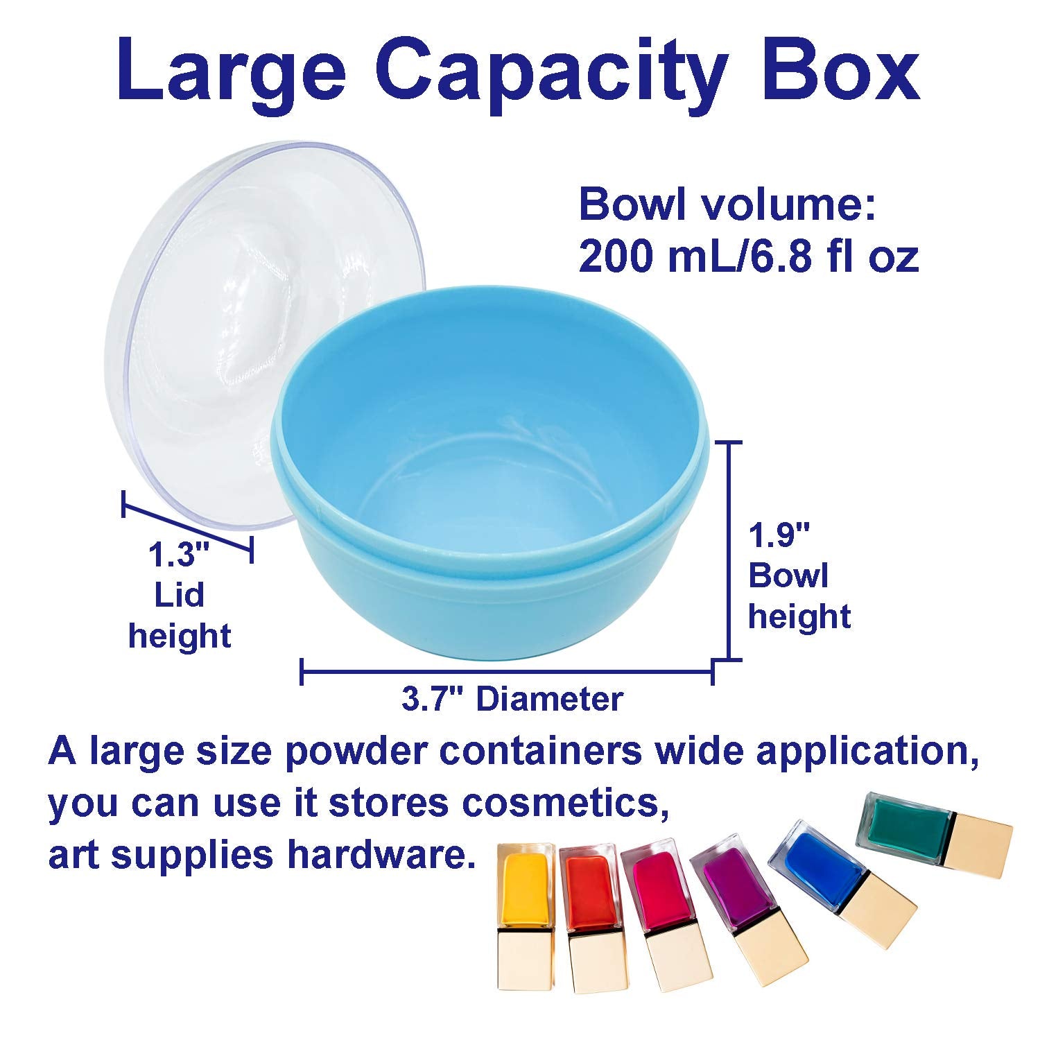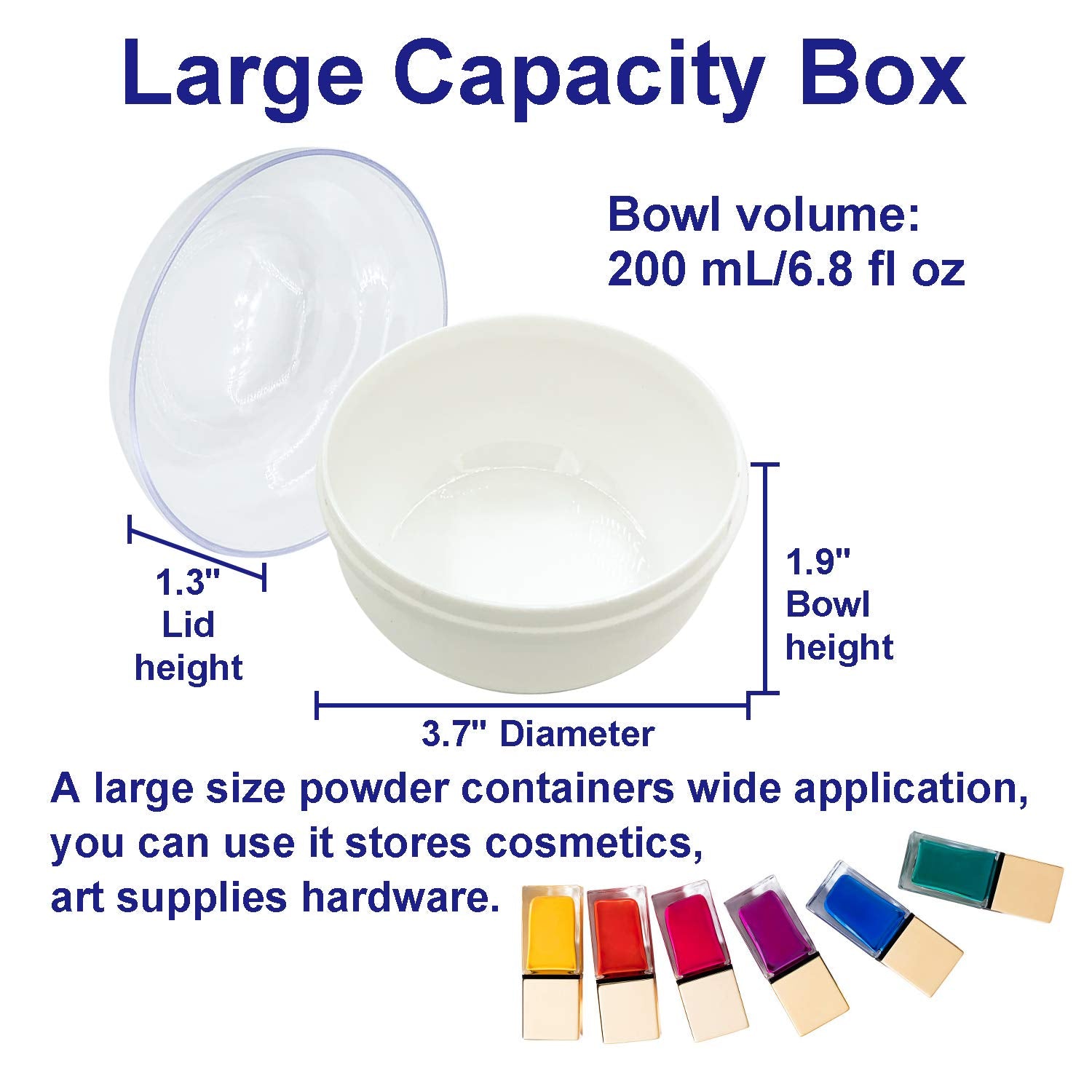 - Large Capacity Box--The powder containers dimensions is 3.9 inches x 2.1 inches, and the capacity is 180 mL/6.3 fl oz, a bit larger than average powder case. A large size powder containers wide application, you can use it stores cosmetics, art supplies hardware; Large capacity box and big fluffy puff are easily screwing together for compact storage have great use.