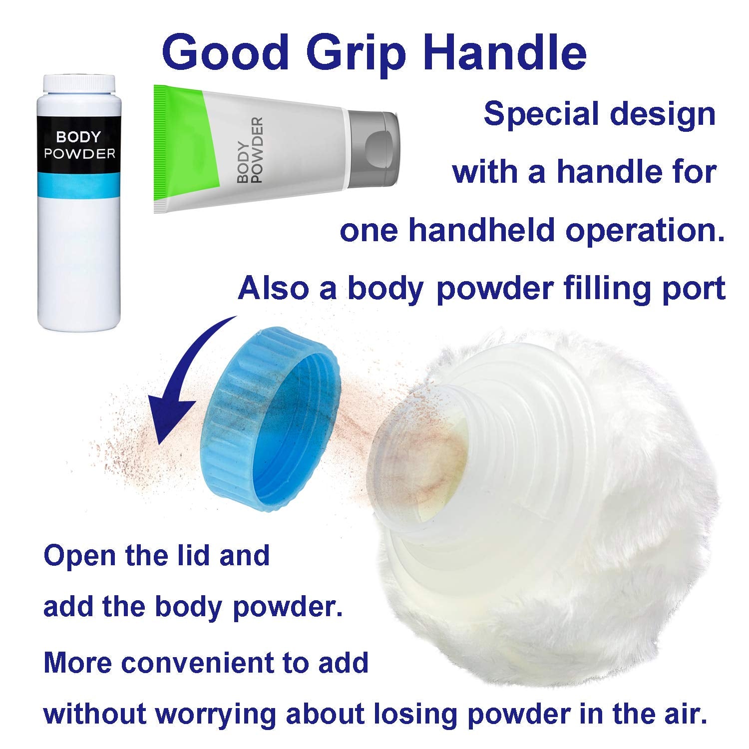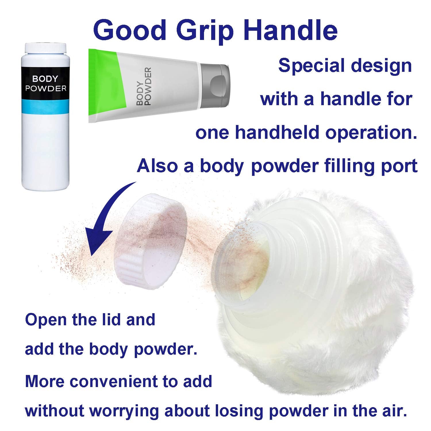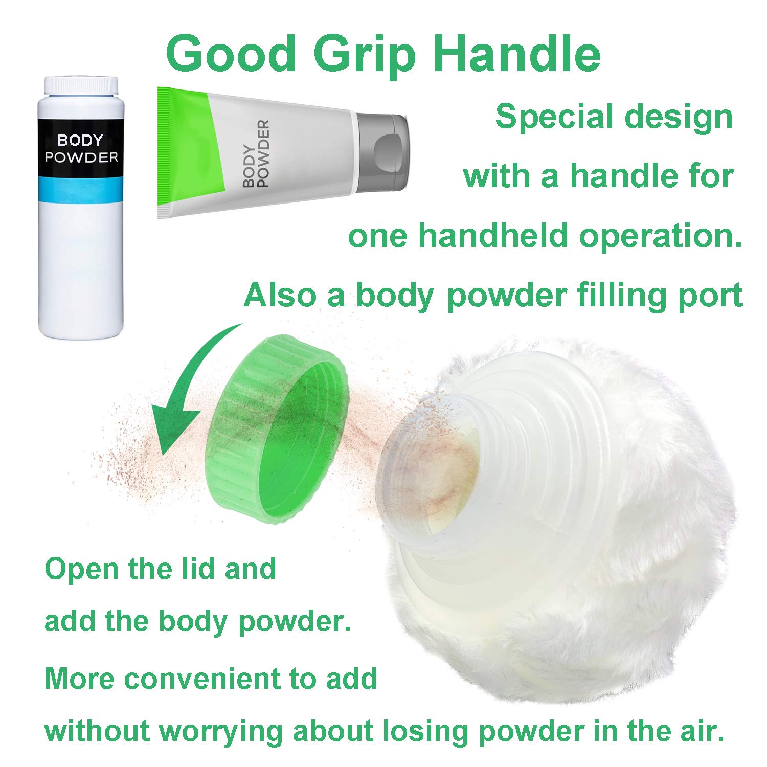 - Good Grip Handle-- Special design with a handle for one handheld operation, easy to use and don't worry about the slip. The powder puff can pick and hold the right amount of loose powder, shading powder, and body powder well, easy to apply evenly, no more waste your powder.