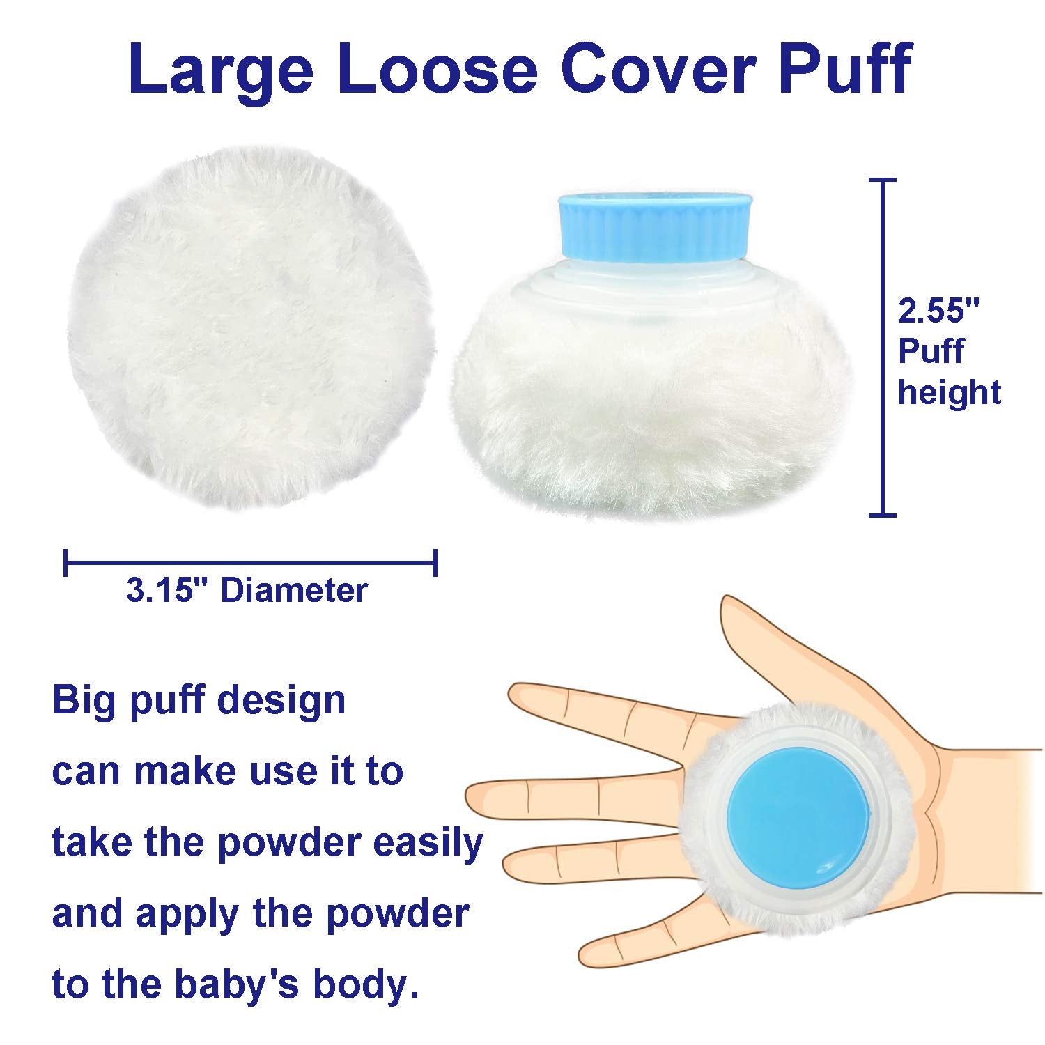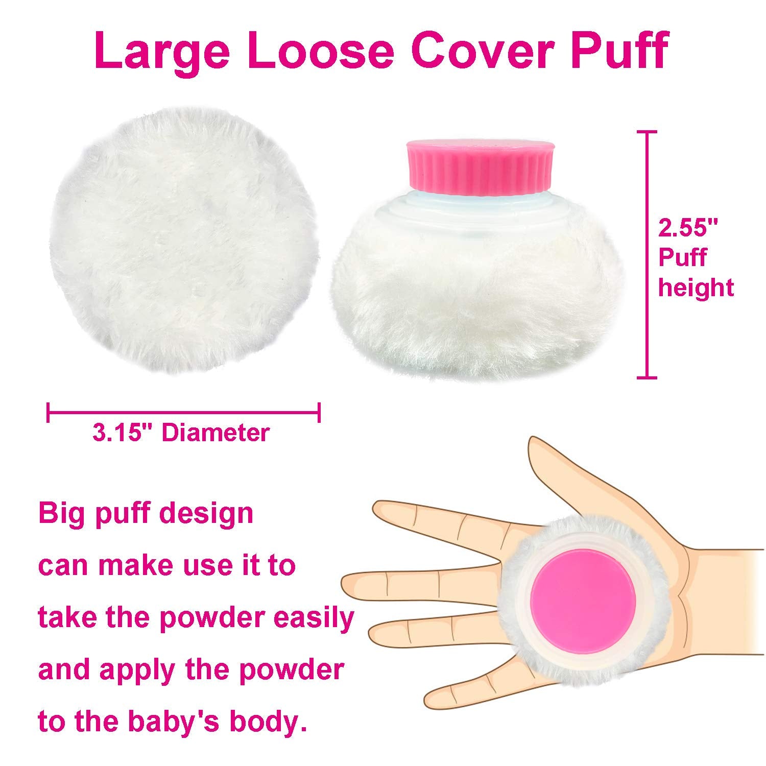 - Loose Cover-- This powder puff is very useful and beautiful, big puff design can make use it to take the powder easily and apply the powder to the baby's body. The furry puff is very soft and gentle to apply after bath, and apply dusting powder on body evenly and smoothly.