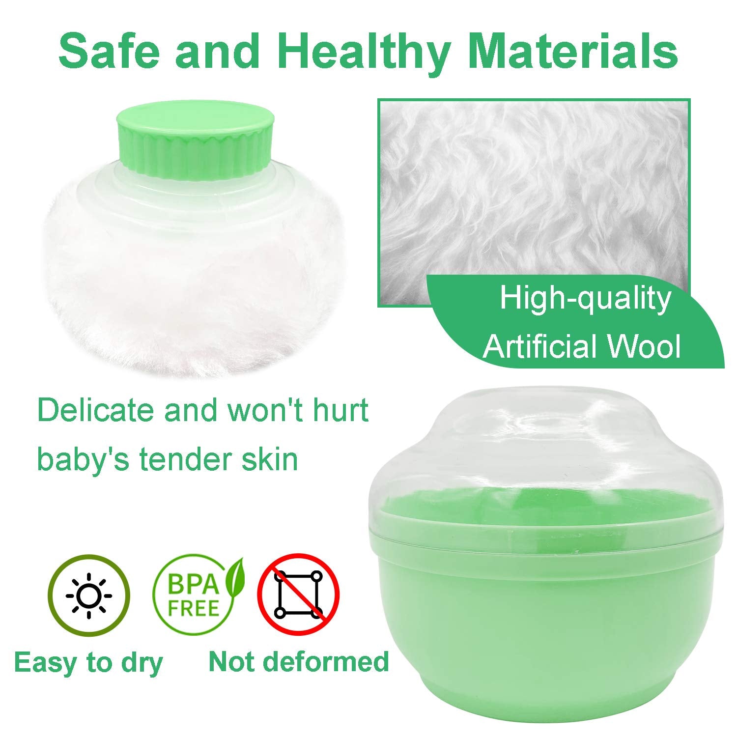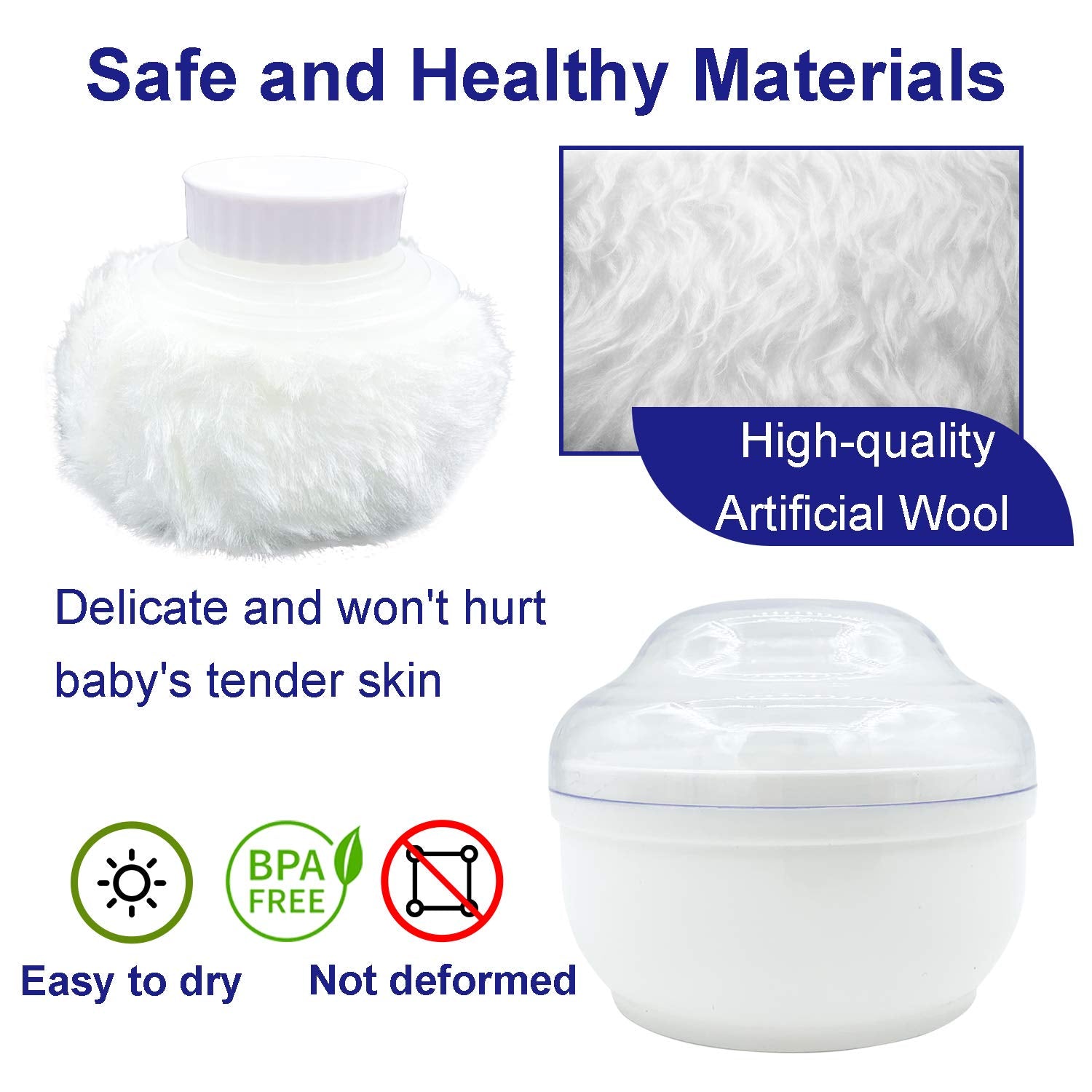 - Safe and Healthy Materials--Delicate and ultra-soft fur, easy to dry, not deformed, refuse powder flying, let our baby get better care. It is made of high-quality artificial wool, which is delicate and won't hurt baby's tender skin, without essence, package element, talcum powder and fluorescent agent. The upper and lower cover are extra thick and not easy to crack. It is firm and durable, with exquisite and practical handle, which makes it more convenient for mom to use.