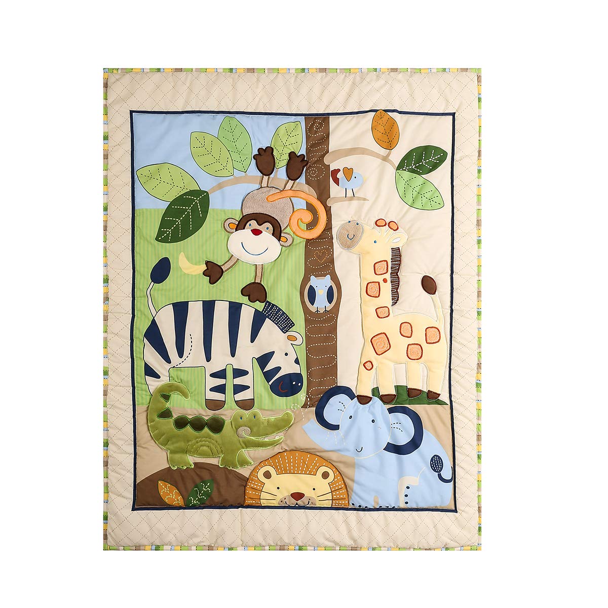 - FEATURES MADE FOR YOU -- Friendly jungle have a gathering of charming woodland animals,the playful monkey,blue elephant,cheerful giraffe,mighty lion ,singing bird and cute crocodile,their playful characters add to this happy nursery. So perfect baby shower gift and you can also as a great gift idea for house warming, birthday,mother's day, thanks giving,Christmas or any time when you think someone deserves a nice bedding set.Perfect !