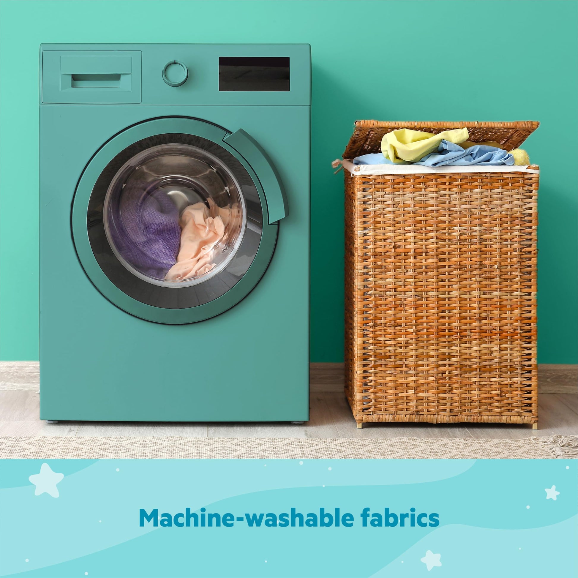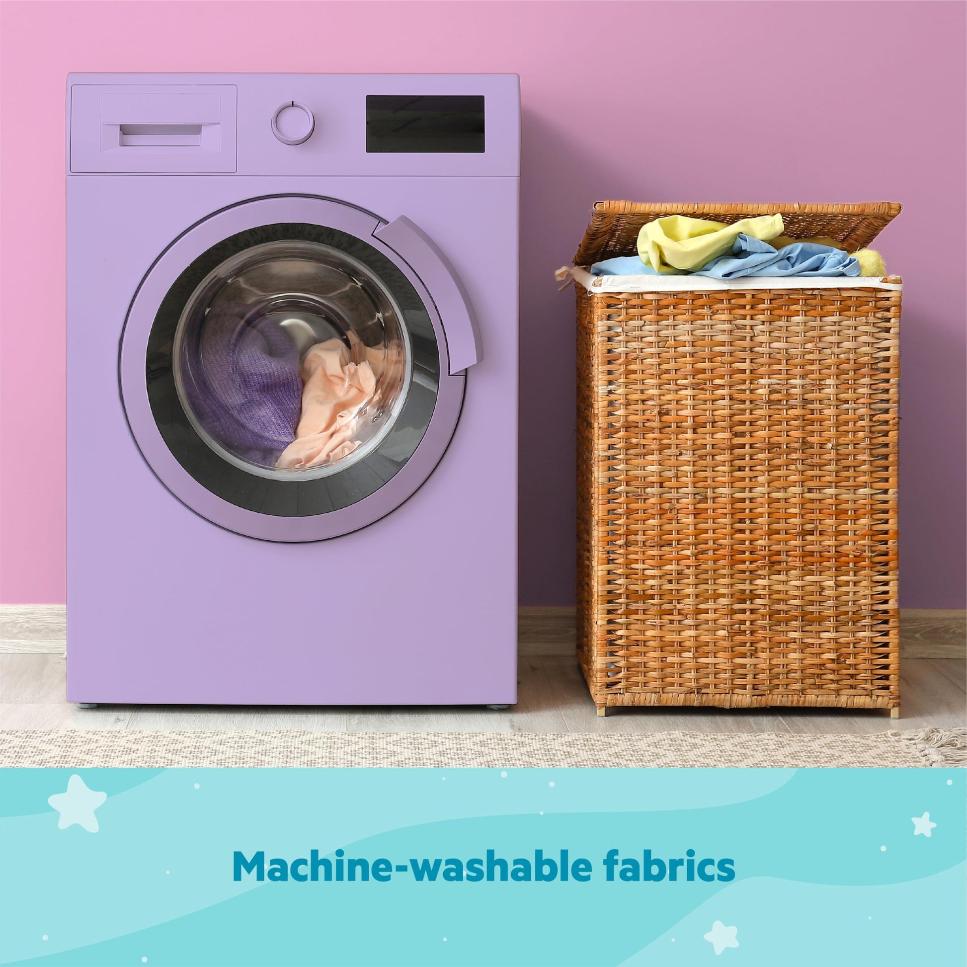 - Easy to clean with machine washable pad and wipeable toy bar & canopy; powered by 3 AA batteries (not included); suitable for newborns & up; dimensions: 32” x 36” x 18”