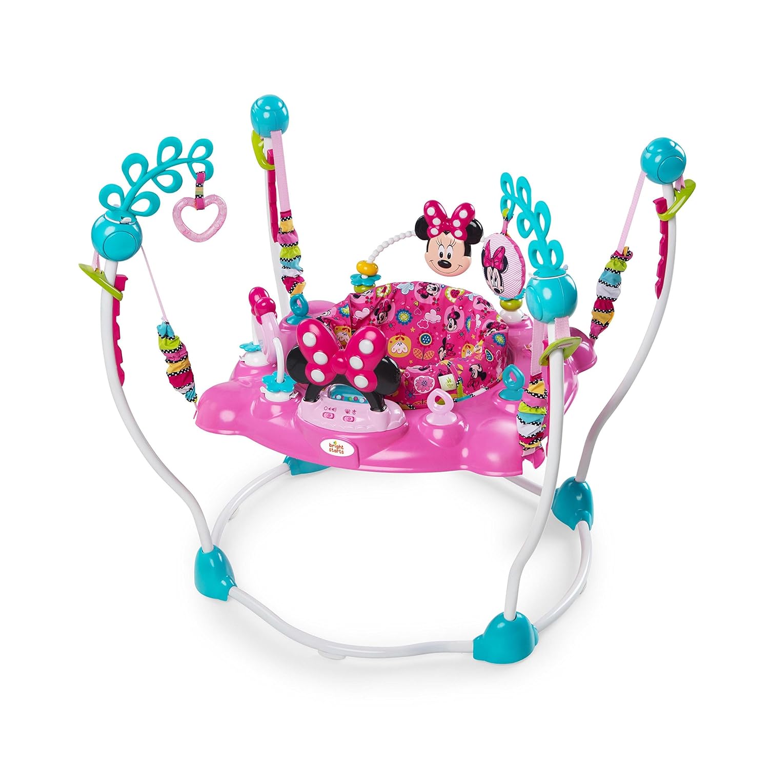 - Bright Starts Disney Baby Minnie Mouse Peekaboo Jumper features 10 engaging toys and activities, including an electronic toy station shaped like those iconic ears! Also features a heart shaped mirror, spinner with beads, bead chaser, and dangling toys