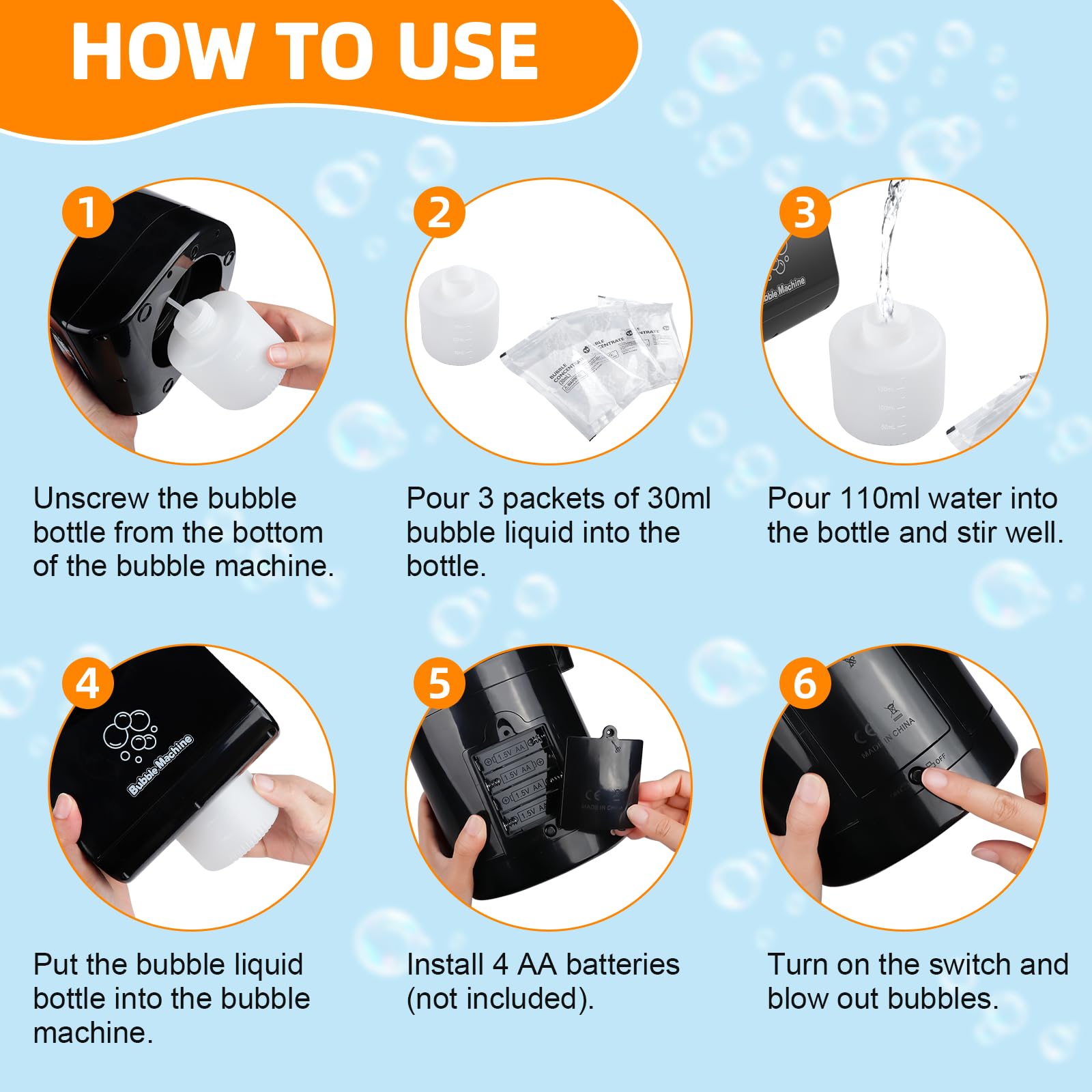 - Simple Operation Steps: The operation is straightforward. Create the solution by combining the contents of 3 packs of 30 ml bubble concentrations with 110 ml of water. Use the provided stirring stick to mix the solution for 20-30 seconds, ensuring thorough blending. Install 4 AA batteries (not included) and press the button to start the bubble machine.