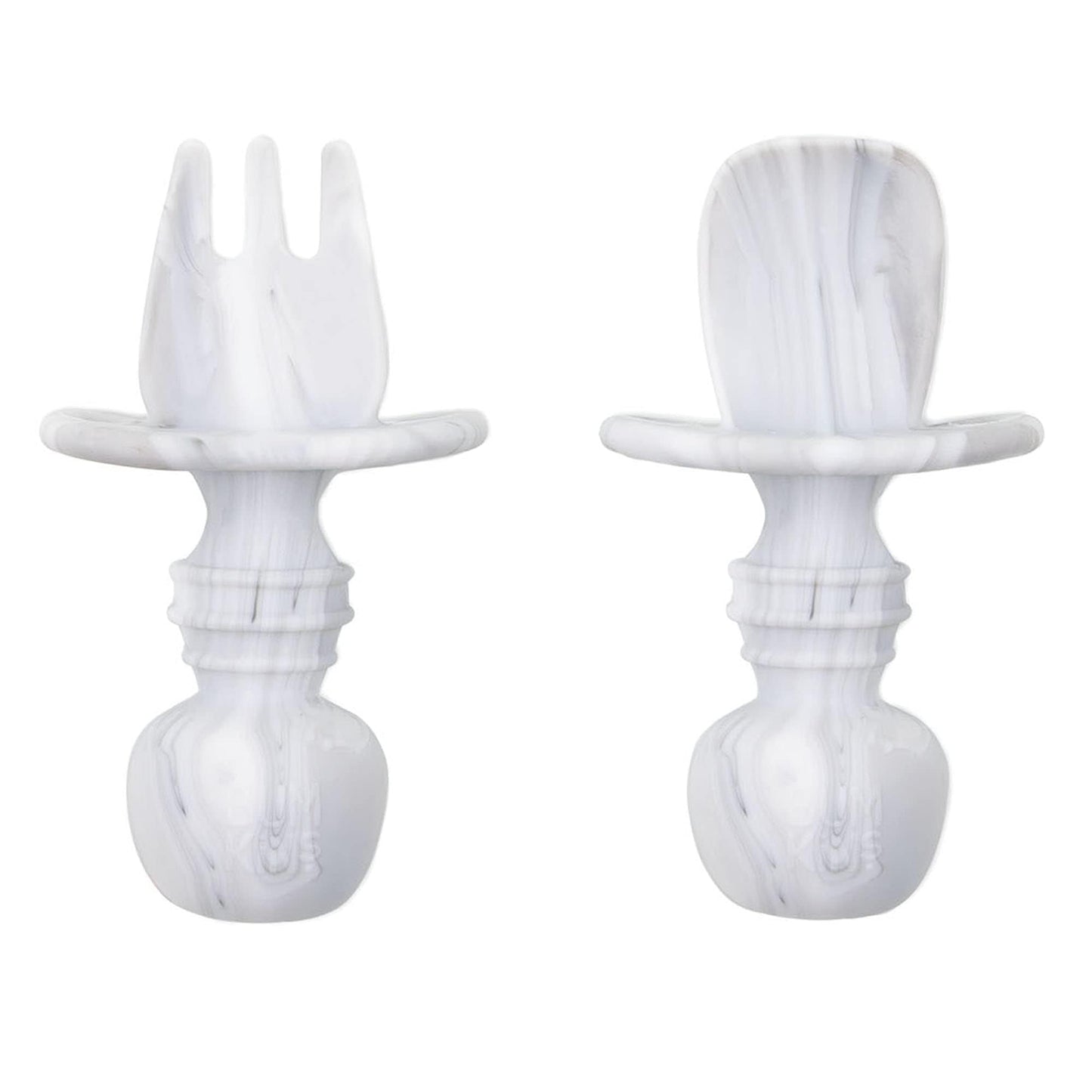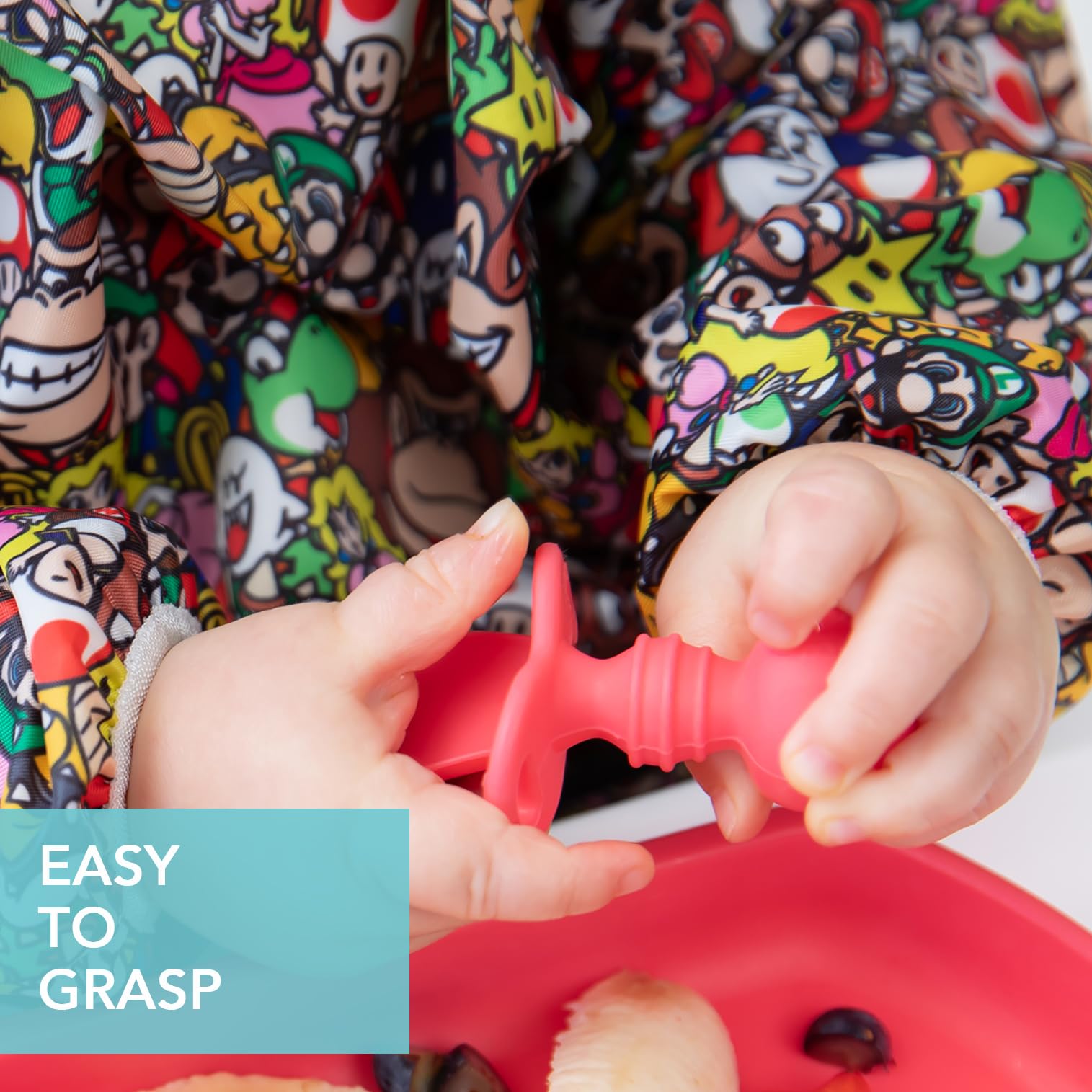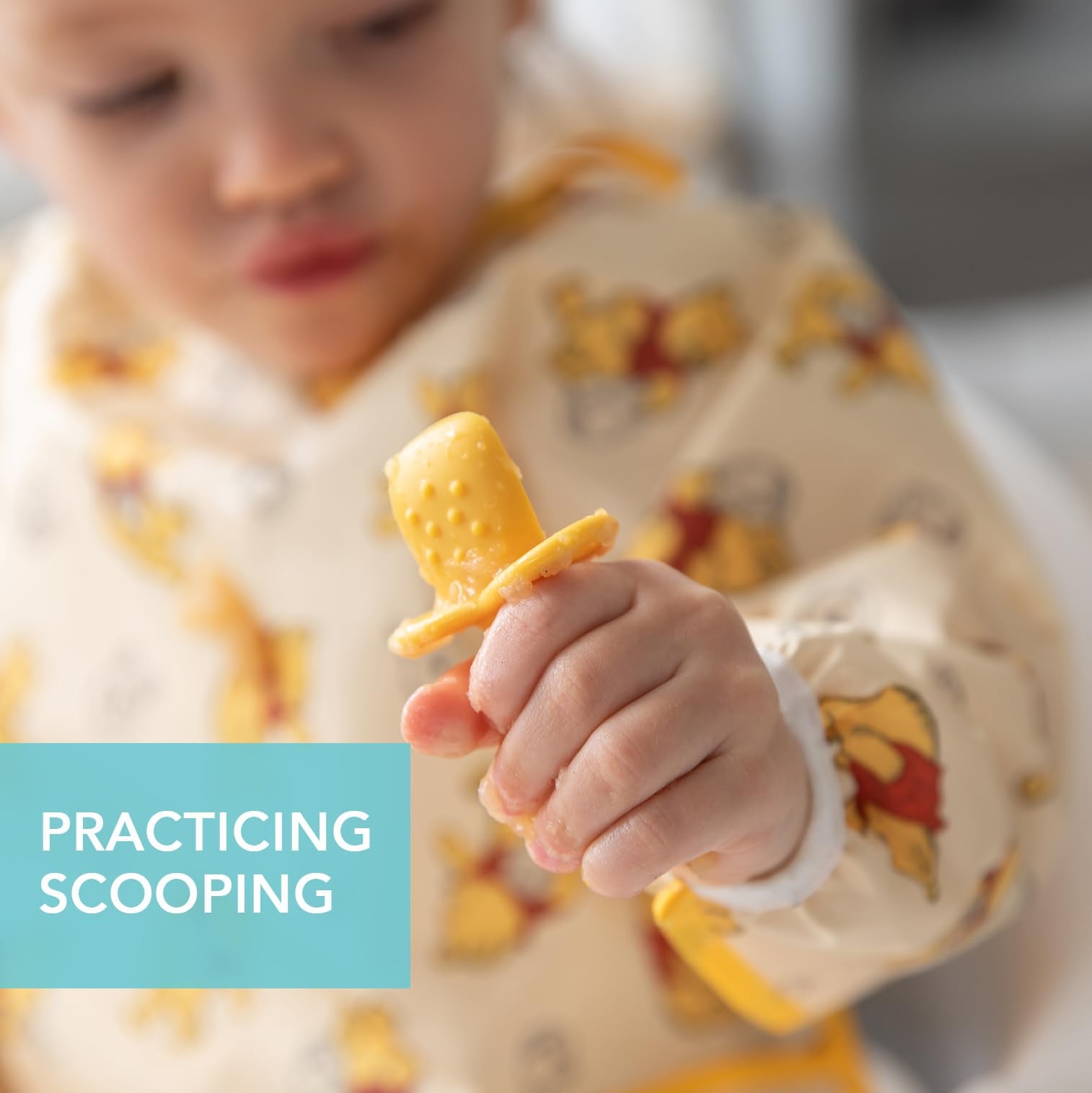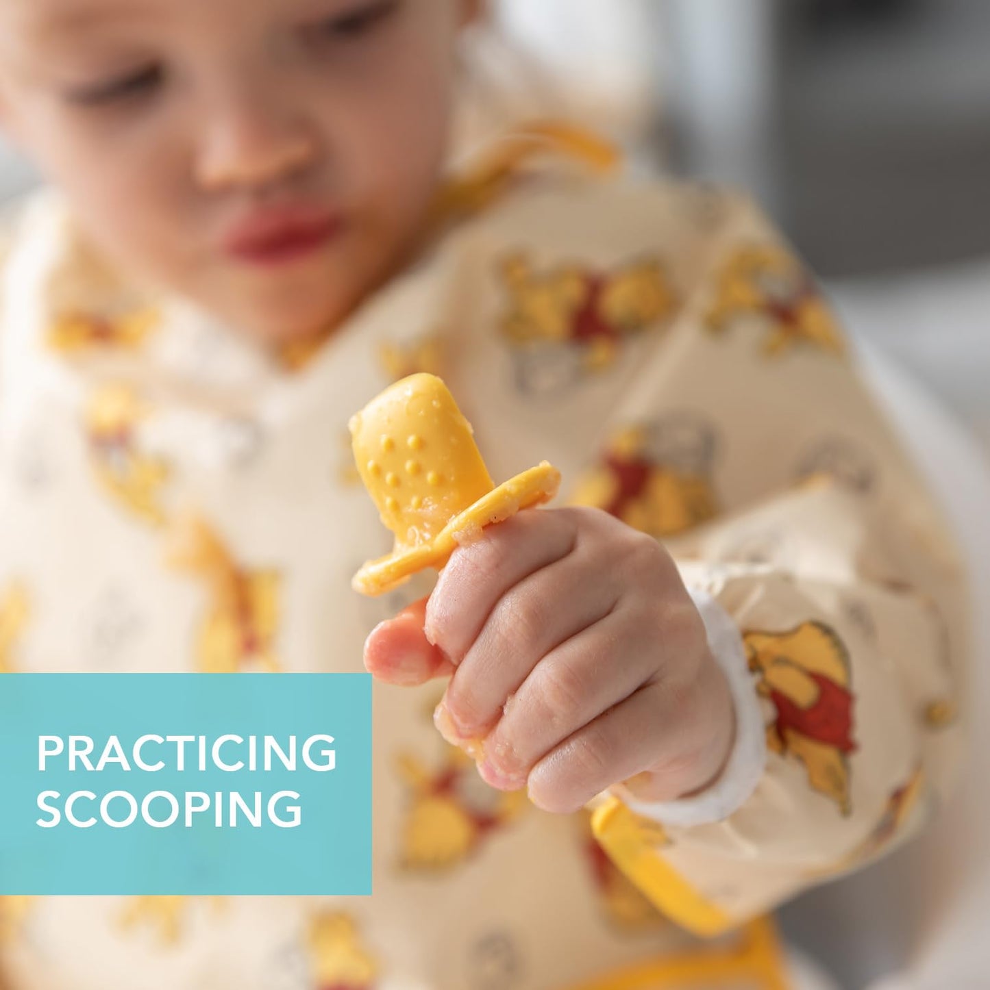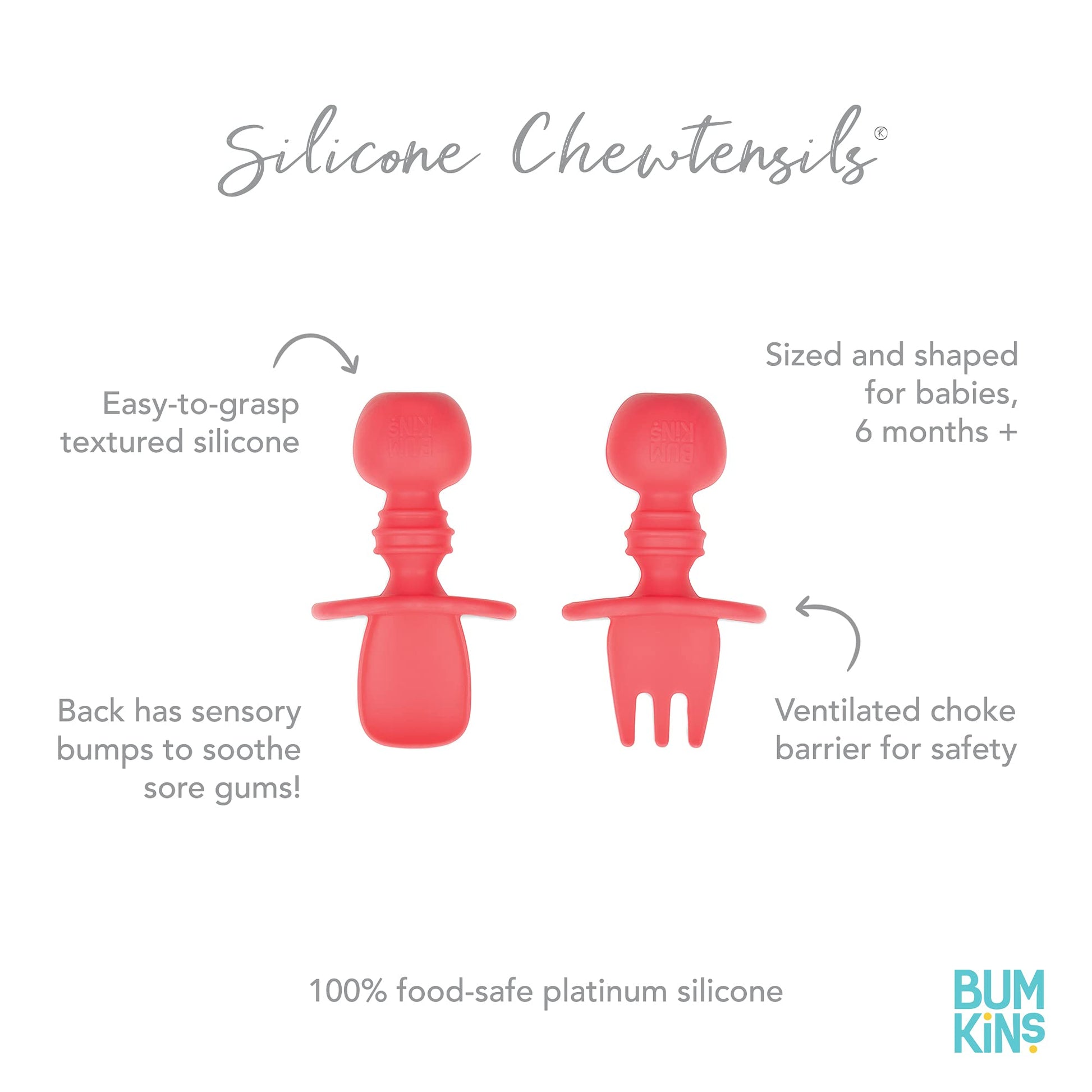Inspired by one of Disney’s most beloved characters, Minnie Mouse. Bumkins Chewtensils are intended for Stage 1 of baby led weaning – introducing babies to the concept of holding a utensil and feeding themselves. We made Chewtensils from soft, textured silicone that’s easy to grip and is gentle on tender gums, with bendable heads for safety. The utensils are safe to be be chewed on before transitioning to silverware. The back of the spoon head has sensory bumps to stimulate gums. Weighted, textured handles allow little ones to hold. Perfect for dipping into pureed foods at the early part of baby led weaning.Chewtensils are intended for babies before they have a firm grasp on self-feeding; best for dipping and scooping, not yet piercing solid foods. Made from 100-percent food-safe silicone. Dishwasher-safe. For ages 6 months and up. Each measure approximately 3in long, 1.75in wide. Do not leave child unattended with product. Discard if damaged or torn.Starting with purees and traditional weaning means: Confidence in regulating how much your baby is eating and their nutritional intake; Less mess – purees get less distance when thrown.Skipping purees and jumping into self-feeding means: Independence – your little one has control over what they eat, promoting confidence and earlier expansion of their palate, often associated with less fussy eaters; Baby can often eat some of what you’re having, so you don’t have to make separate meals; They decide when they’re full – according to the American Academy of Pediatrics, babies have an innate ability to self-regulate their eating.We use third party labs to ensure the products we manufacture comply with CPSC and CPSIA standards for BPA, Lead, and Phthalates. For over 30 years, Bumkins has been creating thoughtful and responsibly made essentials for babies and kids, making parenting easier so families can cherish the special moments.