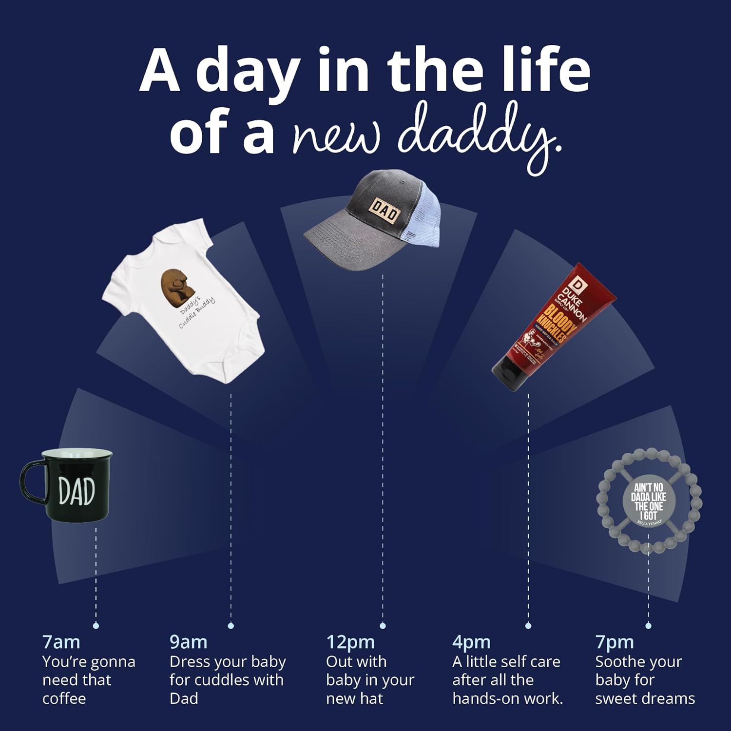 - Silicone Dada Teether: Safe and easy to grip, this soft textured teether brings real relief for teething babies and a quiet moment for tired parents. Cleans easily and looks great. A nice surprise in his dad gift box.