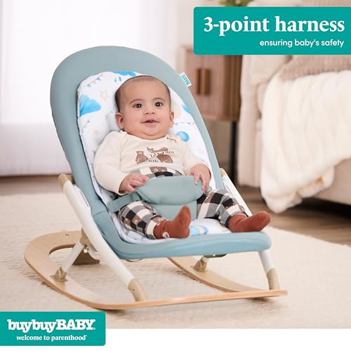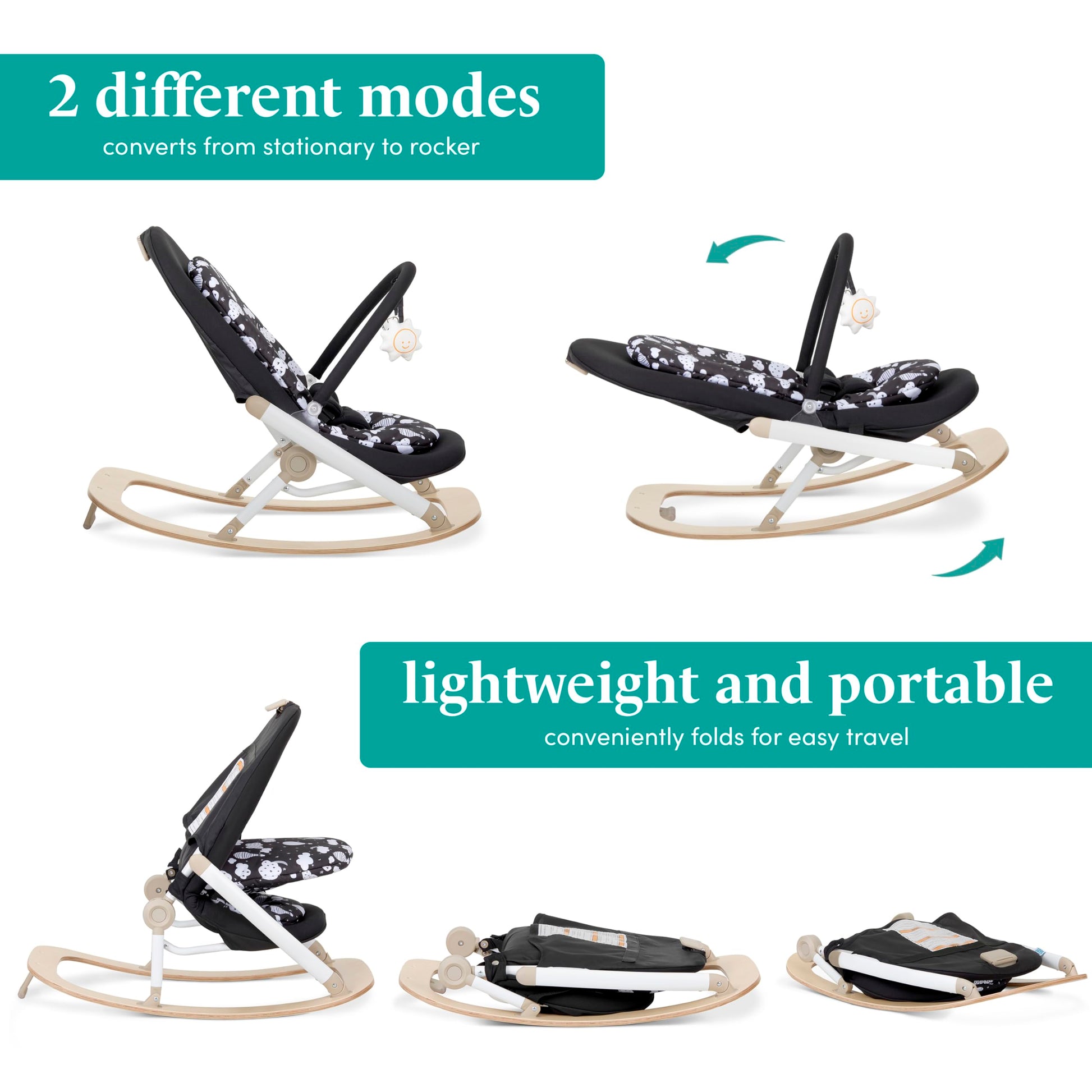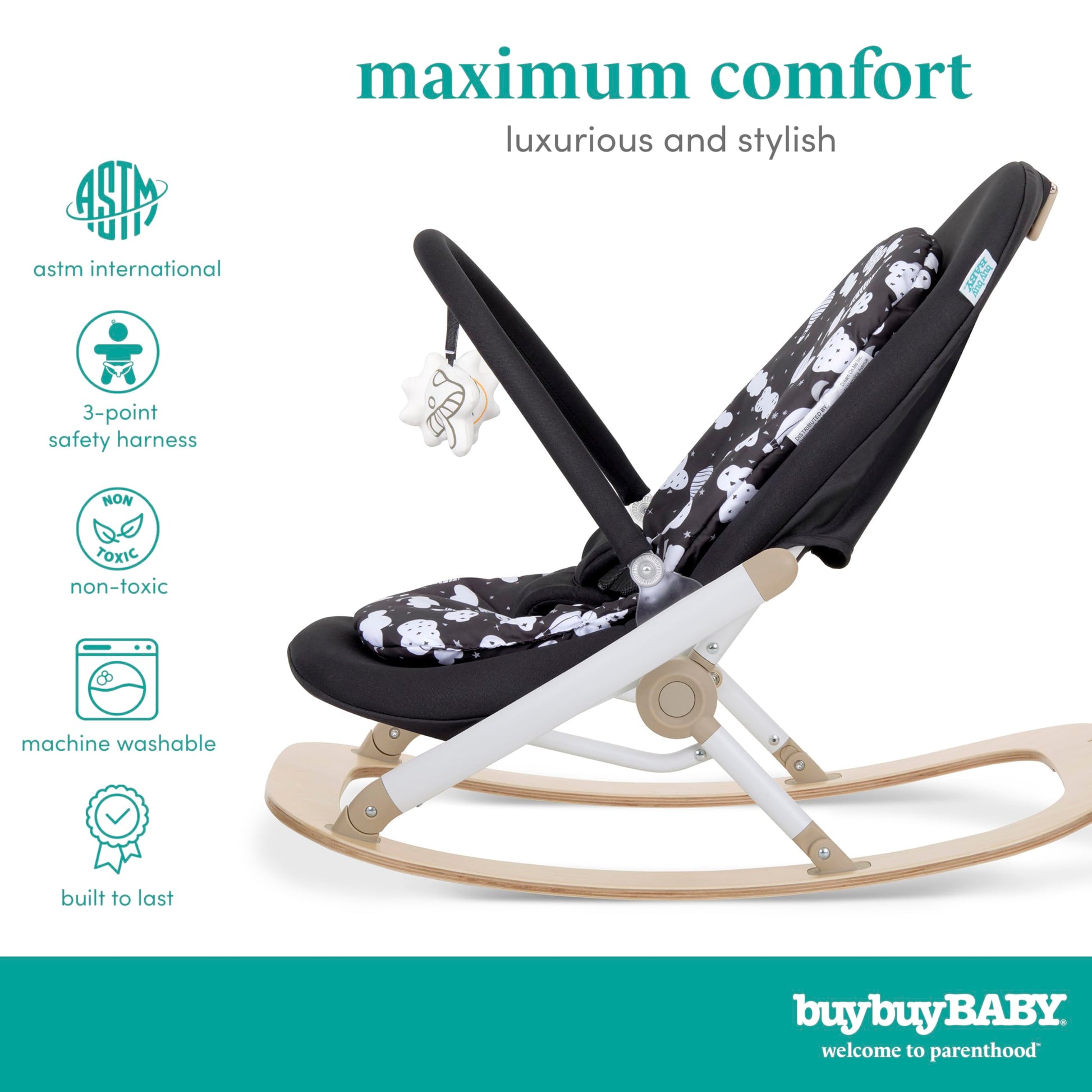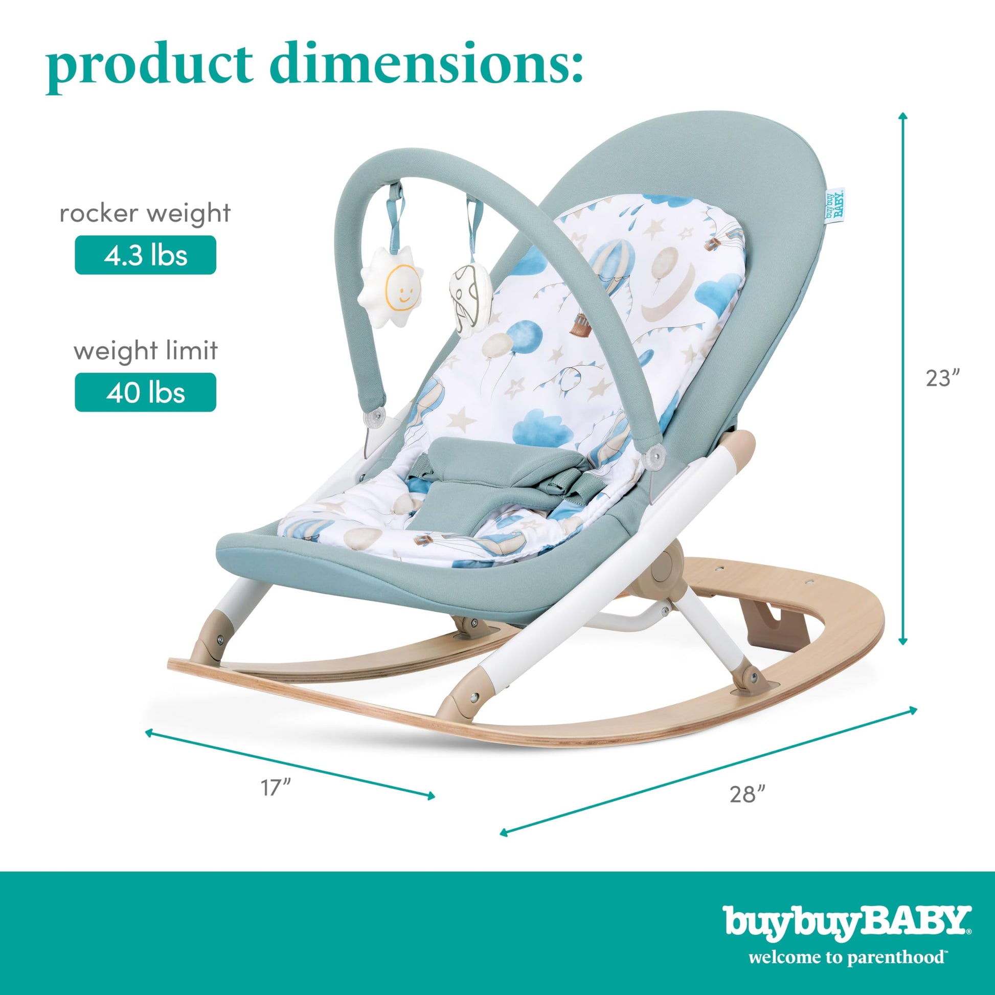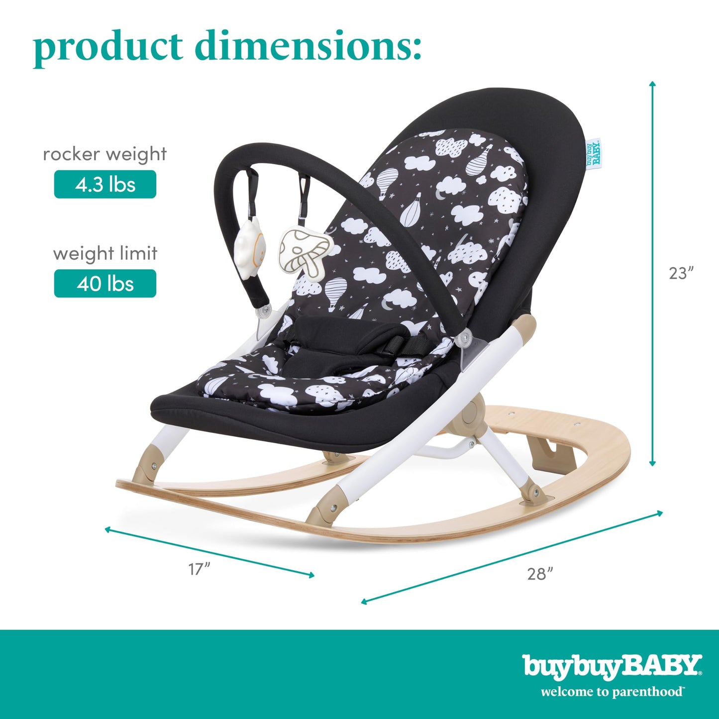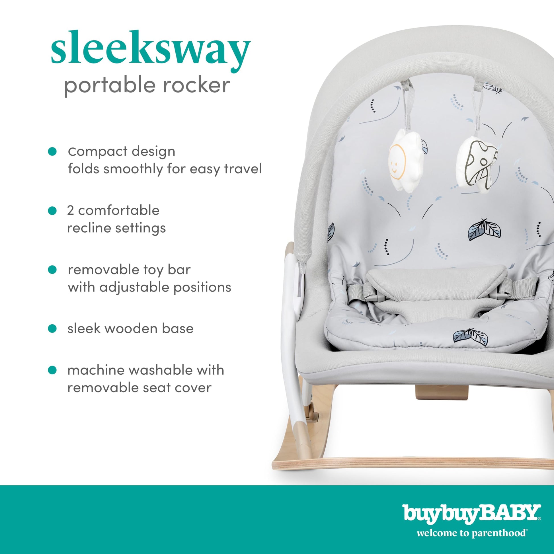 Make way for a premium quality rocker that grows with your baby’s needs. Experience comfort and style with the buybuy BABY SleekSway Portable Rocker, for a soothing and secure space. With three adjustable positions, this wonderful rocker can be set to a sitting position for playtime or a sleeping position for nap time, ensuring maximum comfort. While the sturdy wood base ensures stability, the seat fabric is both removable and machine washable, keeping the rocker clean and fresh. The toy bar comes with two colorful, adjustable toys to stimulate your baby's senses. What’s more? Lightweight and easy to move, the SleekSway Rocker can be conveniently relocated to any room in your home. Available in three elegant color variations—Black White, Light Gray and Mint White - this deluxe rocker is as visually appealing as it is functional. Product dimensions are 28.5” L x 17.1” W x 22” H, with a weight limit of 40 Lbs.