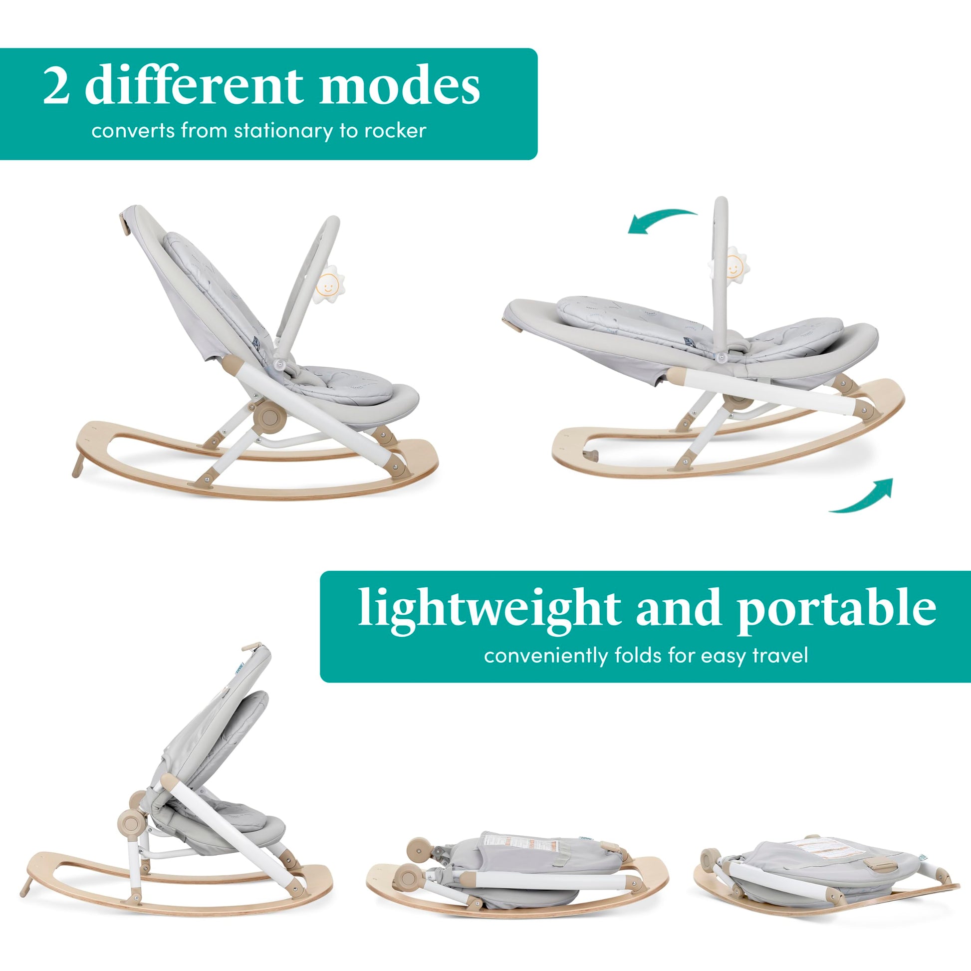 - THOUGHTFUL DESIGN: While the sturdy wood base ensures stability, the seat fabric is both removable and machine washable, keeping the rocker clean and fresh. The toy bar comes with two colorful, adjustable toys to stimulate your baby's senses.