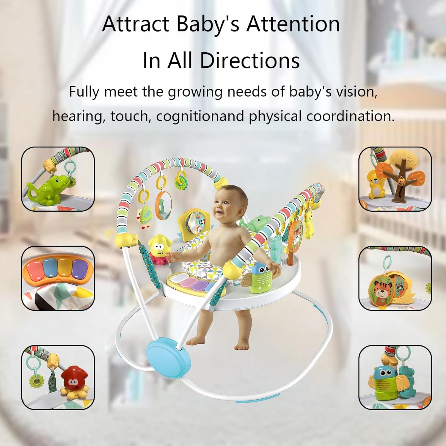 This butterfly-shaped stable structure baby jumping chair has 12 kinds of exquisite toys in the ocean area and animal area. It not only provides safety and stability, but also creates a 360° play park for children.It's the best gift for children. There are various cartoon toys and cartoon mirrors hanging to stimulate children's exploration. At the same time, the electronic keyboard with colored buttons can adjust the brightness and volume to play a brisk and classic rhythm.
