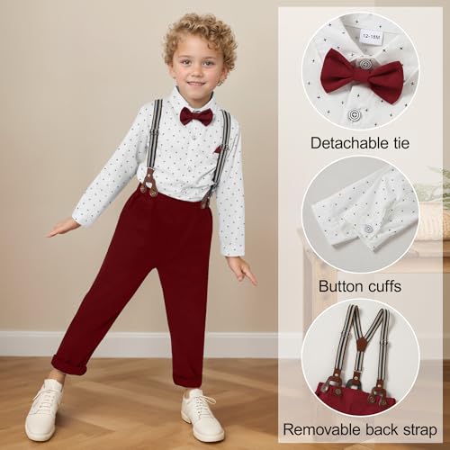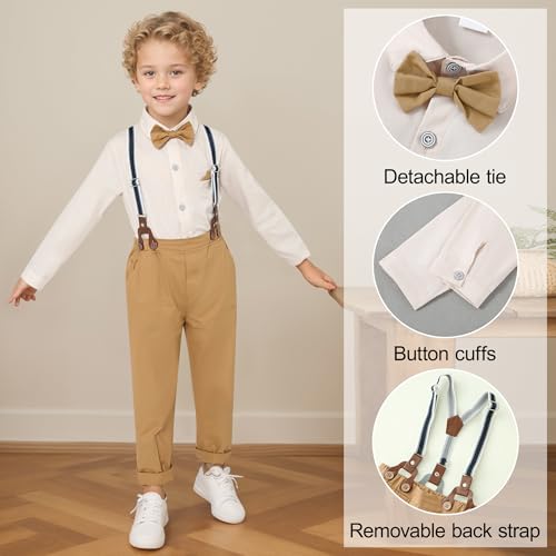 - Complete Formal Suit: Toddler boy 4 pcs set Includes a dress shirt, detachable bow tie and suspender pants, turning your little boy into a little gentleman instantly.