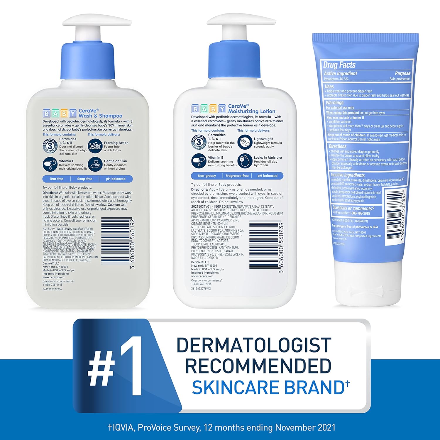 Developed with pediatric dermatologists, CeraVe Baby Wash & Shampoo contains 3 essential ceramides & vitamins to help maintain baby's delicate skin barrier. This tear-free formula cleanses without irritation and leaves baby hair and skin feeling fresh and clean. CeraVe Baby Moisturizing Lotion contains 3 essential ceramides, hyaluronic acid, and vitamins to maintain baby's delicate skin barrier. This non-greasy and light weight baby lotion spreads easily on baby's delicate skin and moisturizes for 24 hours while helping to maintain baby's delicate skin barrier. CeraVe Healing Ointment for Baby protects and soothes baby's delicate skin when it is dry, cracked and/or chafed with a silky, lightweight formula that contains hyaluronic acid for added moisture. Protects chafed skin due to diaper rash and helps seal out wetness. •Paraben-free •Fragrance-free •Phthalate-free •Dye-free •Accepted by the National Eczema Association which only accepts products that have satisfied criteria for use for those with eczema or sensitive skin condition Key Ingredients: •Ceramides:Help reinforce baby’s protective barrier •Vitamin E: Provides soothing and moisturizing benefits •Hyaluronic Acid: This ingredient attracts hydration to the skin’s surface and helps the skin retain moisture.