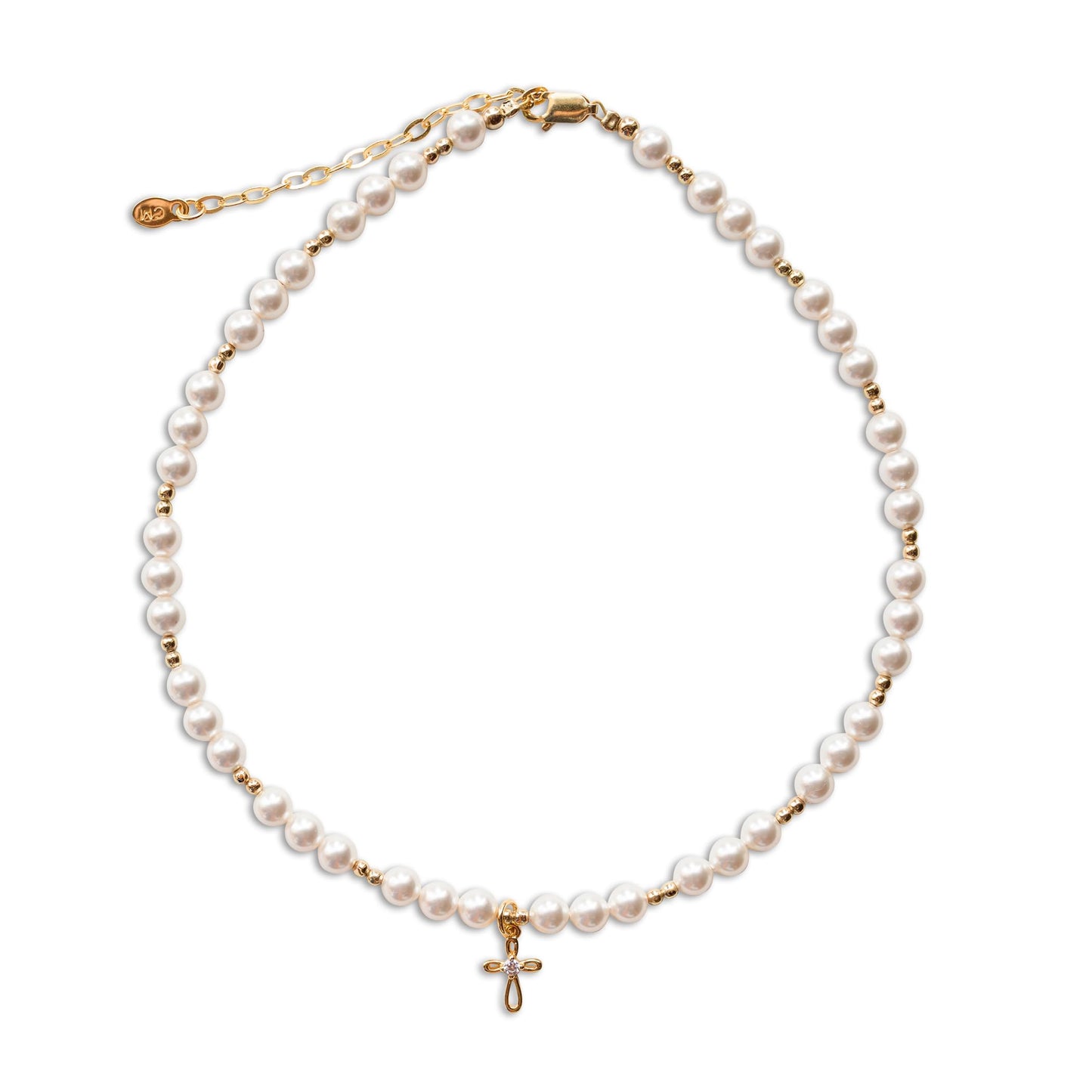 Cherished Moments Children's 14K Gold-plated Bracelet and/or Necklace with High-End Simulated Pearls and Cross Charm for Baptism, Christening or First Communion Gift for Girls