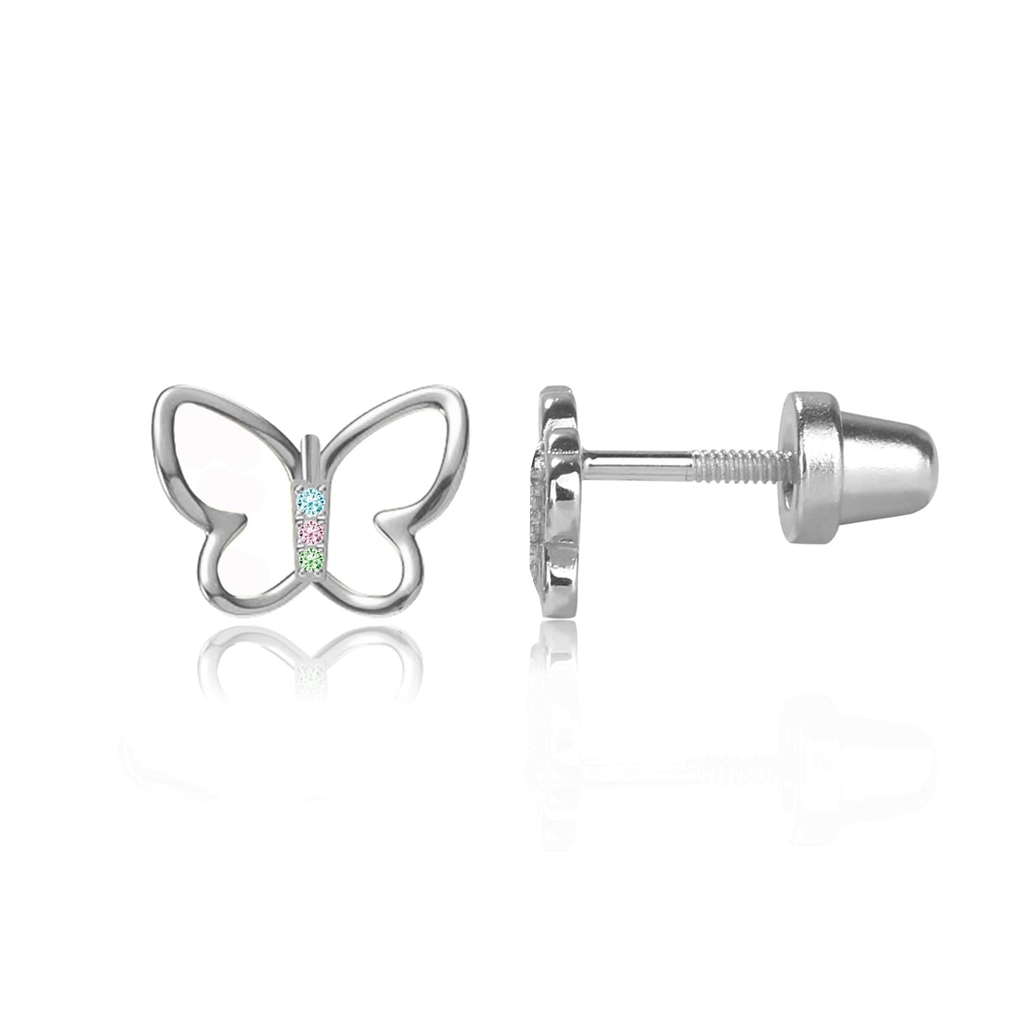 Cherished Moments Children's Sterling Silver Butterfly Screw Back Earrings with Pink or Rainbow CZs for Babies, Little Girls, Kids and Toddlers