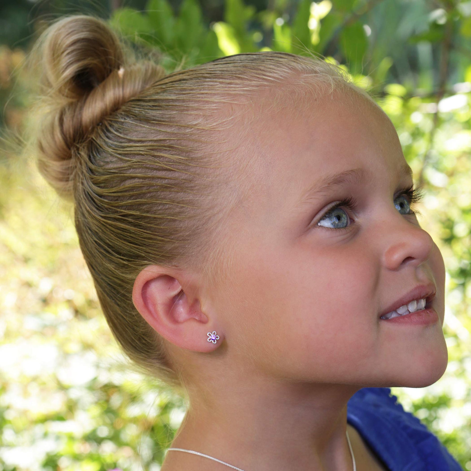 - Measures 6mm x 6 mm. Daisy earrings for babies, toddlers, and little girls made with .925 sterling silver. A premium quality earring that will be durable for daily wear.