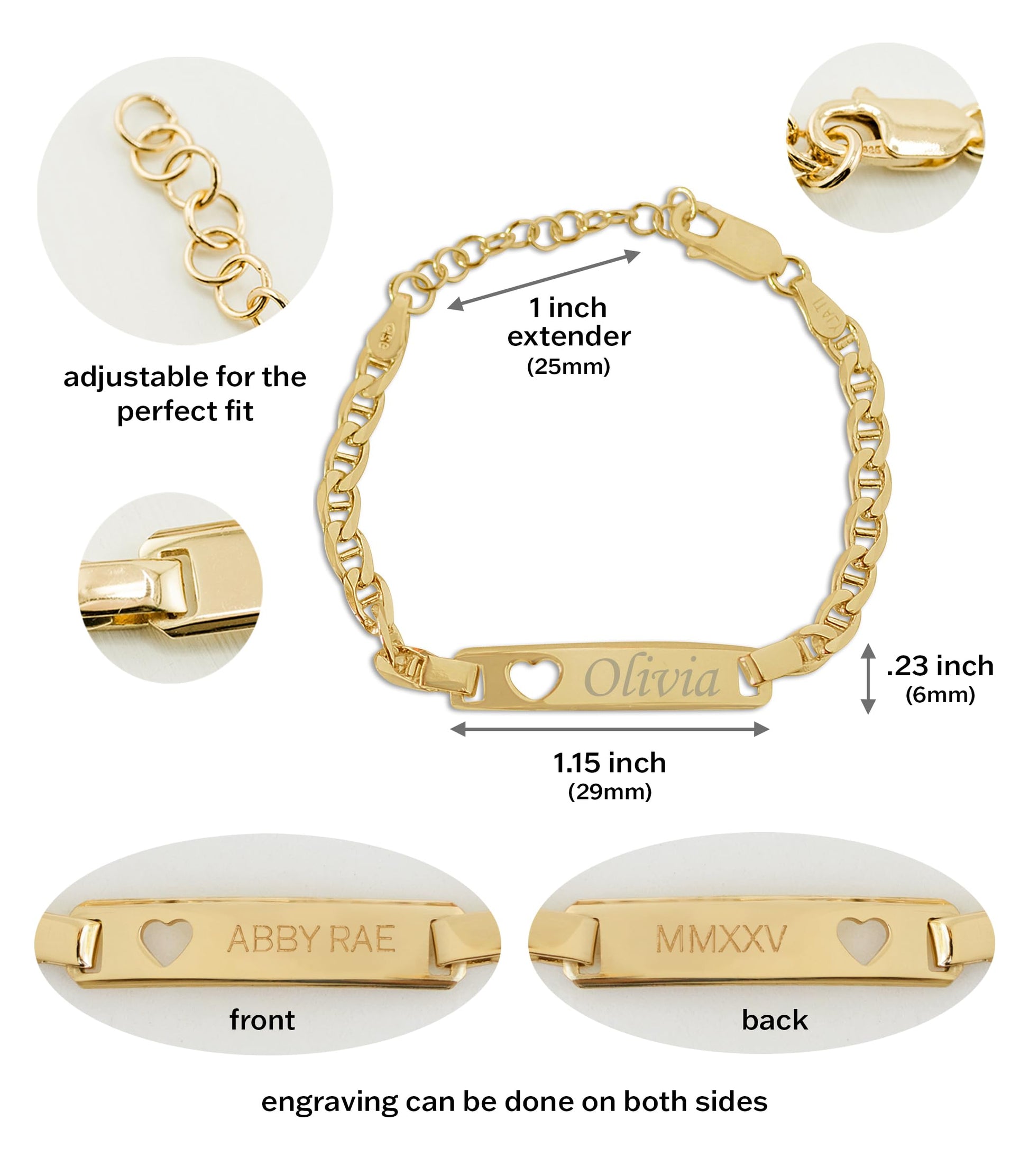 Custom personalized ID bracelet includes engraving at no additional charge. This bracelet is designed with 14k gold plating (over sterling silver) and features an adjustable extension chain. This will be a keepsake she will treasure forever. Comes in a beautiful gift box and makes a timeless gift. ( Safety age-graded for ages 0 and up.)