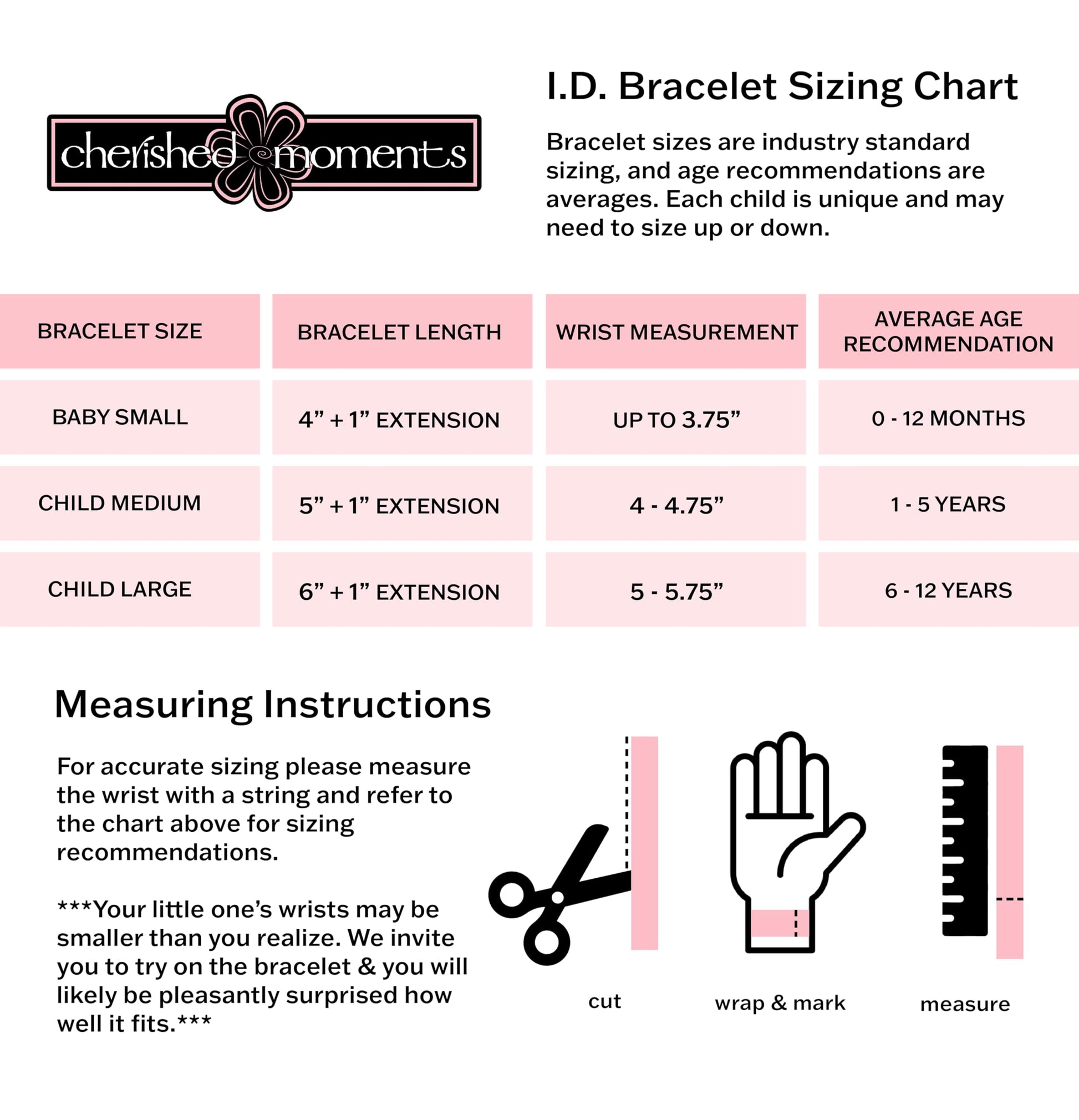 - SIZING – 5 inch + 1 inch extension. This bracelet is designed to fit an average 1-5 year old child and includes an adjustable extension chain for a perfect fit. Please see sizing chart and confirm sizing as personalized items are not eligible for return.