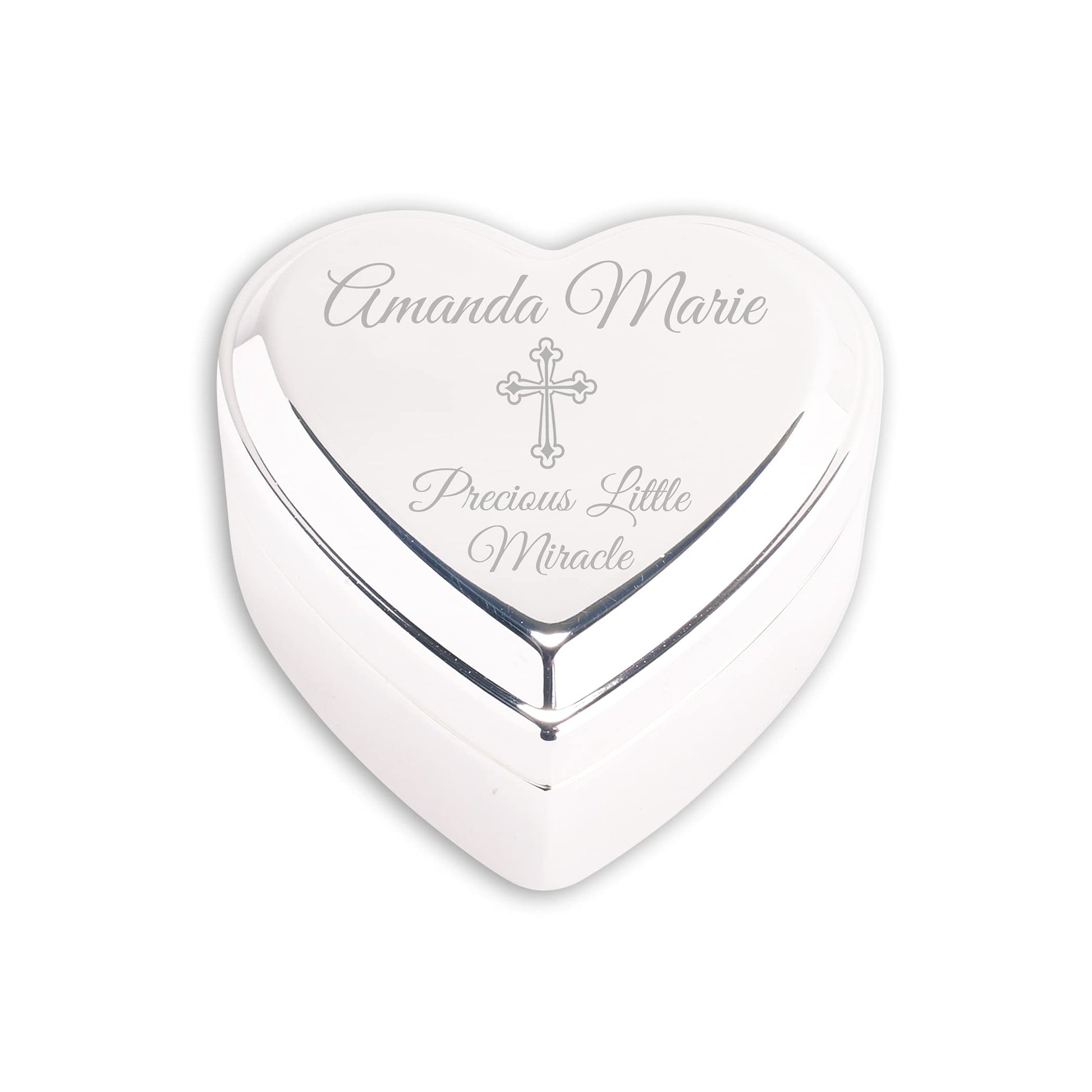 Cherished Moments Personalized Heart Jewelry Keepsake Box with Custom Engraved Cross and Name for Baby Baptism Gift for Girls, Silver Toned