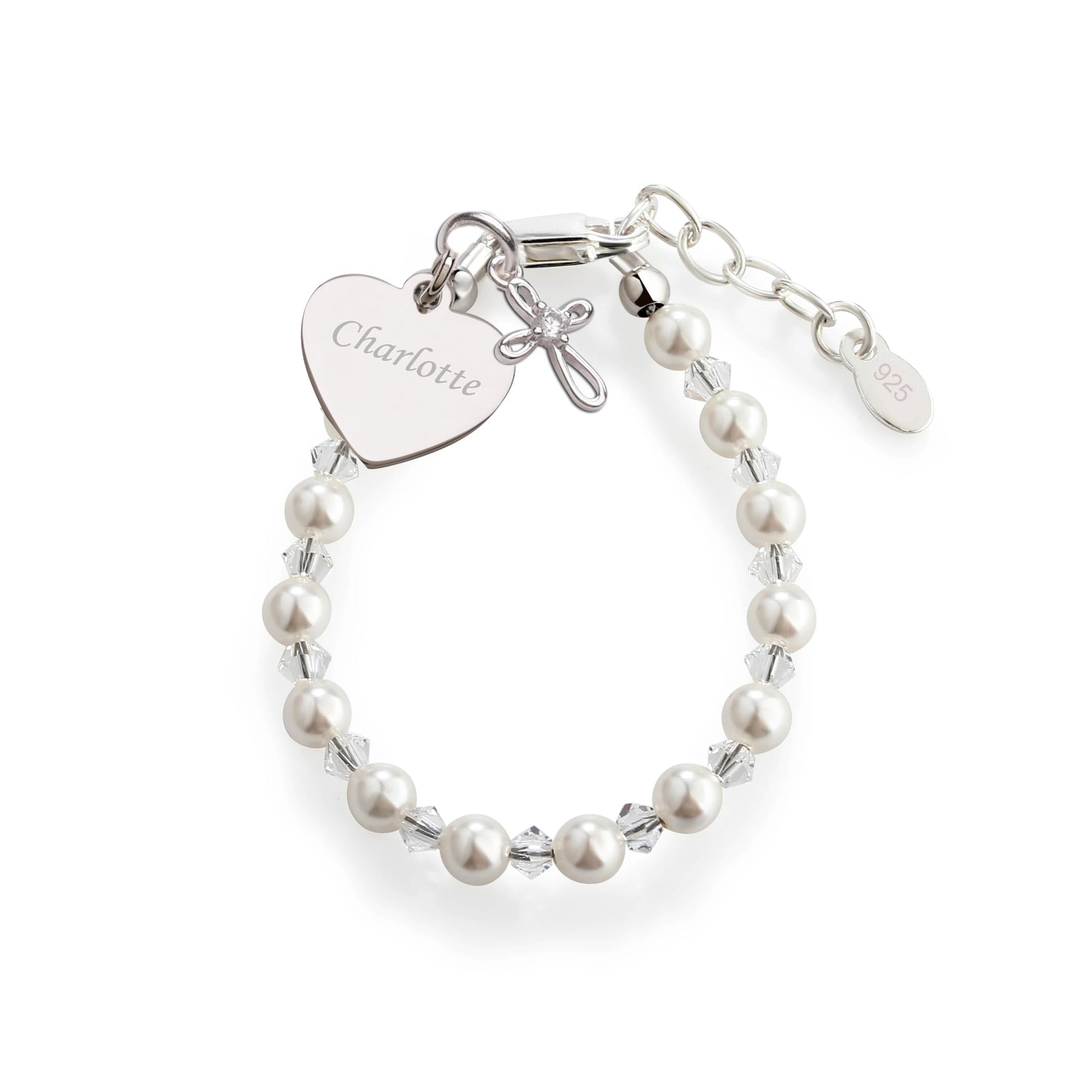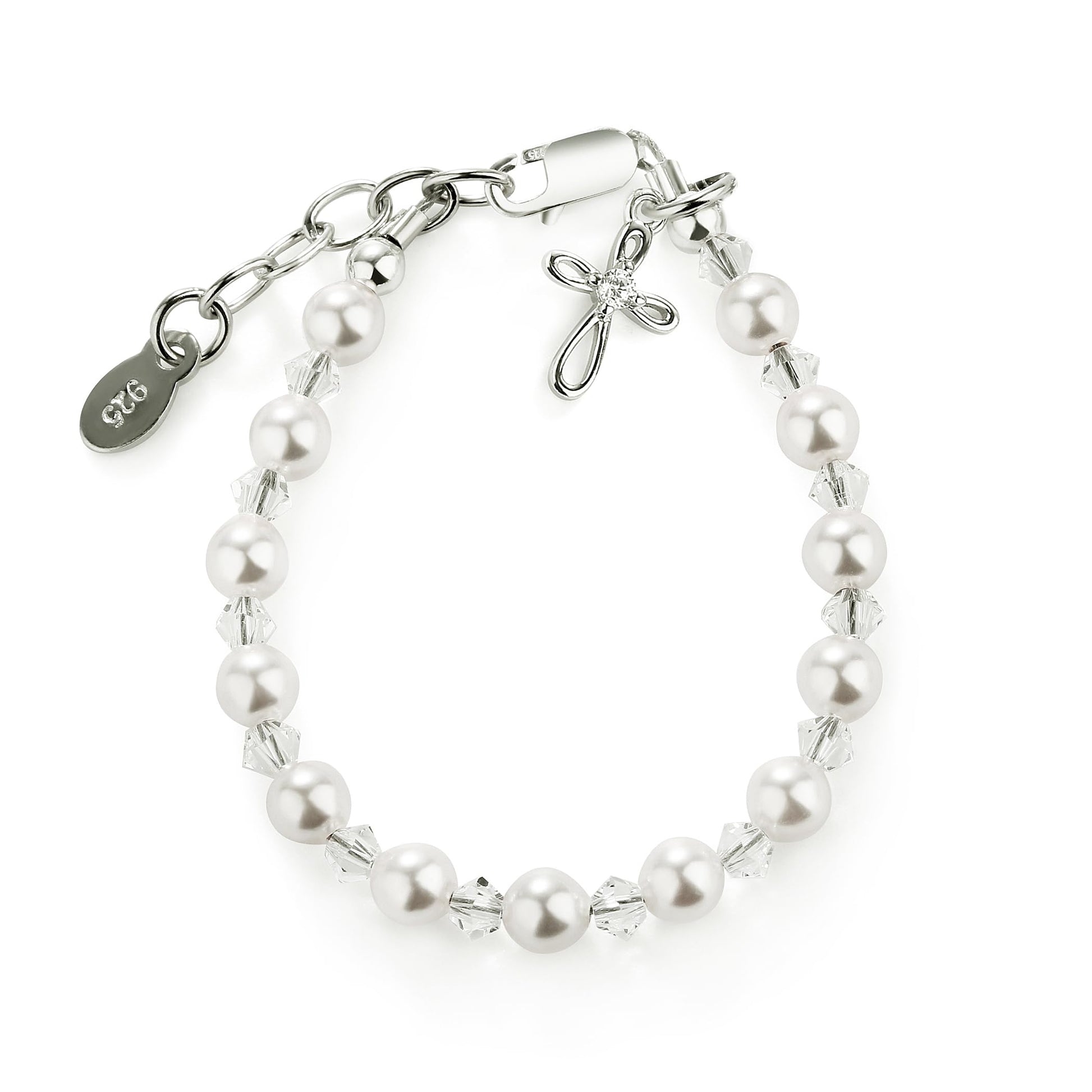 Cherished Moments Sterling Silver Bracelet for Girls with High-End Simulated Pearls and Crystals with a Dainty Infinity Cross Charm