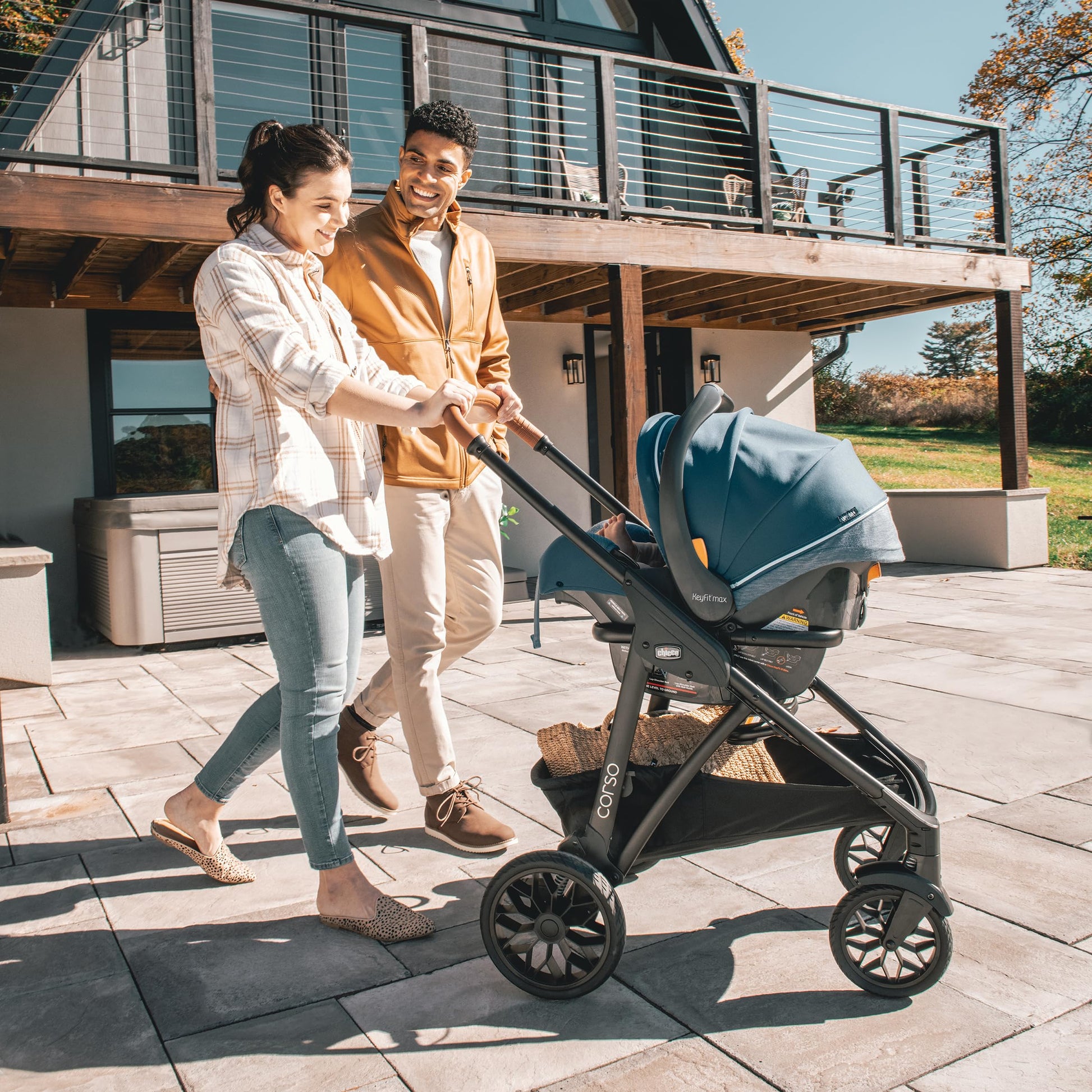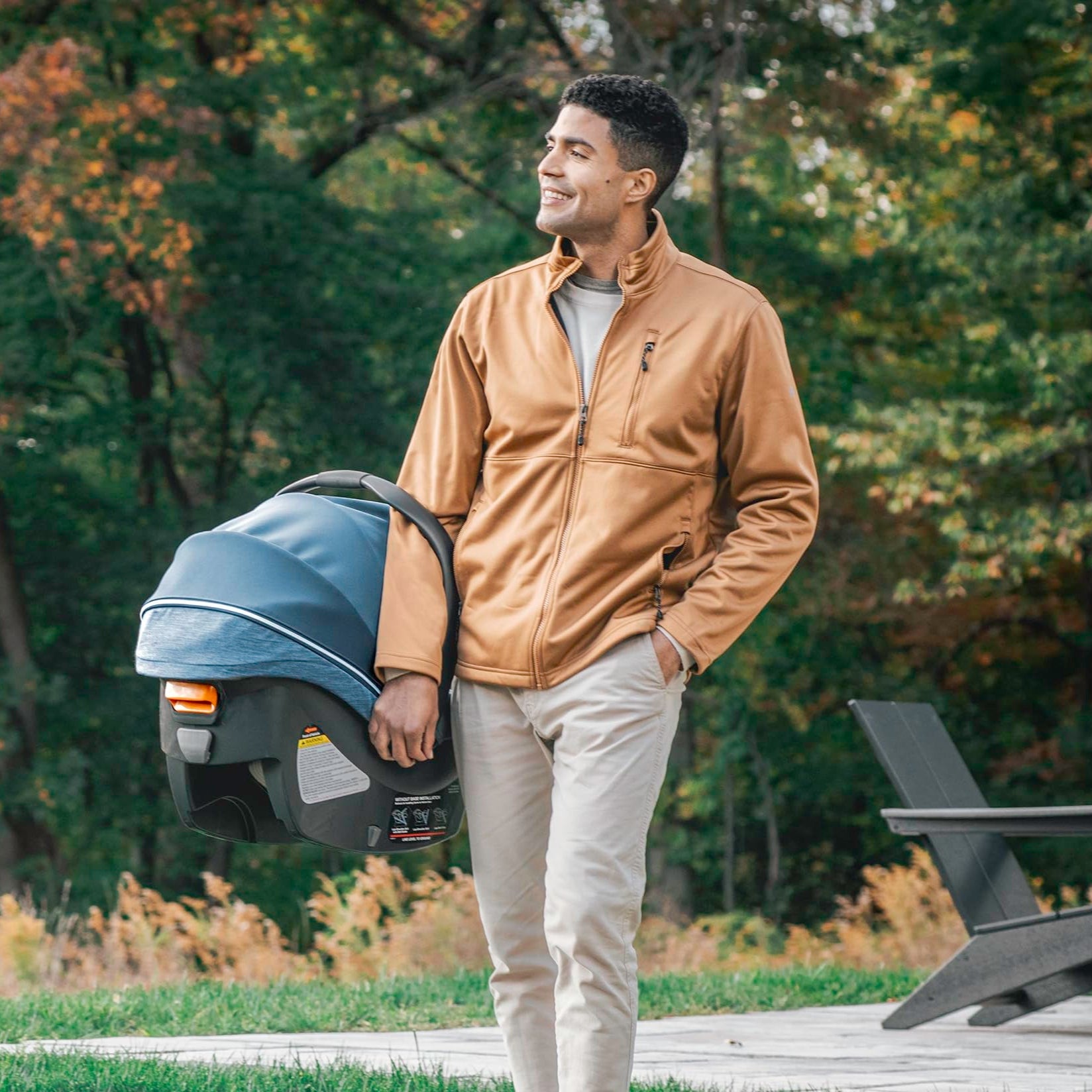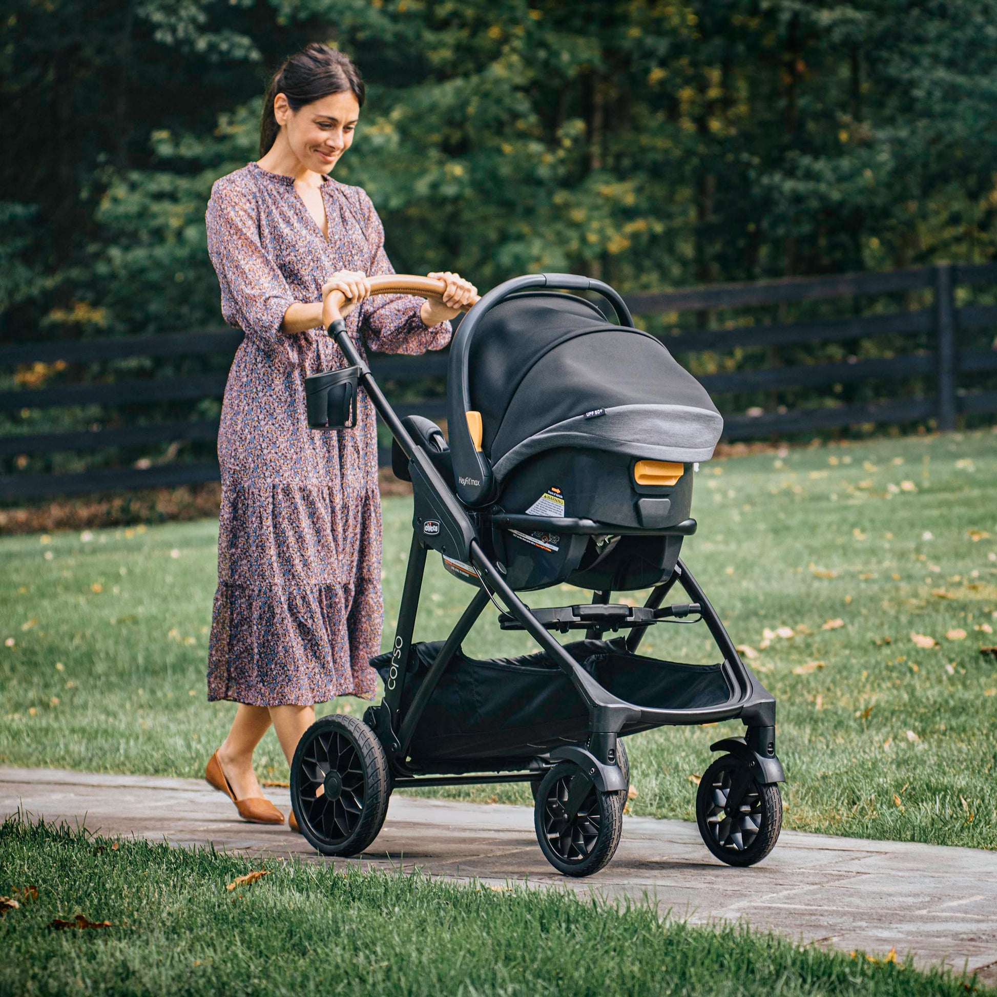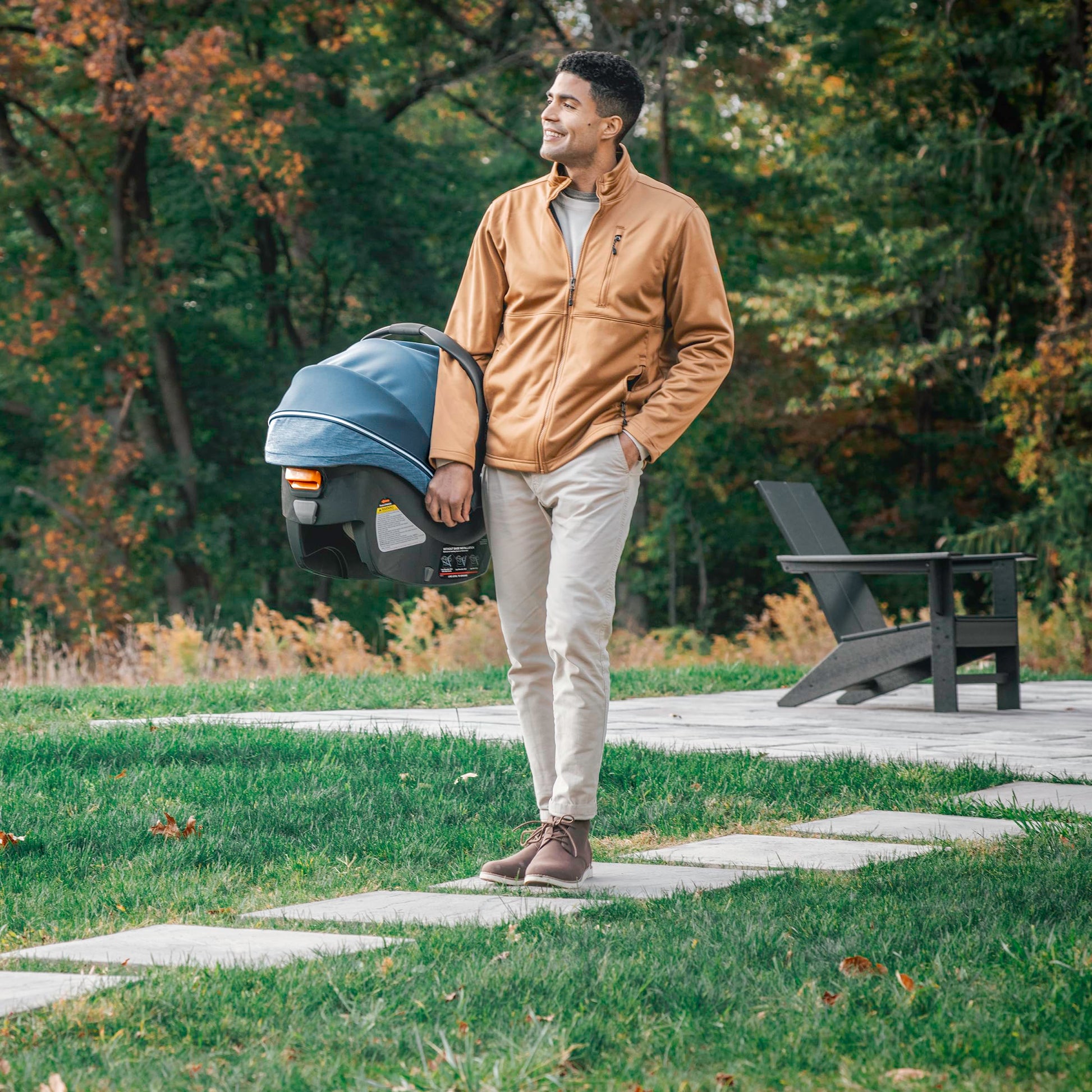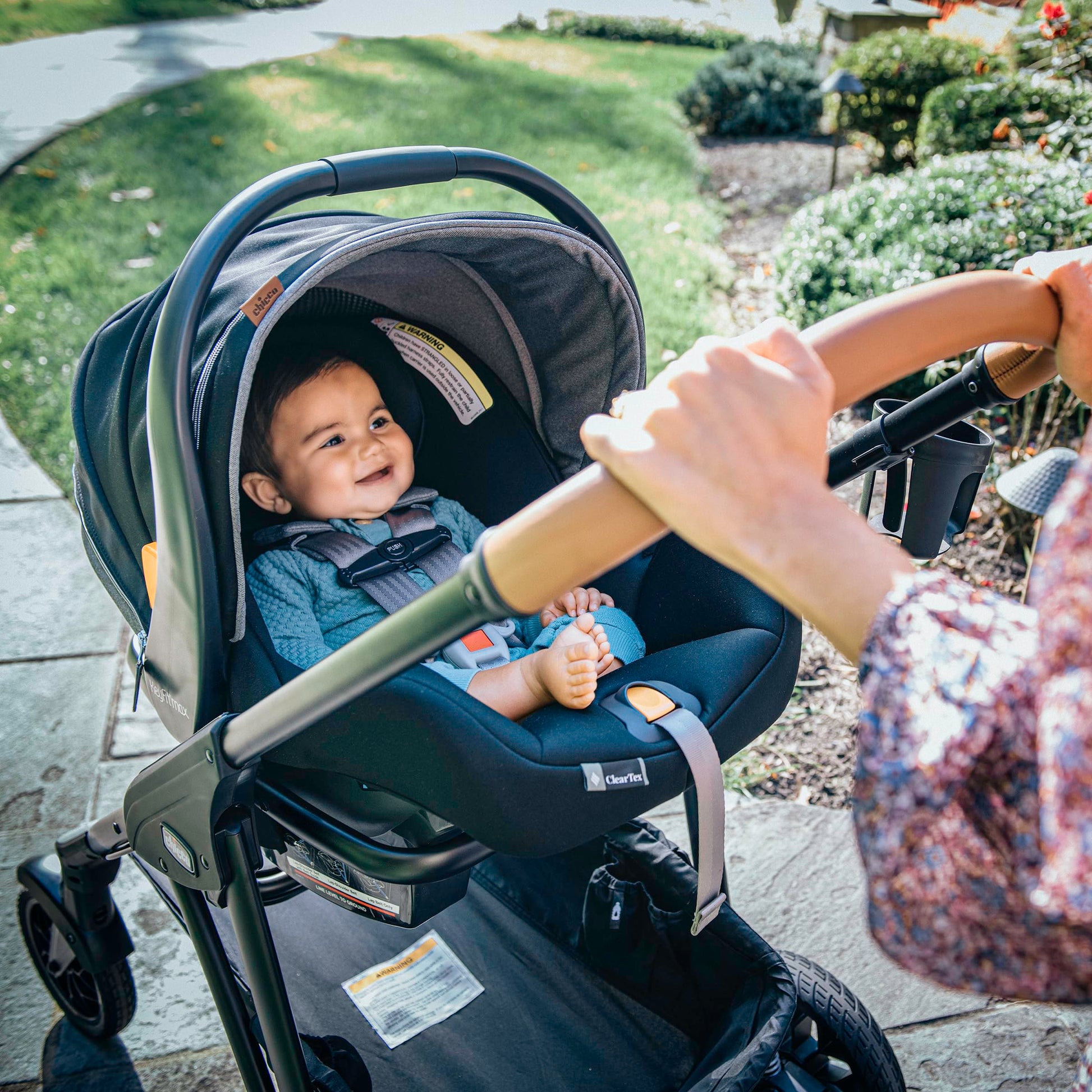 The baby car seat carrier clicks effortlessly into the included stay-in-car base and compatible Chicco strollers creating a convenient car seat and stroller combo.
