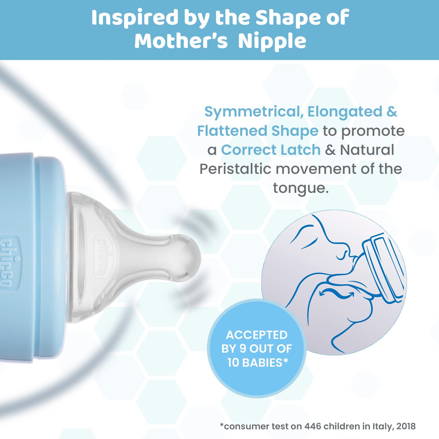 - The shape of the physio teat (nipple) is inspired by the shape of the mother's nipple to let the baby follow his natural sucking pattern.