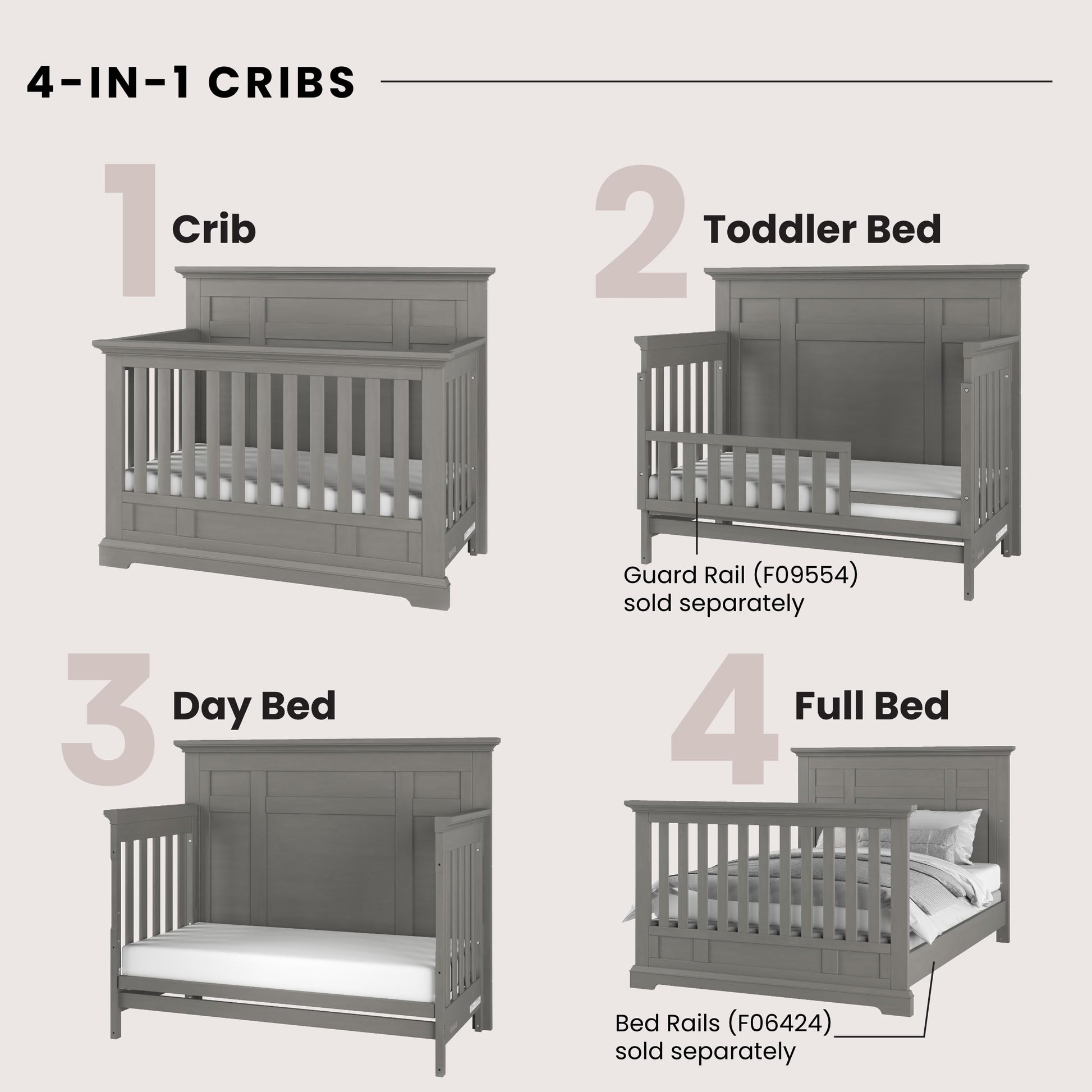 - Grows With Your Baby: 4-in-1 convertible crib fits the growing needs of your child by converting from a crib to a day bed, toddler bed and full-size bed with the addition of toddler guard rail (F09554) and bed rails (F06434), sold separately.