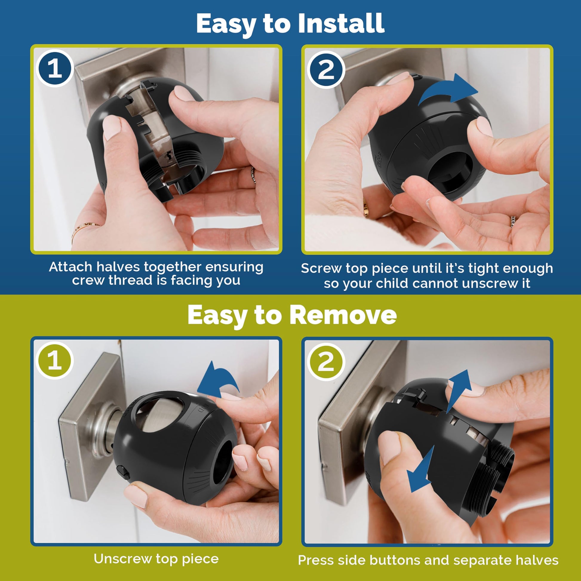 This pack of 4 doorknob covers helps prevent wandering toddlers from getting locked in or out of rooms. Designed to be difficult to remove by tiny hands, these babyproofing door covers can be installed in under 5 minutes.