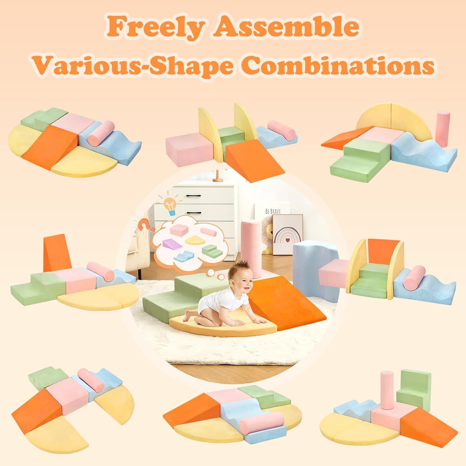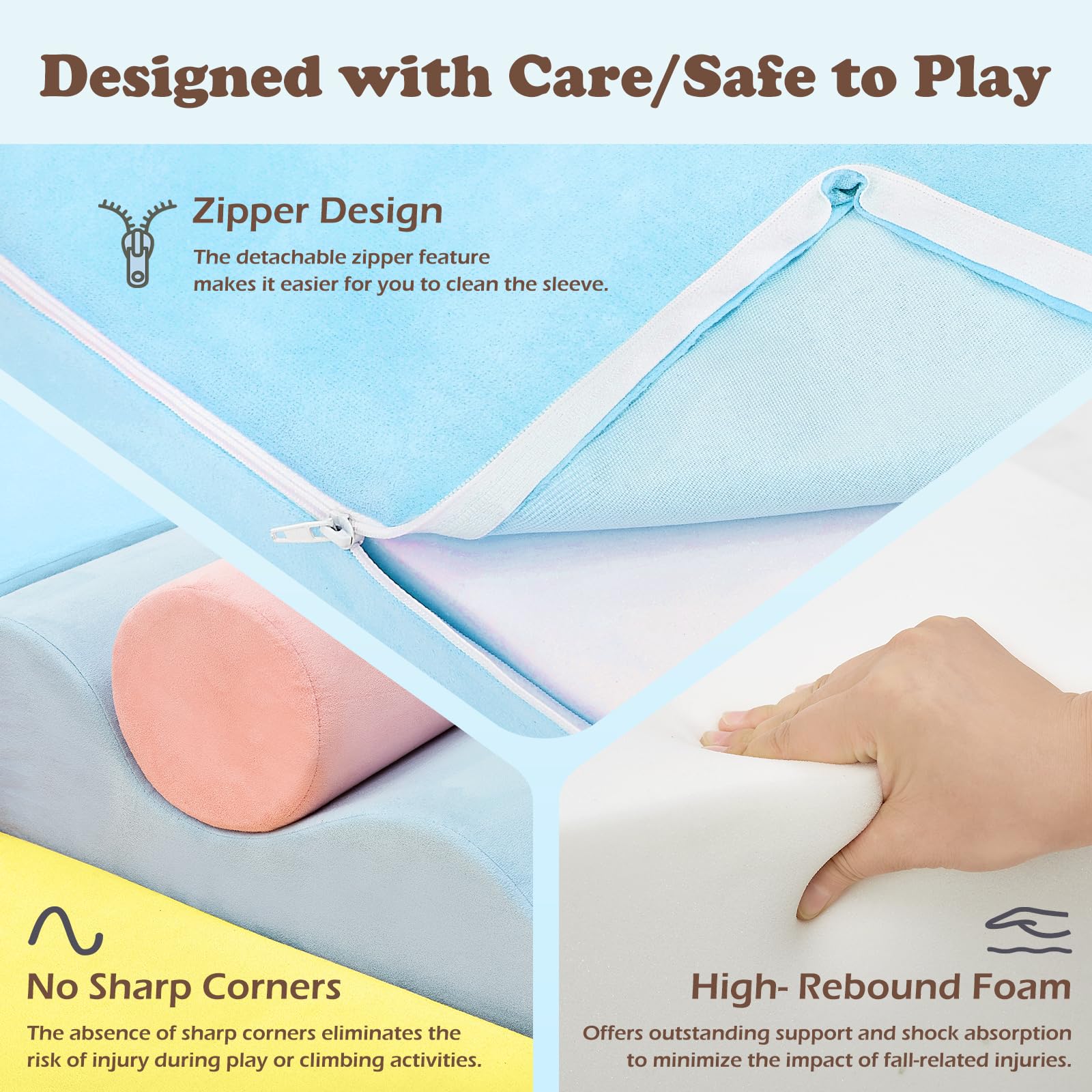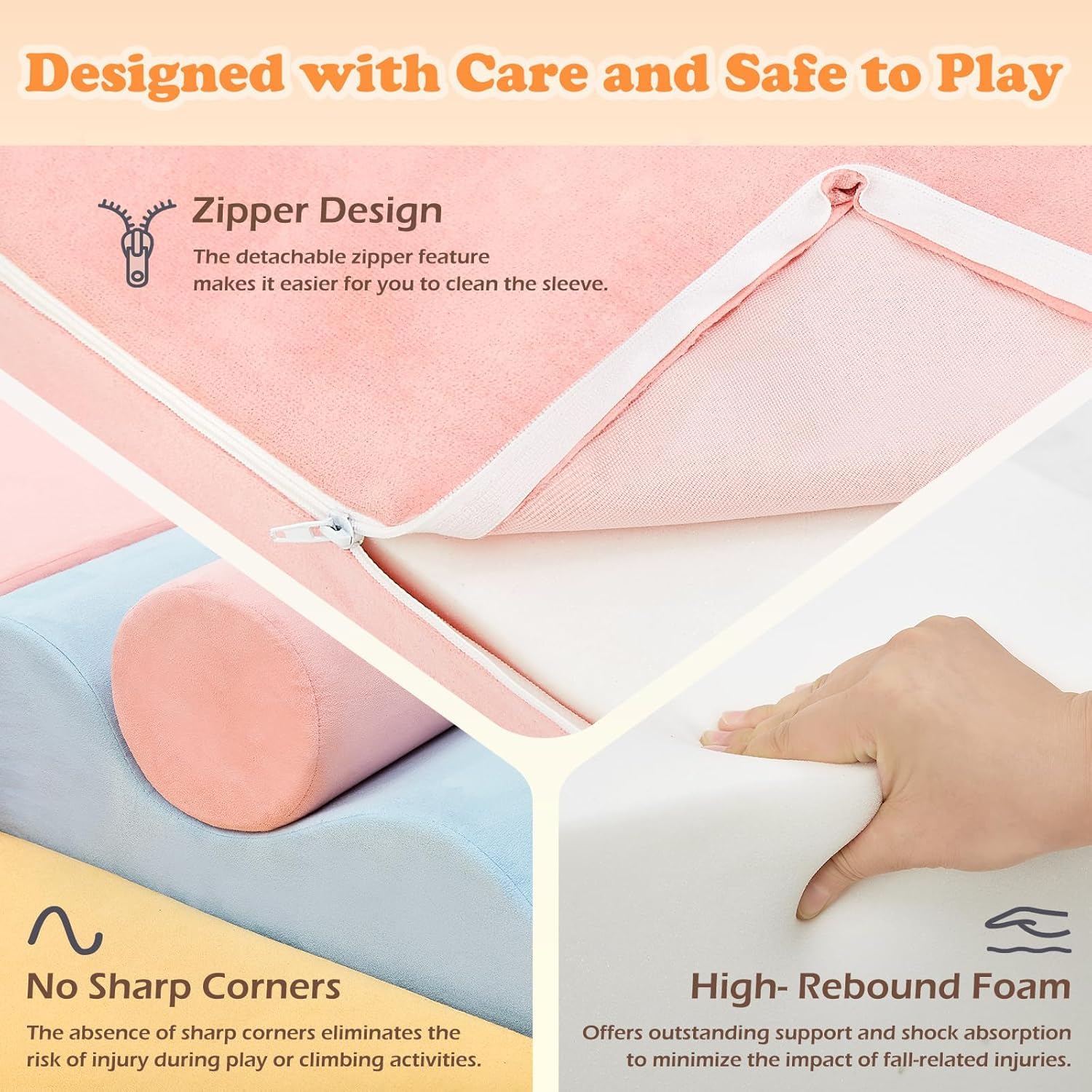 - 7 Pieces Climbing Blocks : Our toddler climbing blocks are designed with different shapes and colors. Your kids can combine these blocks as they wish. Made from non-toxic, odorless fabric with hidden zippers to prevent scratching, these blocks offer a reassuring environment for children to play in. Engineered without harsh edges or solid structures, these foam blocks safeguard little ones from accidents, allowing them to play, toddle, and roll freely