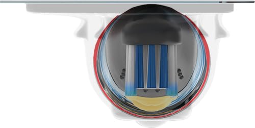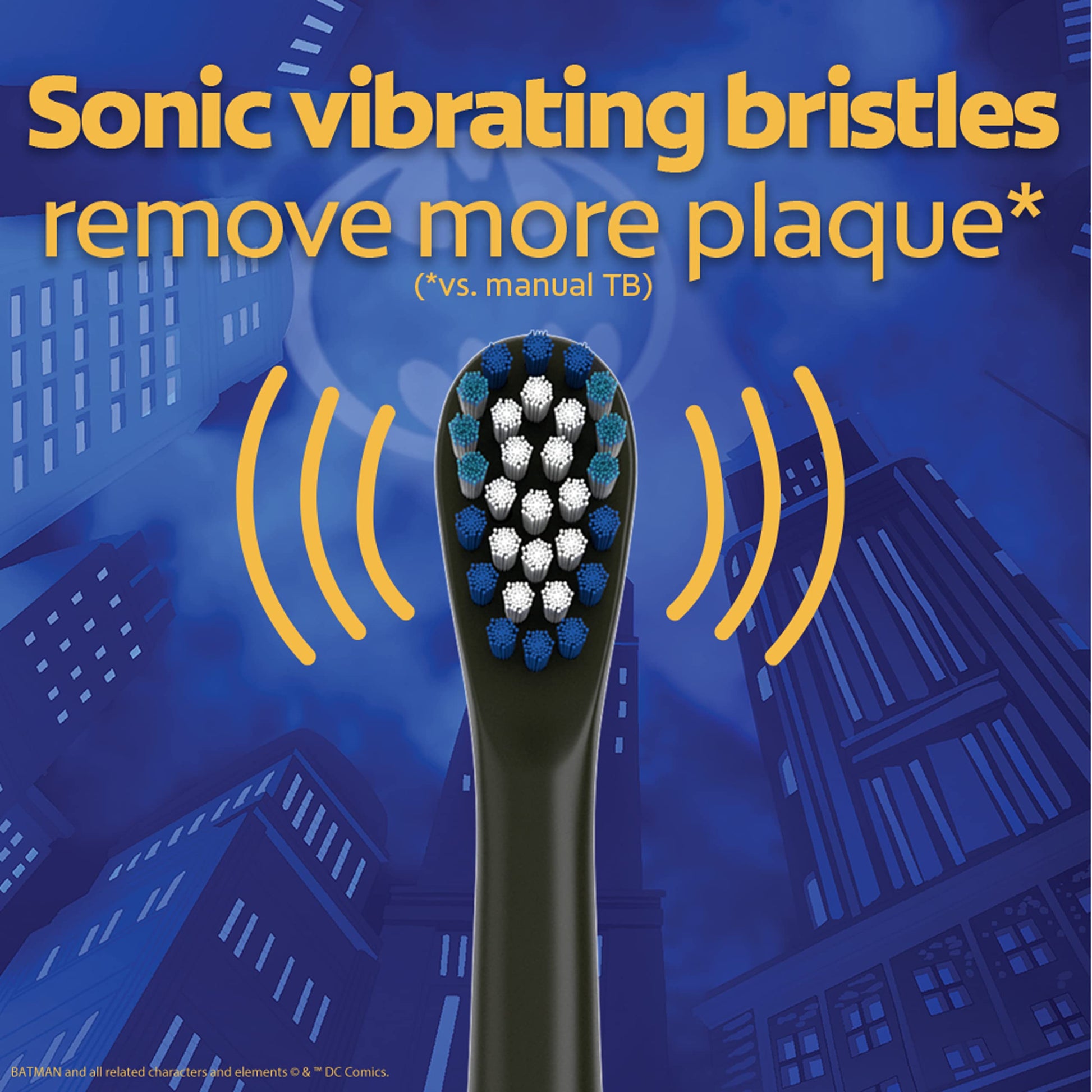 - A small, vibrating brush head with extra soft bristles cleans teeth and sweeps away plaque