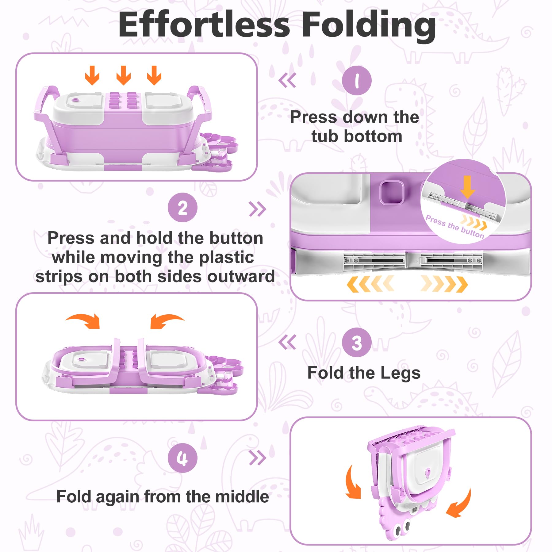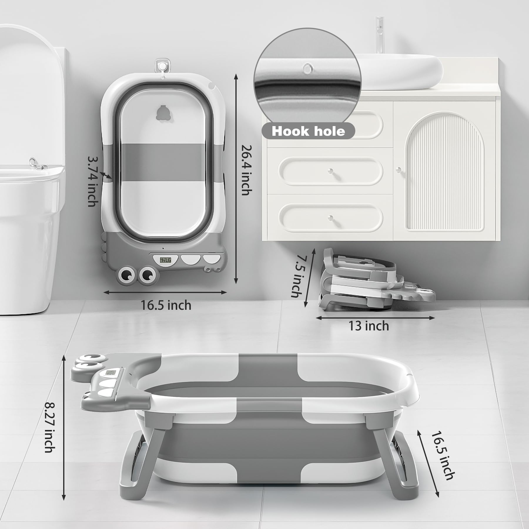- Innovative Double-Fold Design: Our baby bathtub boasts a space-saving double-fold design, measuring under 4 inches in thickness. This allows for easy storage in tight spaces and enhances portability, perfect for both home use and travel. The off-the-floor drain with a user-friendly rubber plug ensures seamless water drainage without the need for relocation.