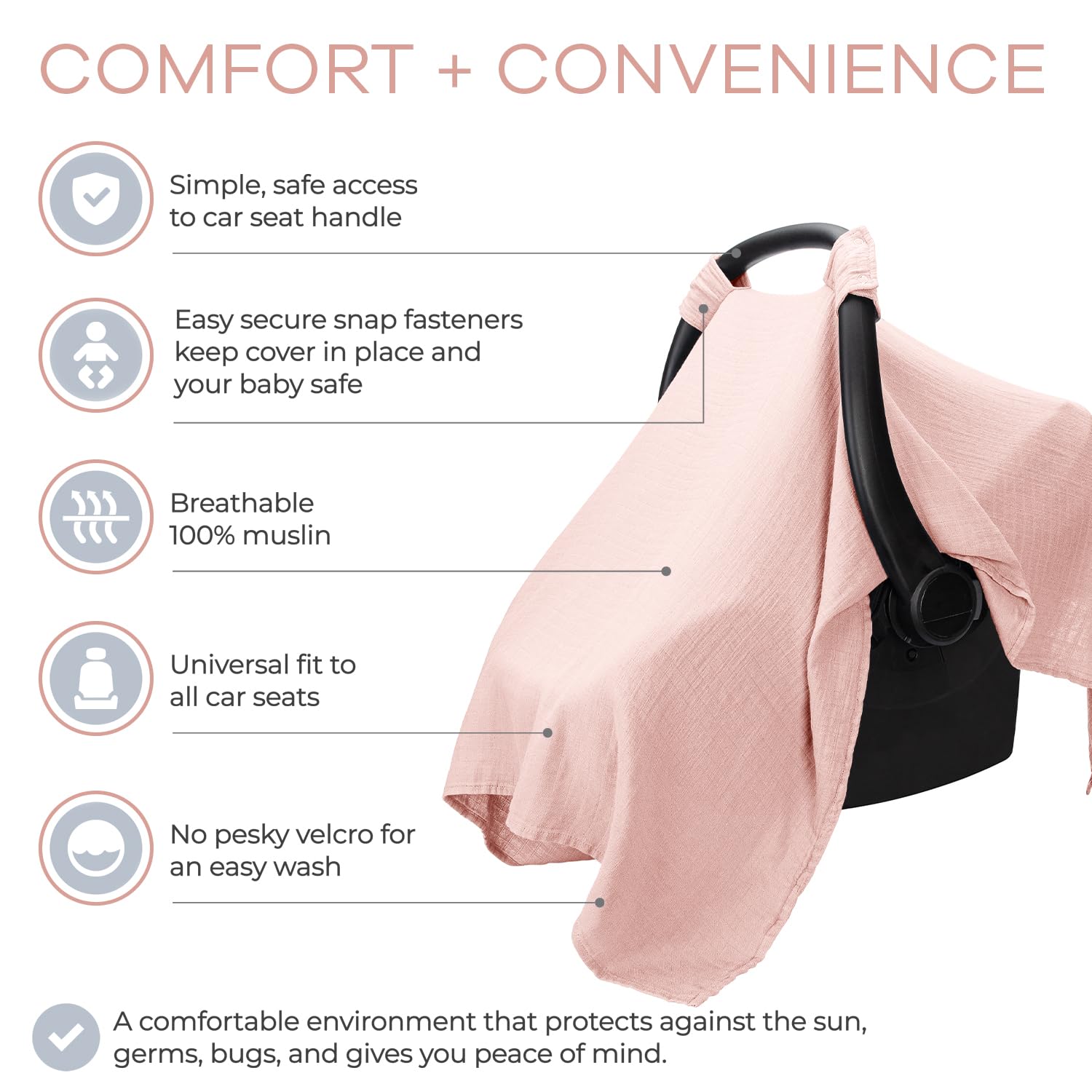 - Soft & Breathable Car Seat Cover: Crafted from 70% rayon and 30% muslin cotton, this baby seat cover creates a gentle, comfortable environment for your infant, even on the hottest days.