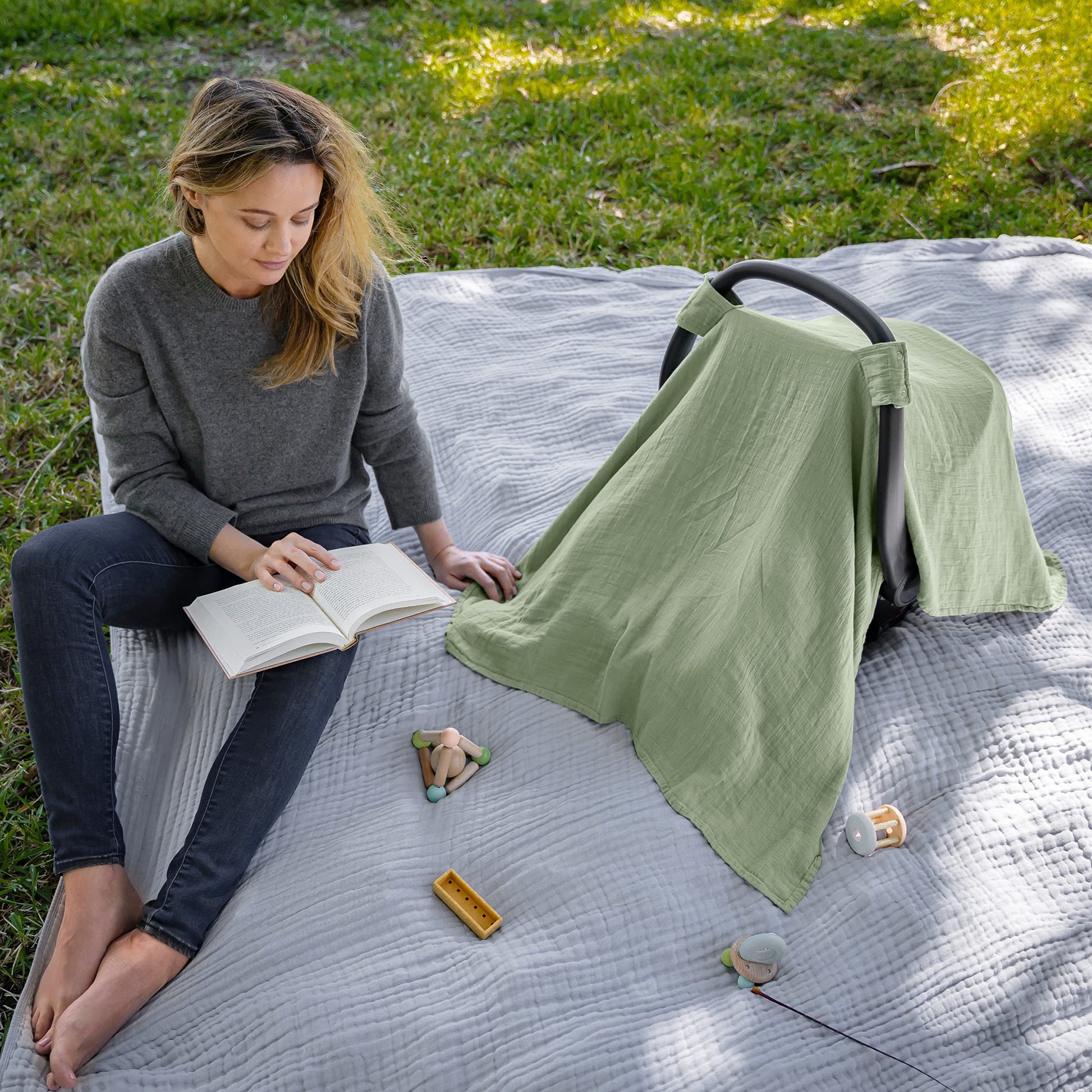 Comfy Cubs Baby Car Seat Cover - Soft, Breathable Bamboo Rayon and Muslin Cotton Blend - Lightweight Canopy for Sun, Bug, and Comfort Protection - Large Size Infant Seat Cover in Sage Design