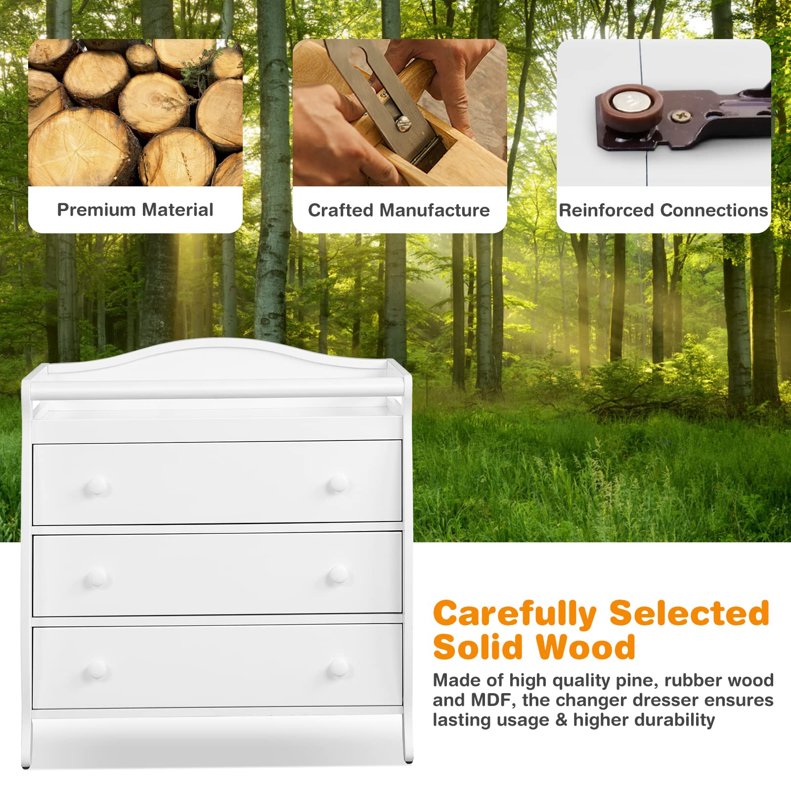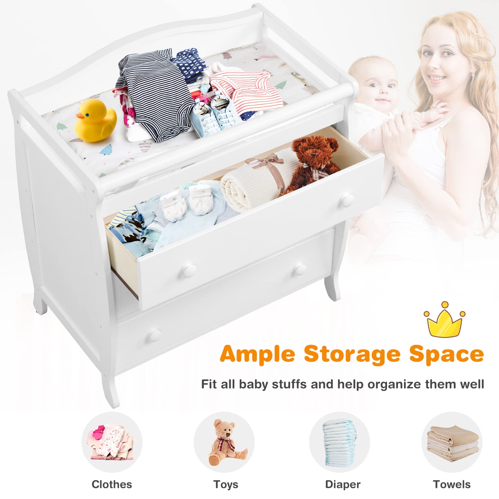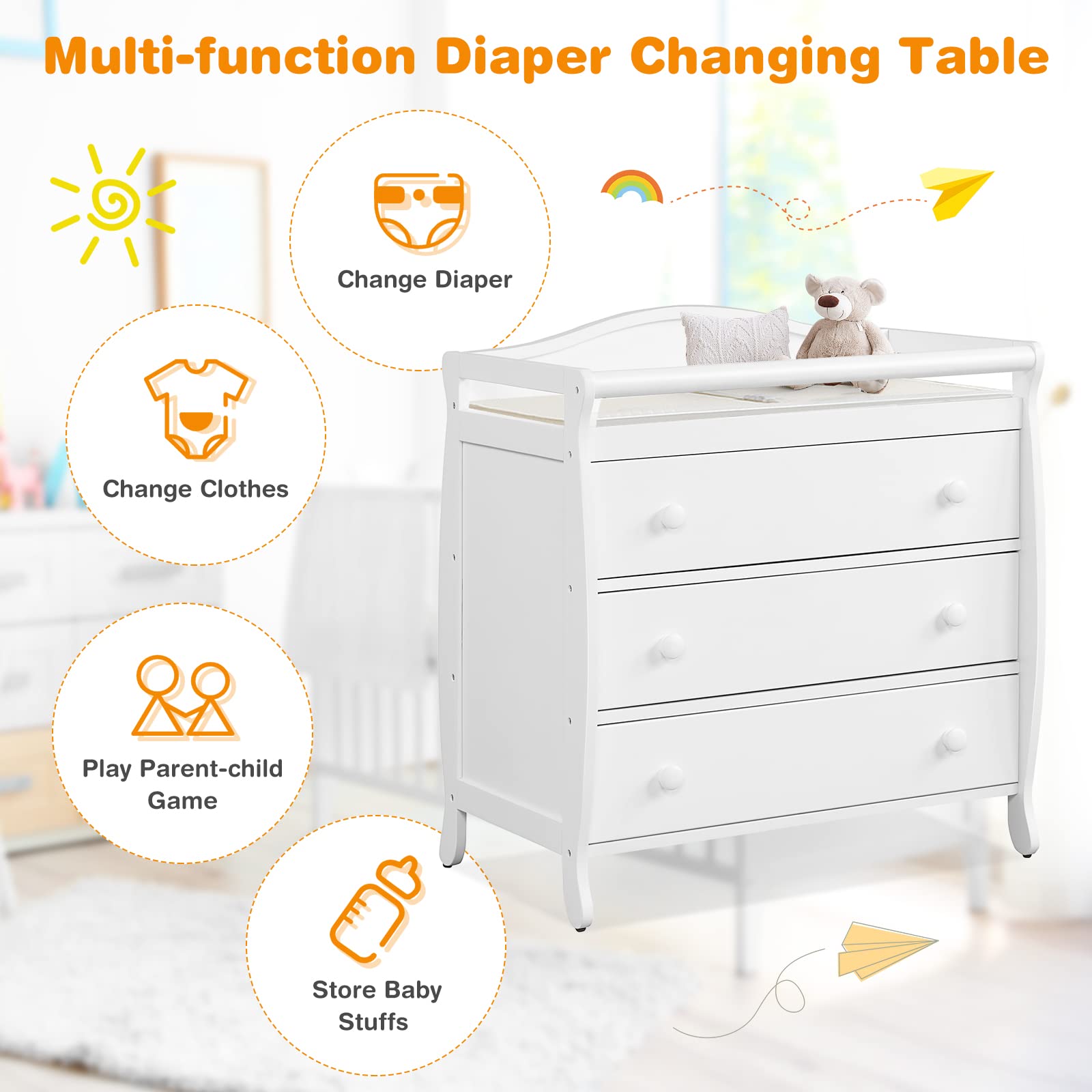- Multi-function Changing Table: Parents will find it convenient to change clothes and diapers for their little ones on the changing top. Meanwhile, three large drawers provide you with sufficient space to store a variety of baby products and keep them clean, tidy and away from dust.