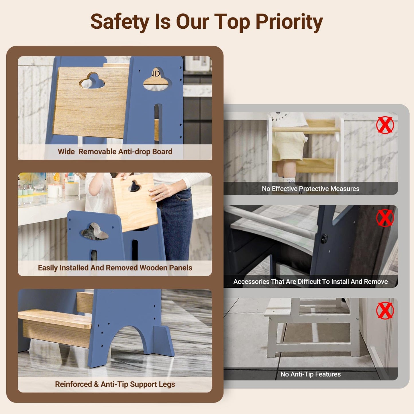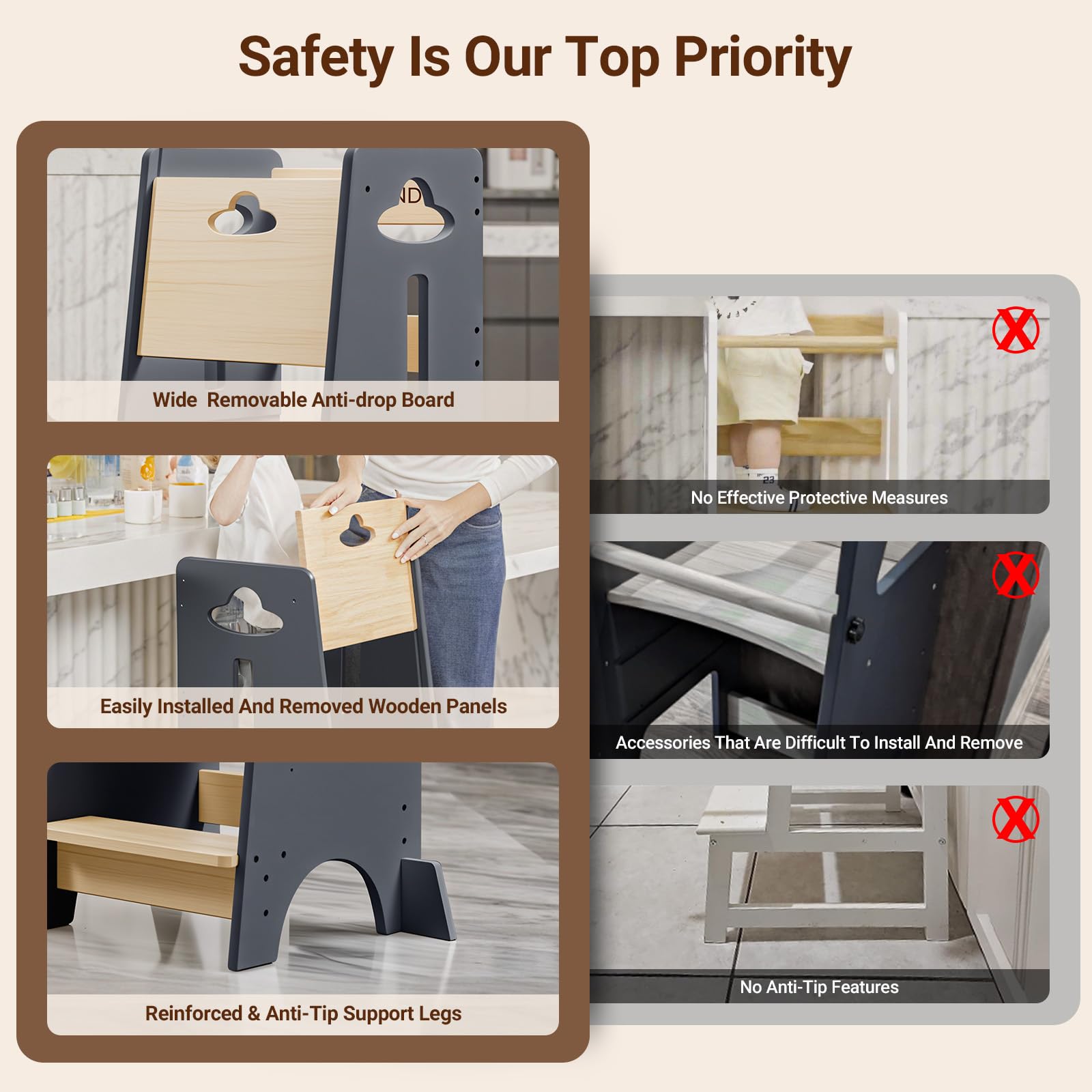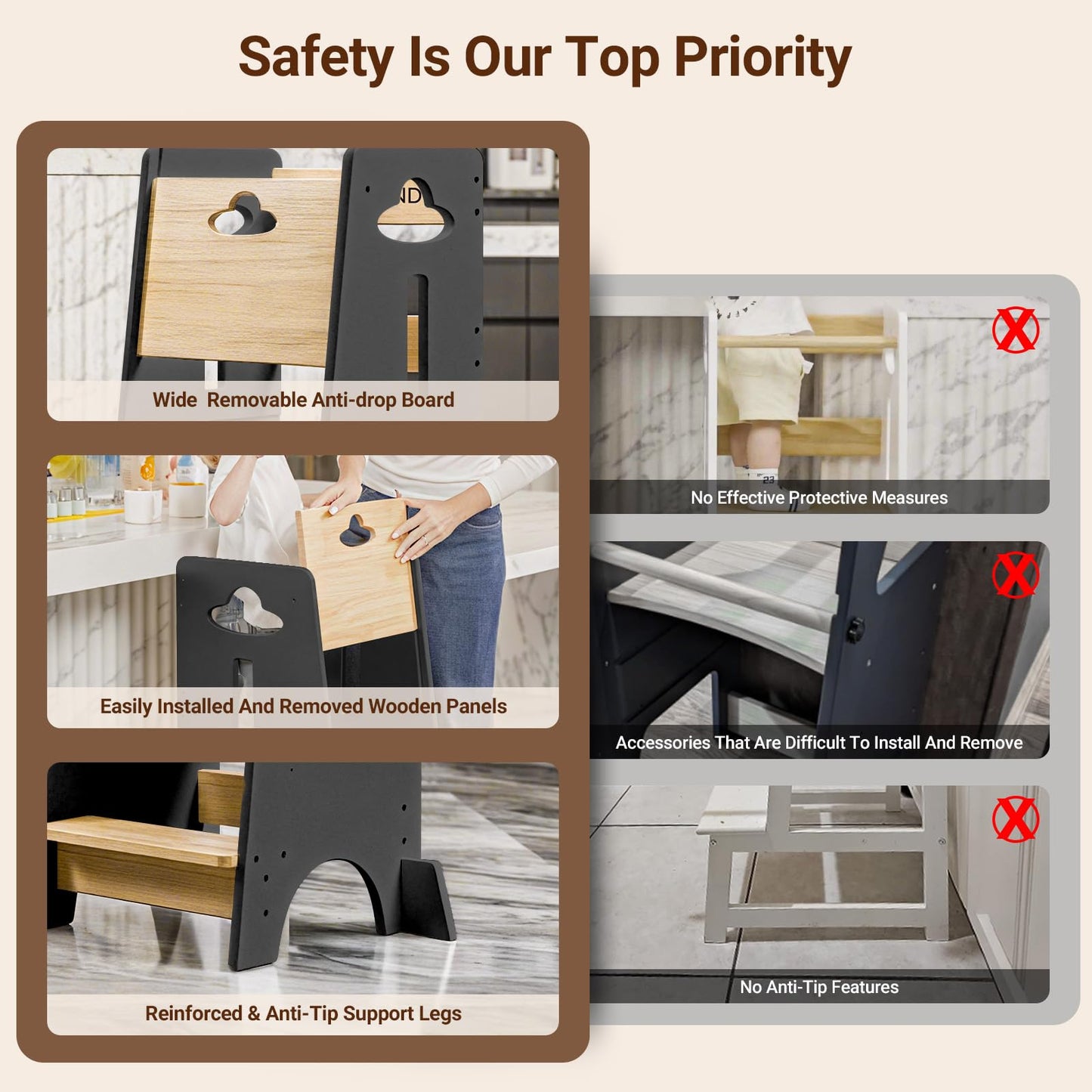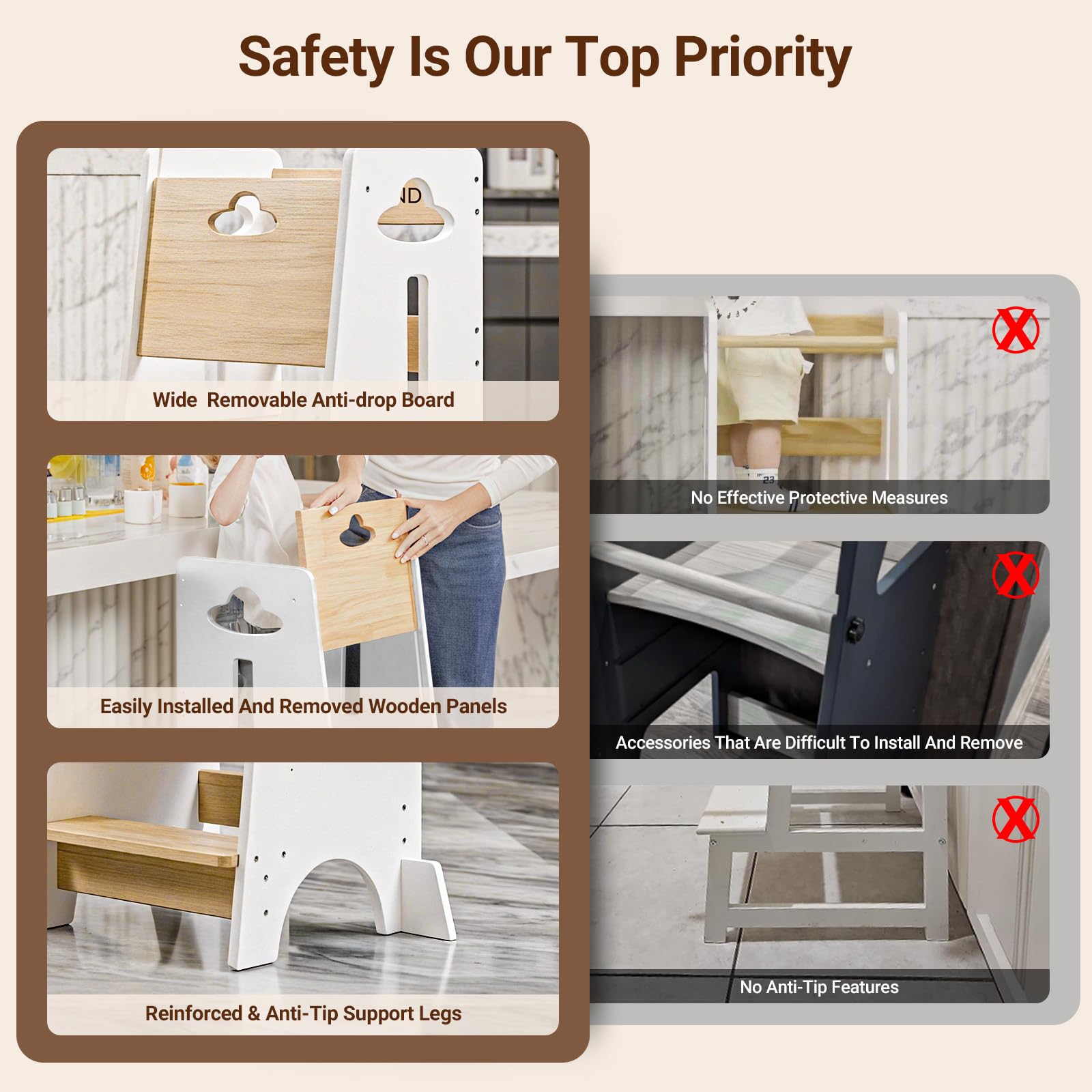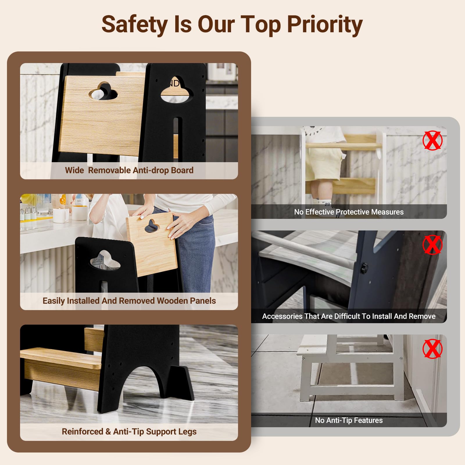 - Wide Anti-Drop Board: Designed for safety, this learning stool features a spacious, removable anti-drop board that ensures your child will never have to worry about falling. Easy to install and remove, it allows kids aged 3 and up to use it independently, giving parents peace of mind while their little ones explore and learn in the kitchen.