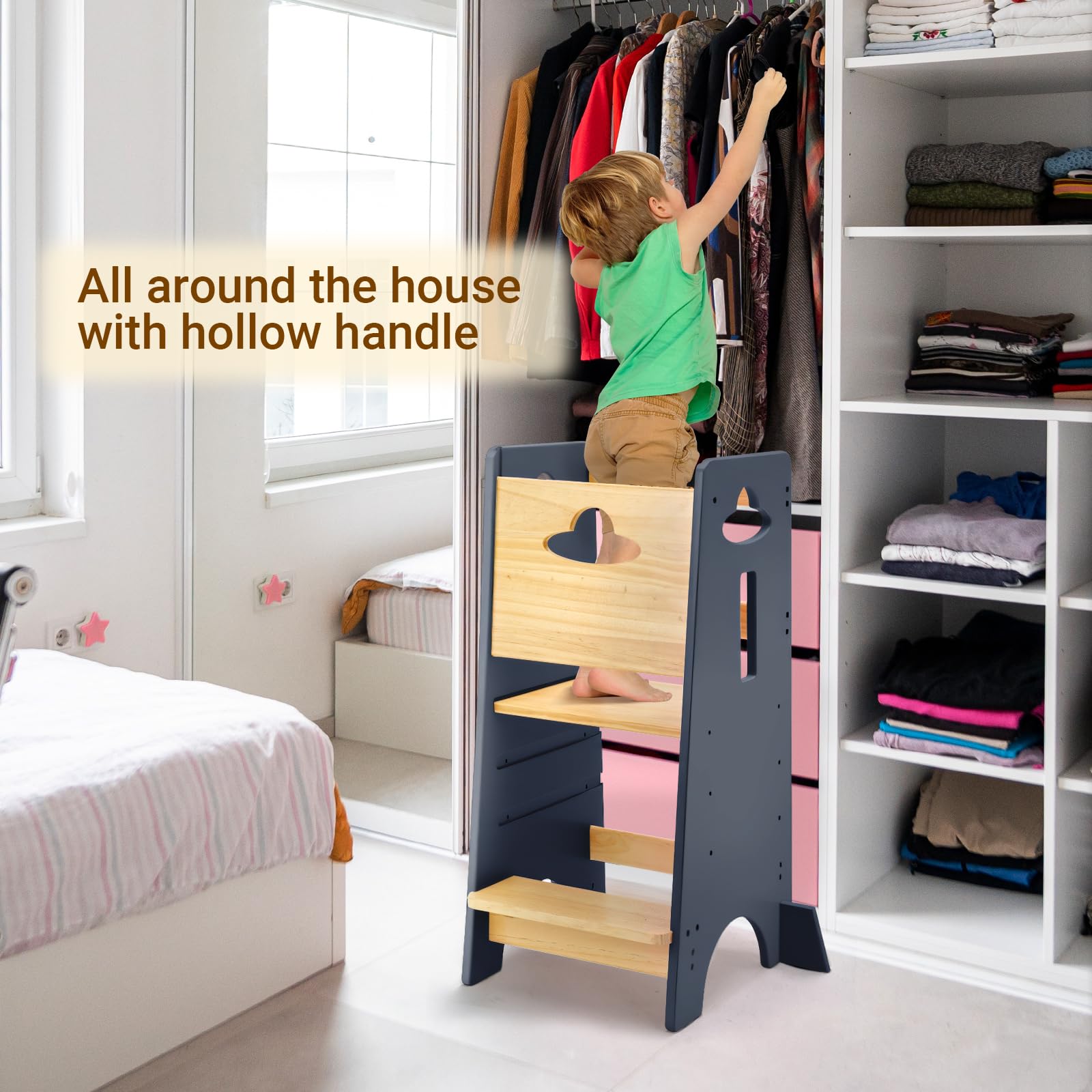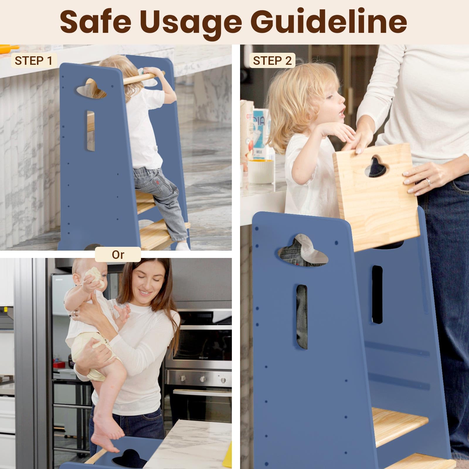 COSYLAND Toddler Standing Tower Adjustable Height - Super Stable Kids Kitchen Stool Helper - 3 Levels Adjustable Wooden Toddler Kitchen Stool (Natural & Navy Blue)